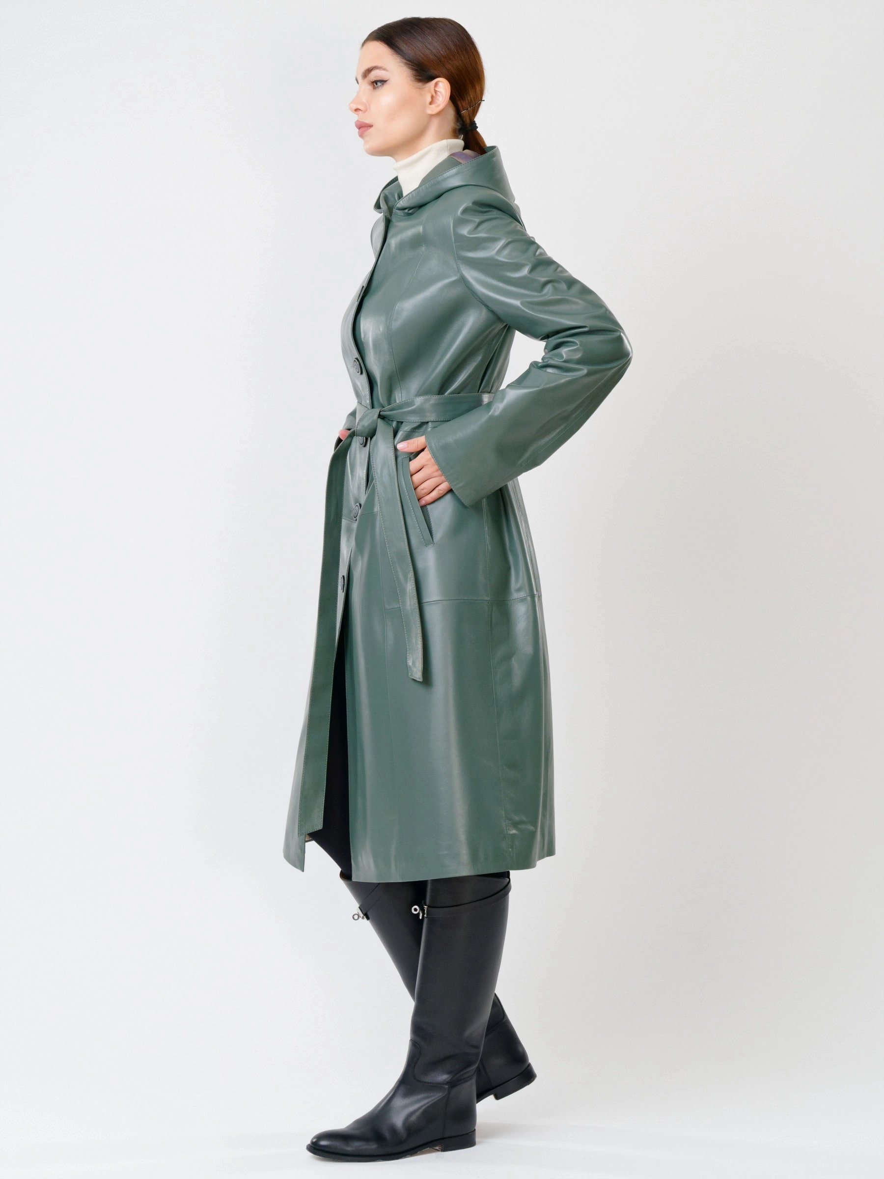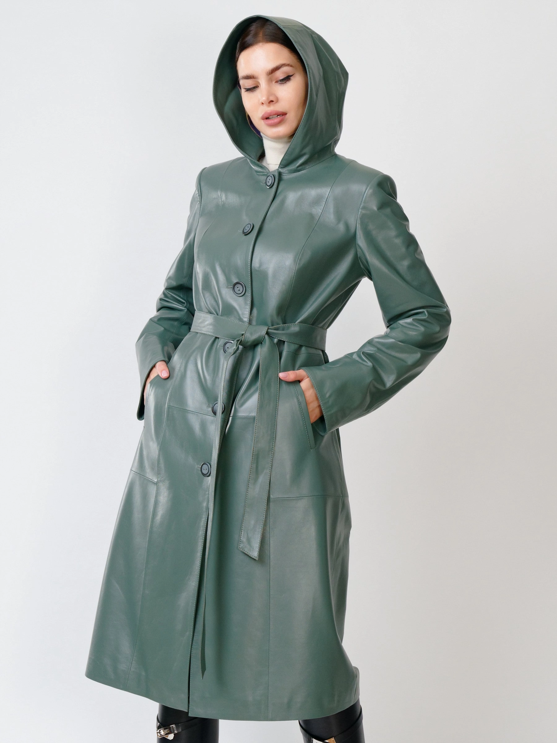 Кожаный женский утепленный плащ с капюшоном 380нш, размер 52, оливковый, артикул 91391