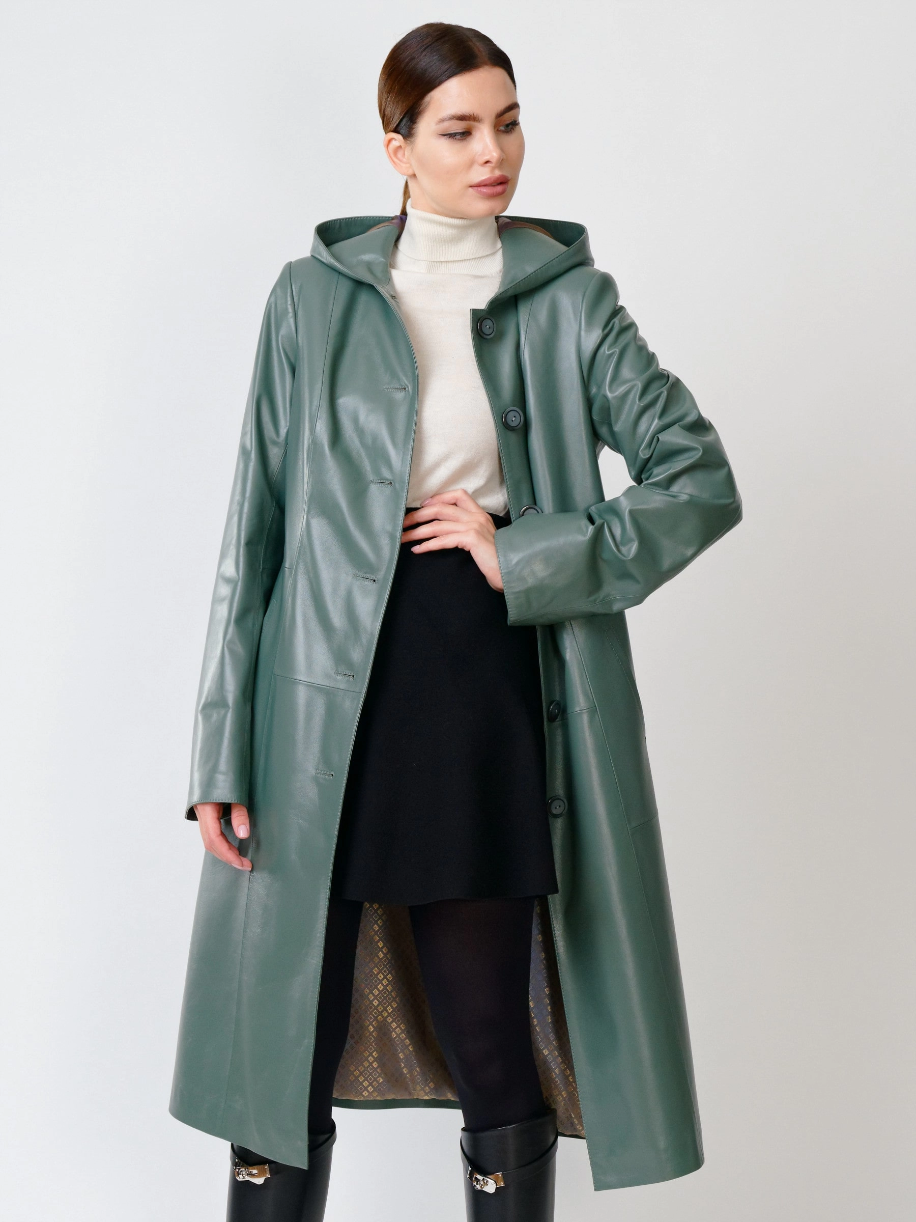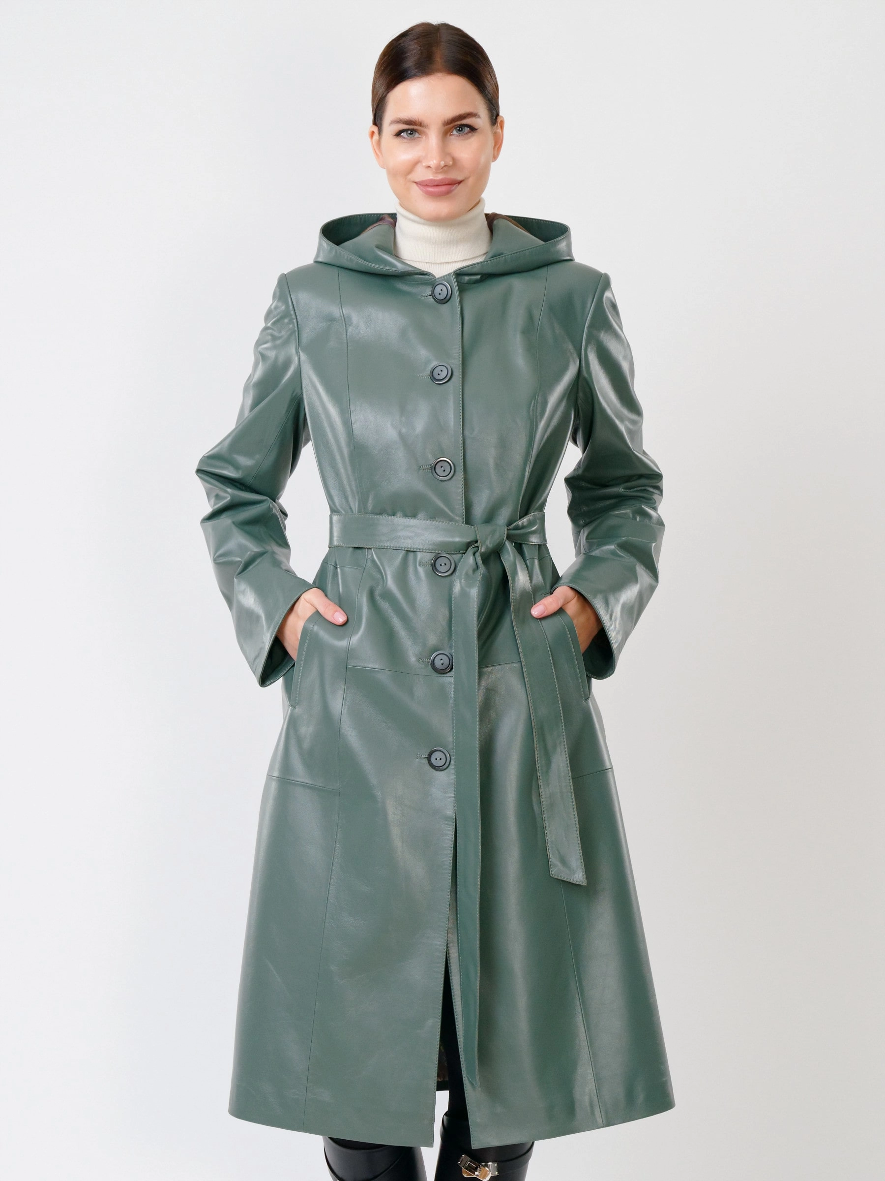 Товар кожаный женский утепленный плащ с капюшоном 380нш, размер 52, оливковый, артикул 91391 выполнен из натуральной кожи с застежкой пуговицы. Рассчитан на сезон: демисезон. Длина изделия 112 см, силуэт полуприлегающий.