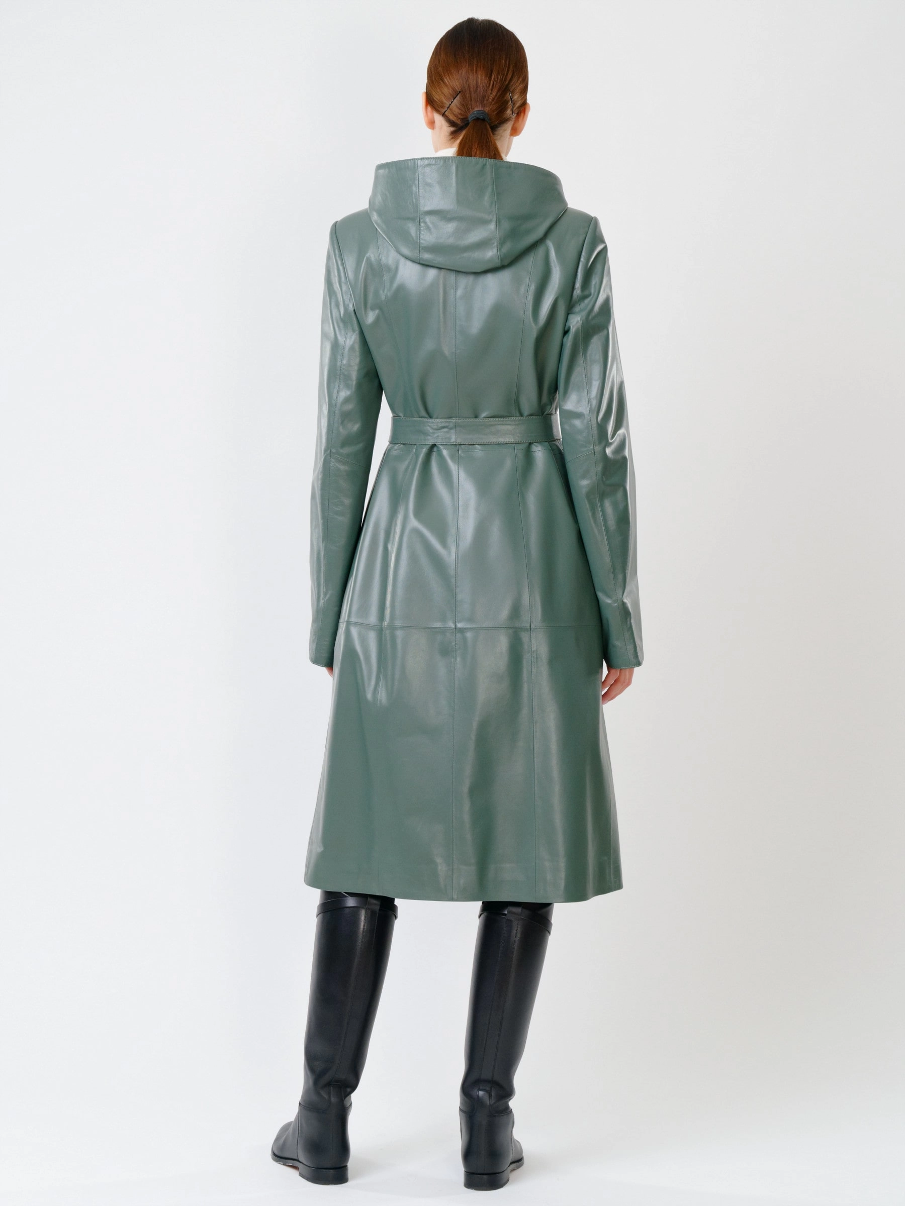 Оливковый длинный утепленный плащ из натуральной кожи на пуговицах: полуприлегающий силуэт с защитным капюшоном, подчеркивающим талию поясом, глубокими карманами и втачными рукавами для повседневной элегантности. Совет стилиста: сочетайте с объемным свитером, скинни или прямыми джинсами и грубыми кожаными ботинками.