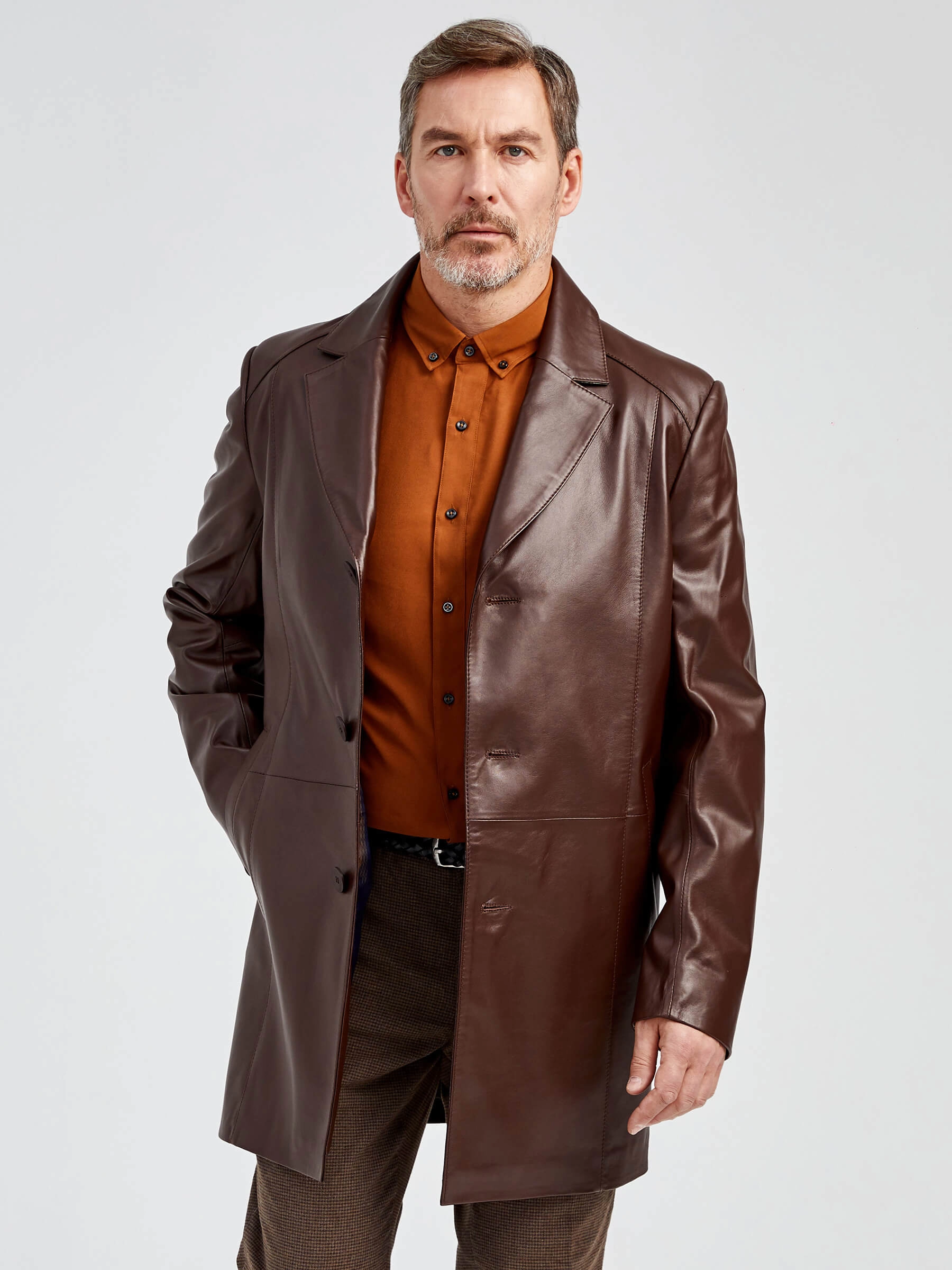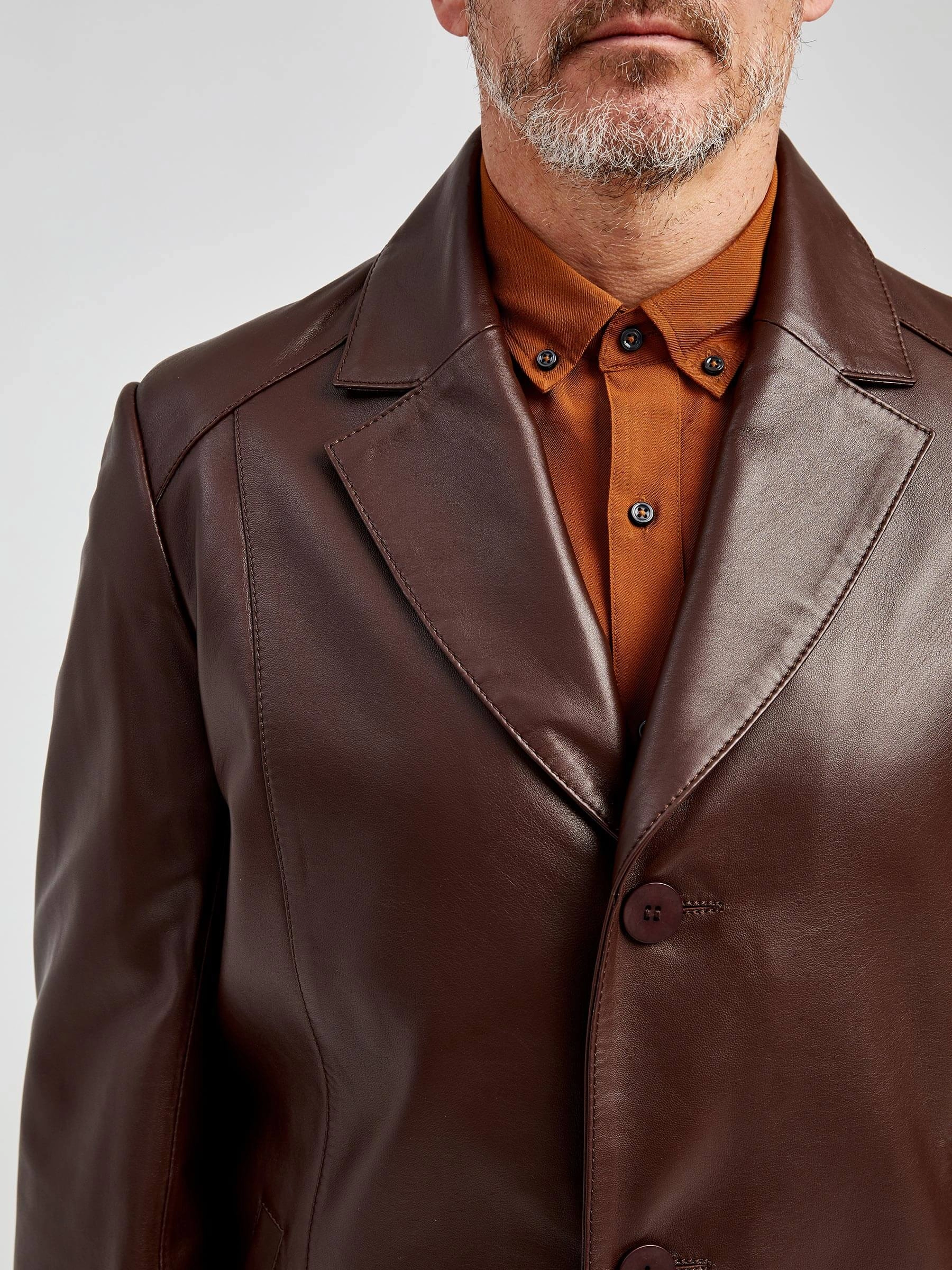 Кожаный мужской френч премиум класса 541, коричневый, размер 48, артикул 40521