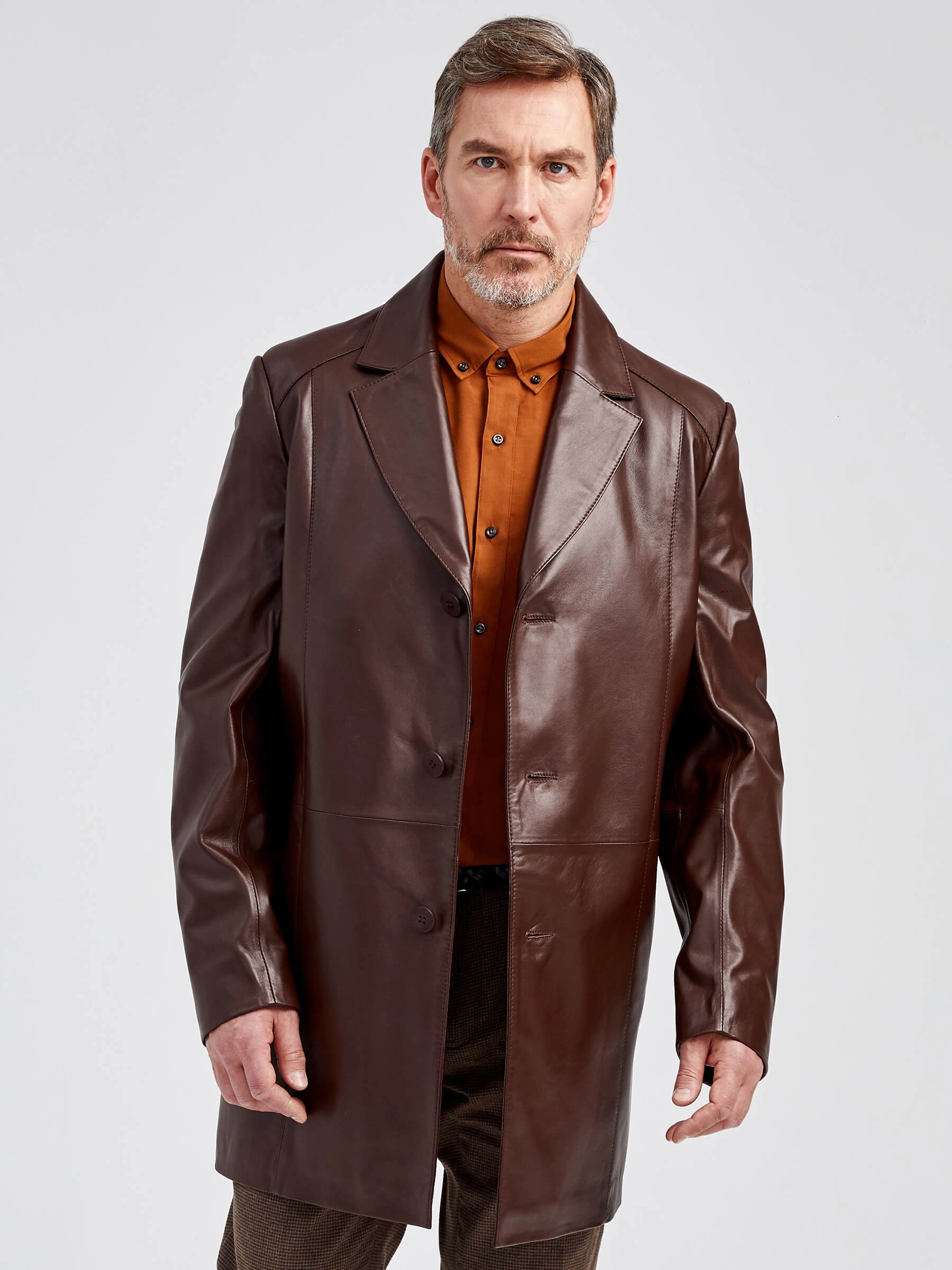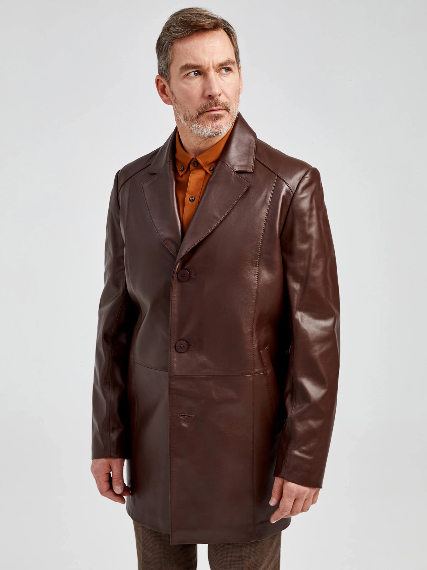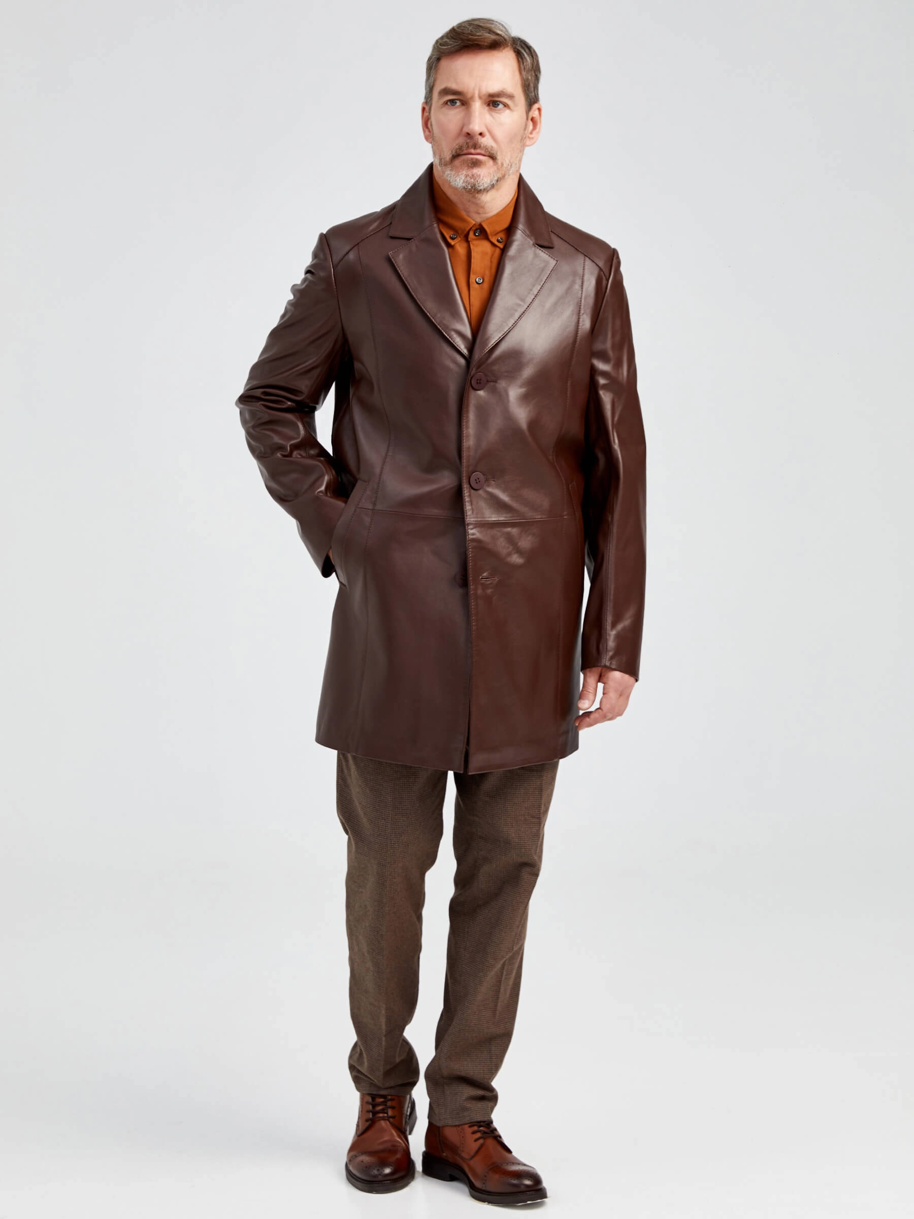 Товар кожаный мужской френч премиум класса 541, коричневый, размер 48, артикул 40521 выполнен из натуральной кожи с застежкой пуговицы. Рассчитан на сезон: демисезон. Длина изделия 90 см, силуэт прямой.