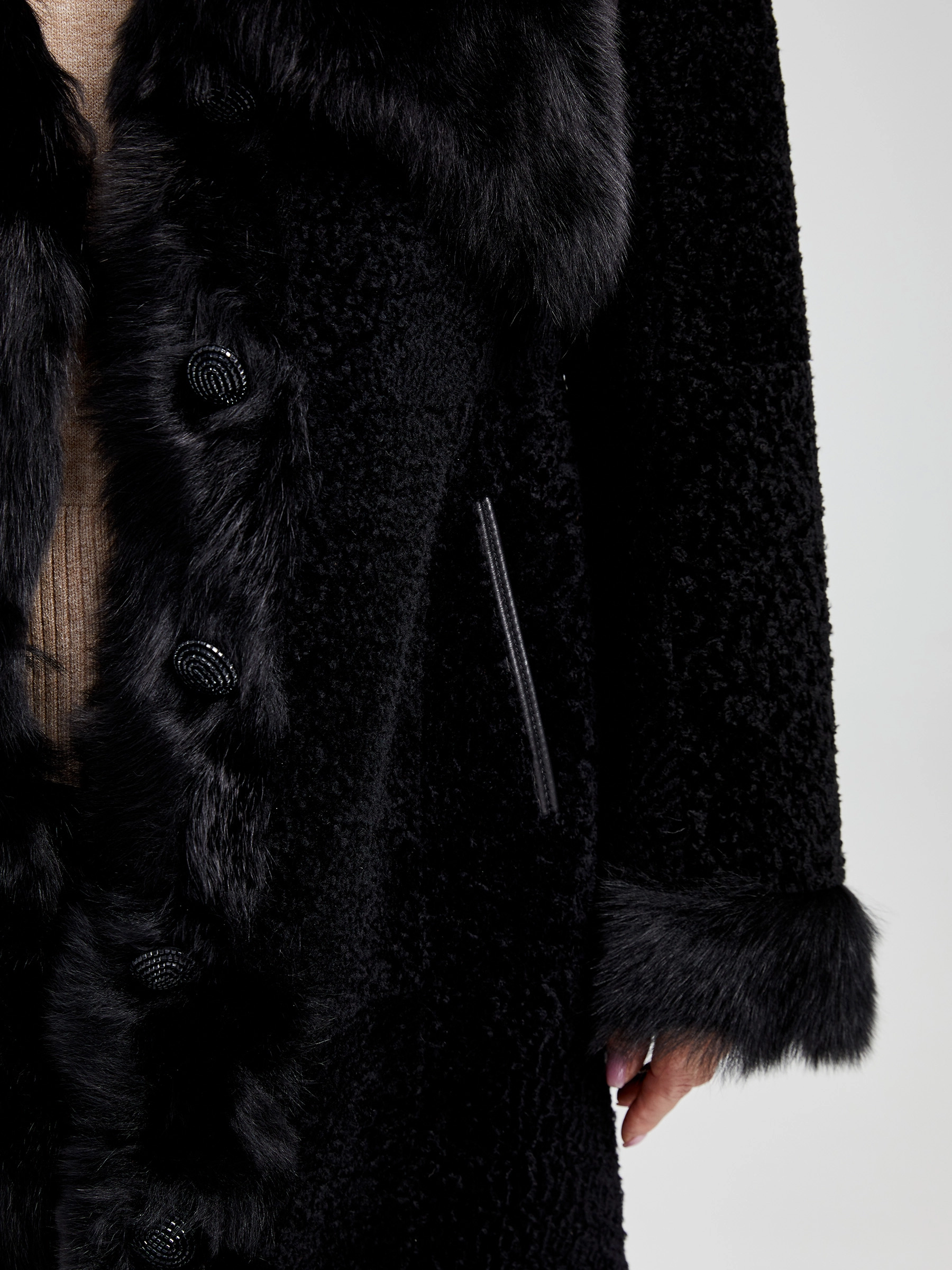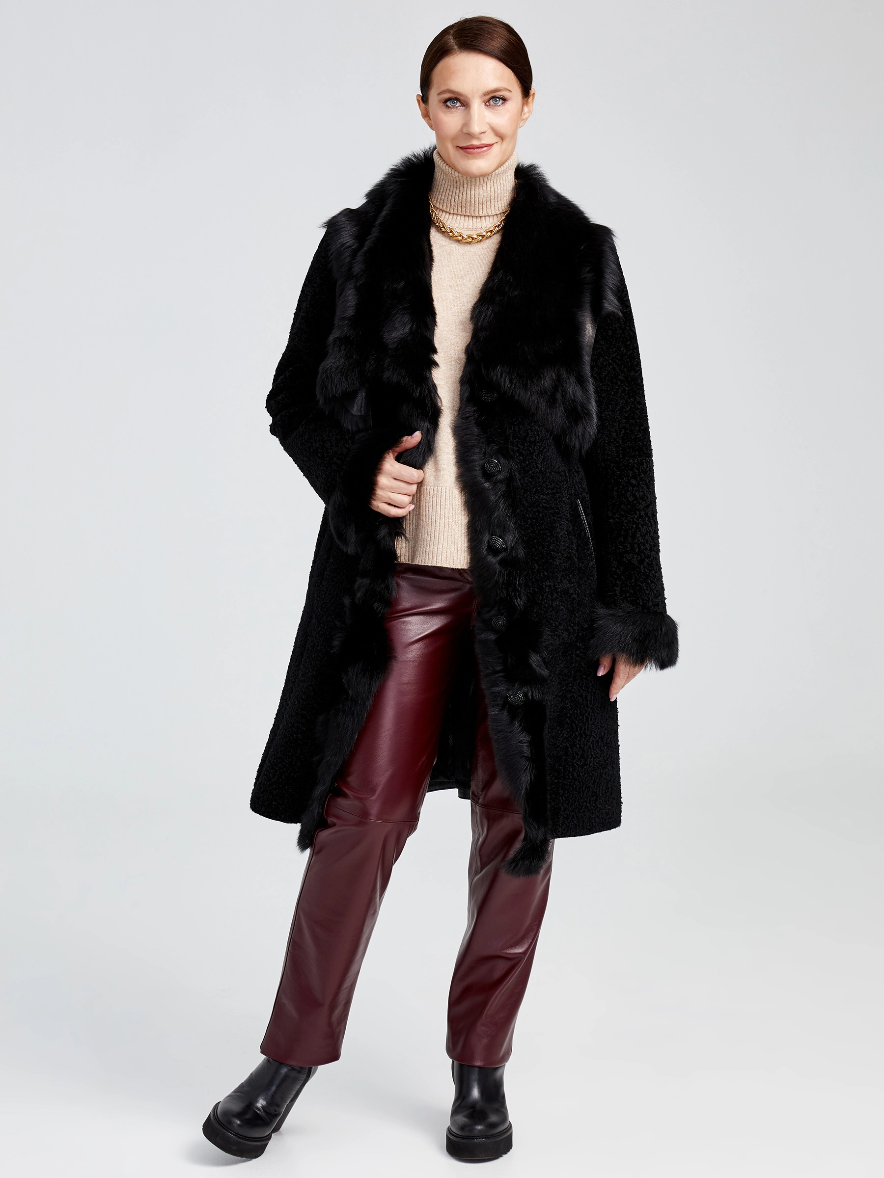 Эффектная дубленка из меха новозеландского ягненка. Нежнейший мех, близкий по восприятию к каракульче. Воротник и отделка – тосканская овчина. Дополнительный современный утеплитель. Кожаный пояс прилагается. Подкладка из вискозы.