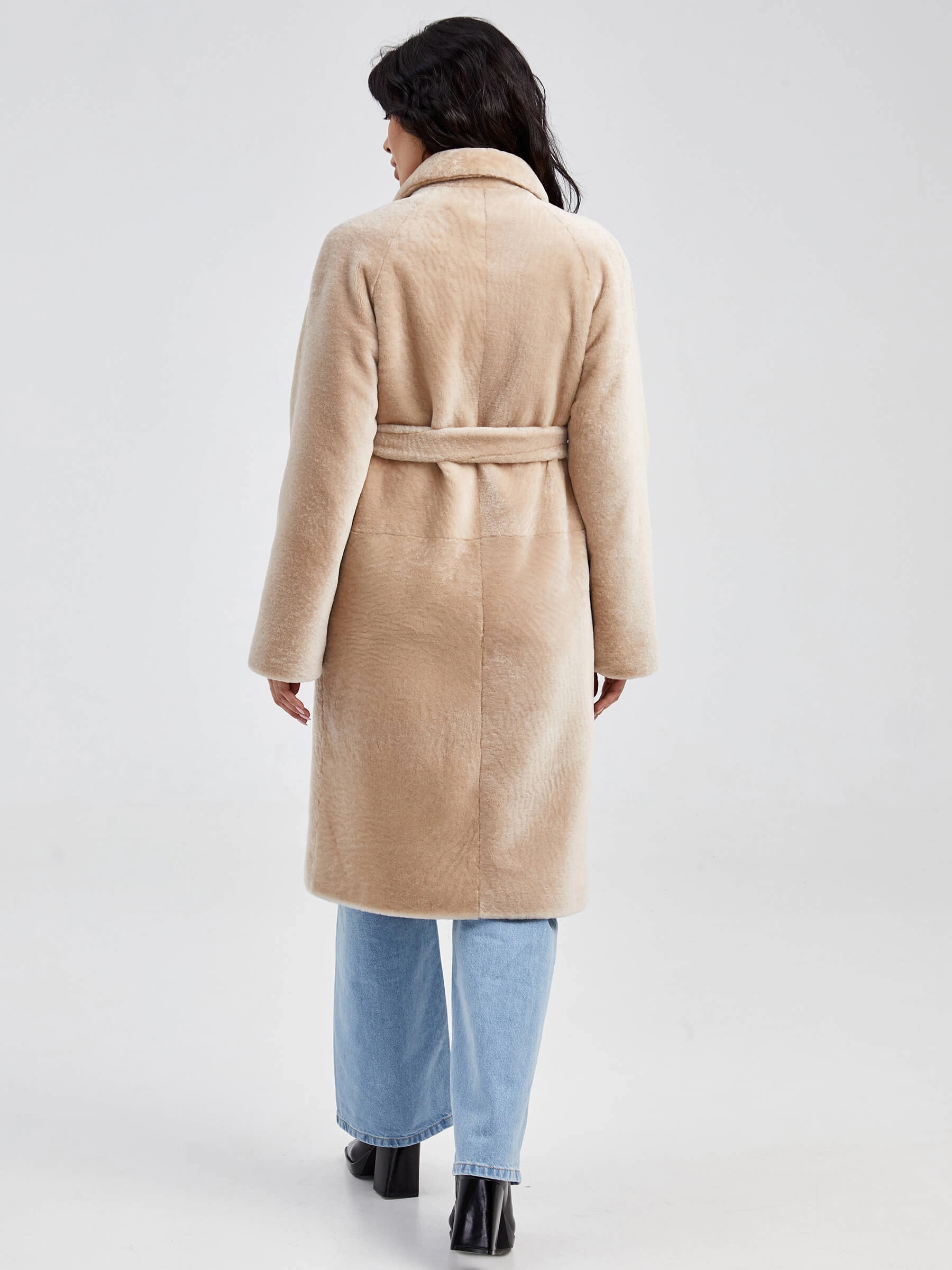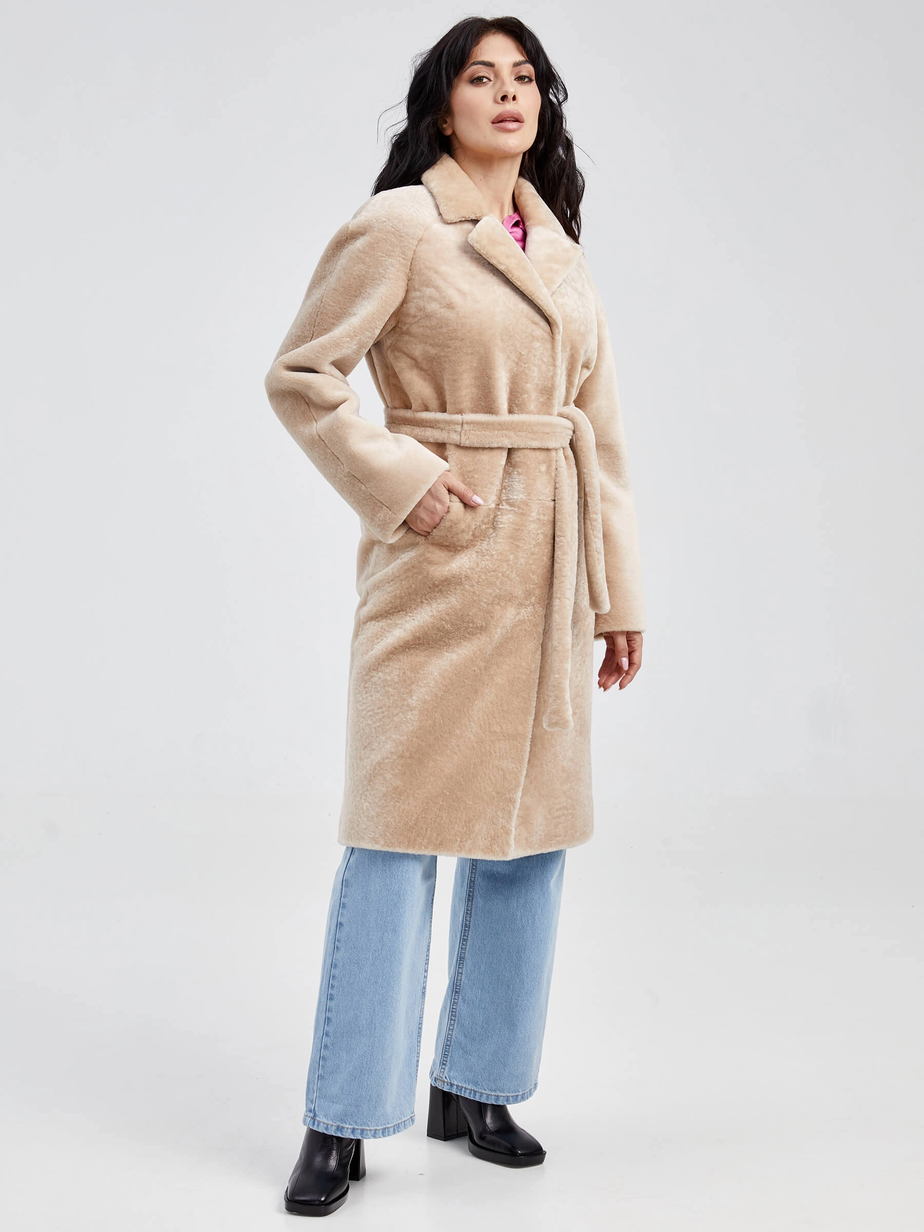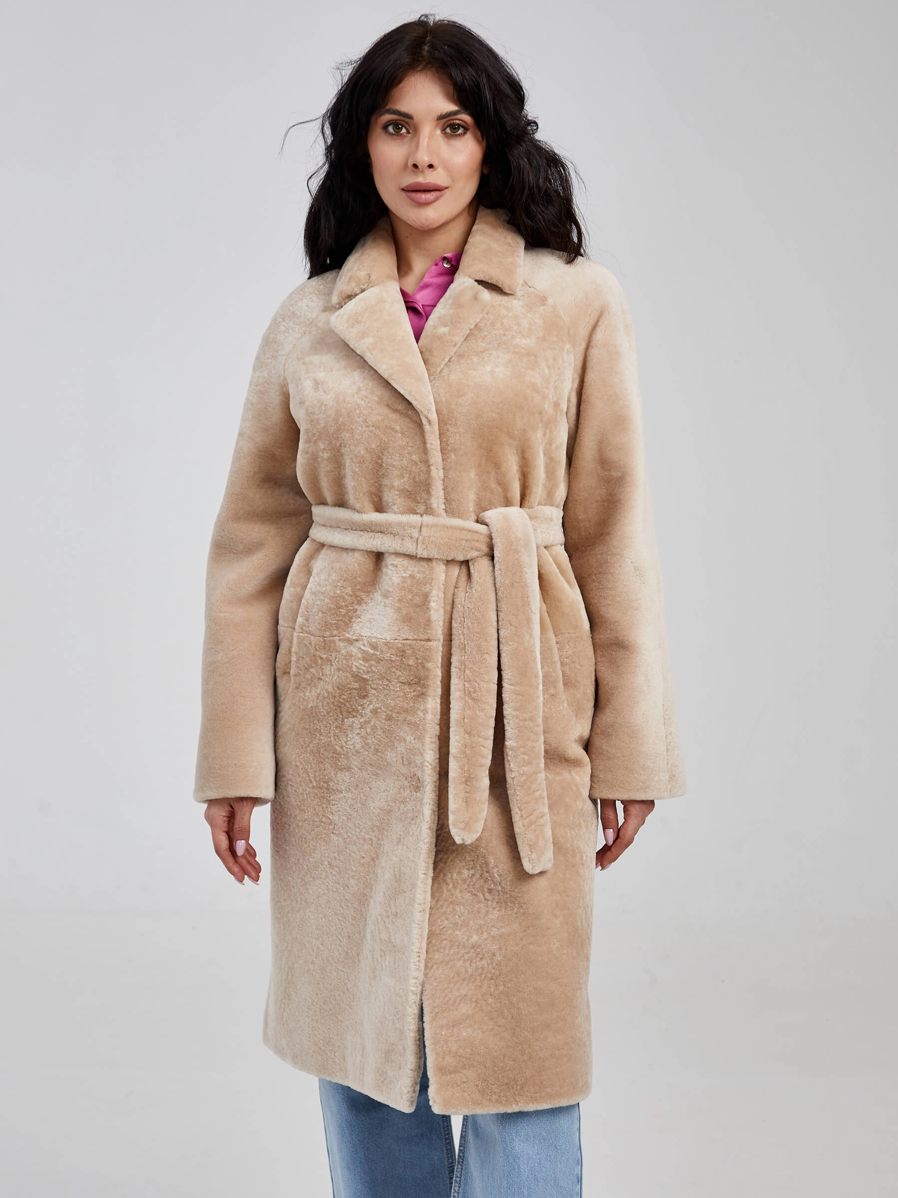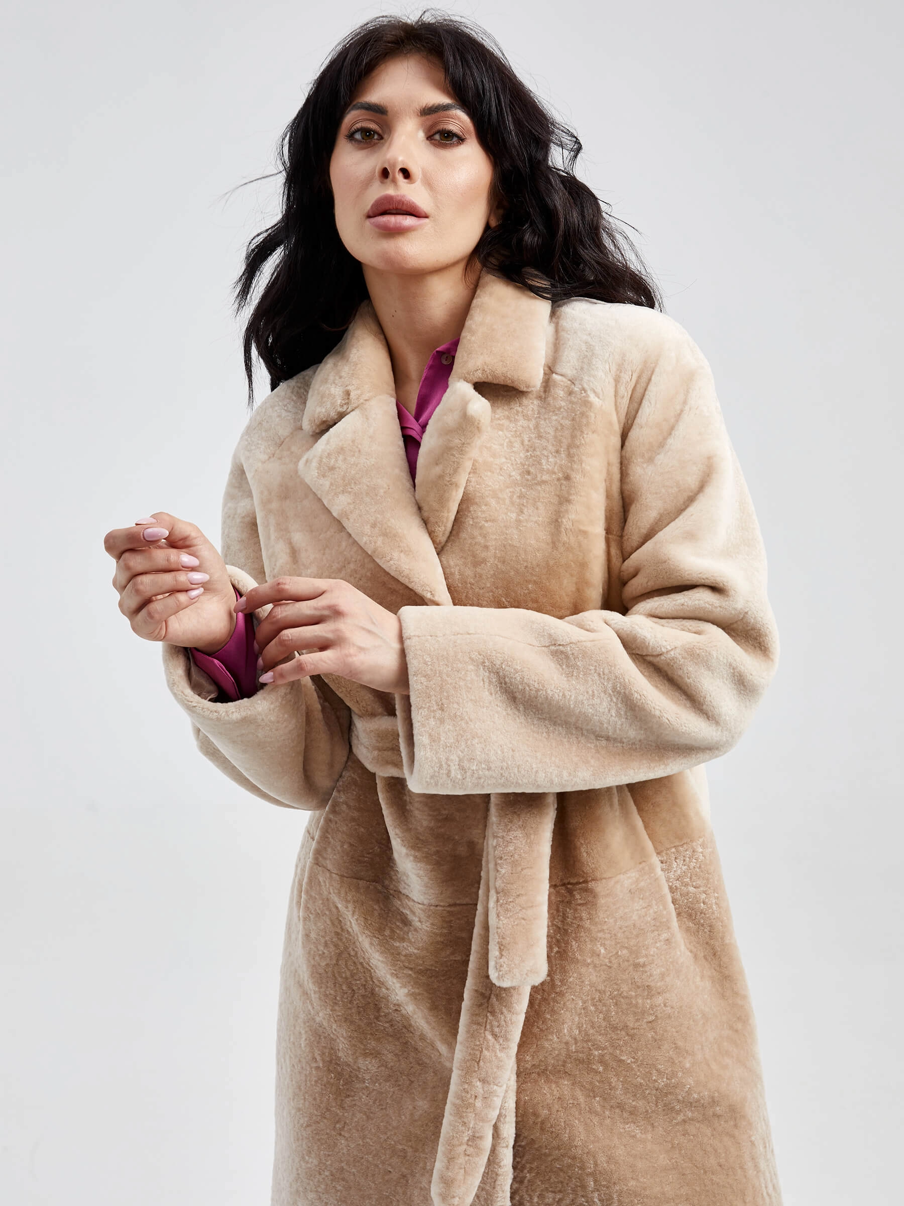 Премиальное качество. Лаконичная дубленка бежевого цвета не выглядит скучно. Полное отсутствие декора. Прямой крой. Английский воротник. Для пошива однотонной модели, мастера использовали нежнейший, шелковистый мех ягненка. Изделие получилось легким и теплым. Комфортно садится по фигуре, не сковывает движения. Дополнением к пальто служит широкий меховой пояс.