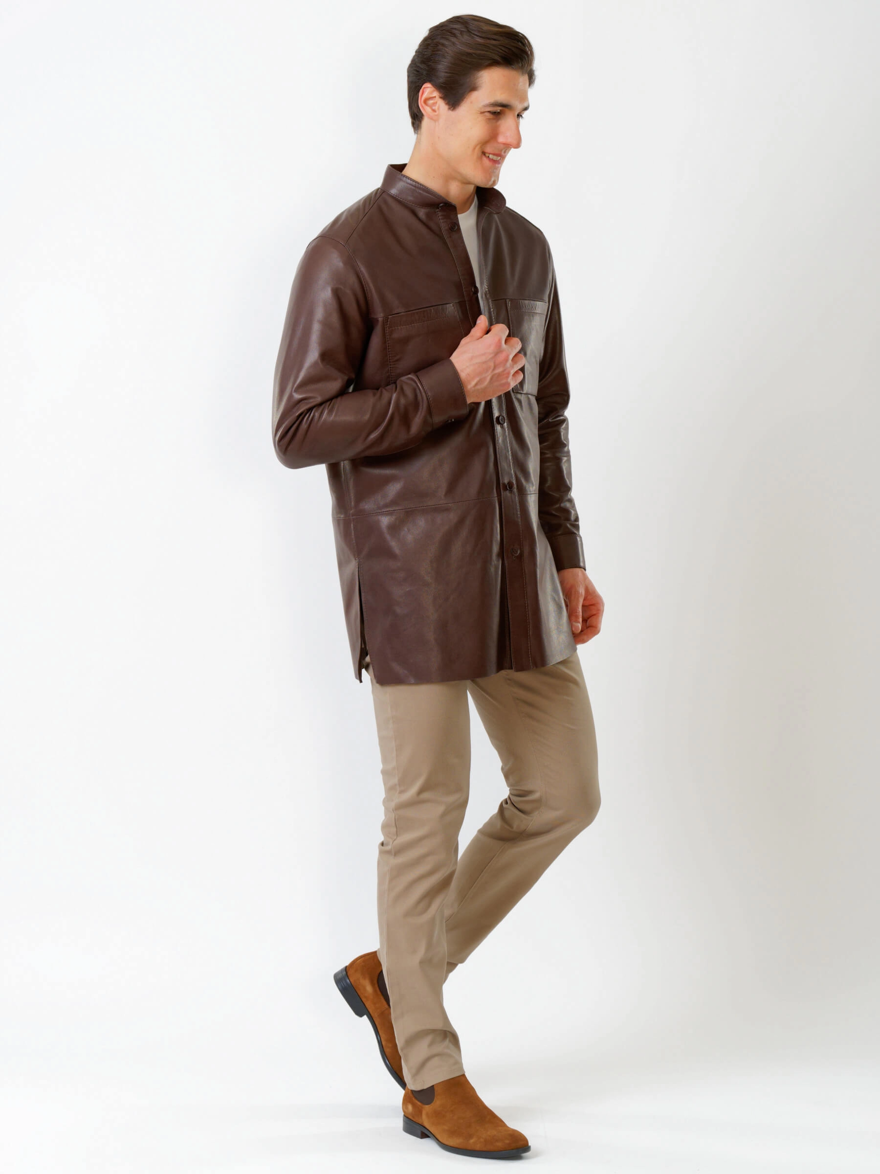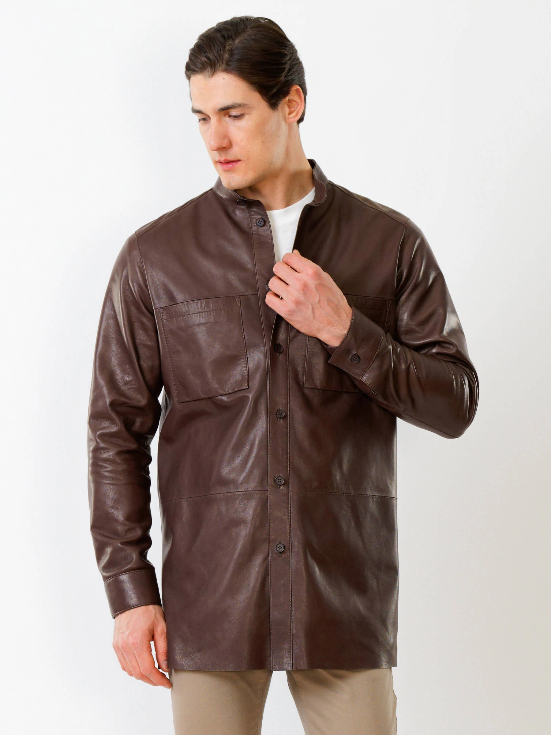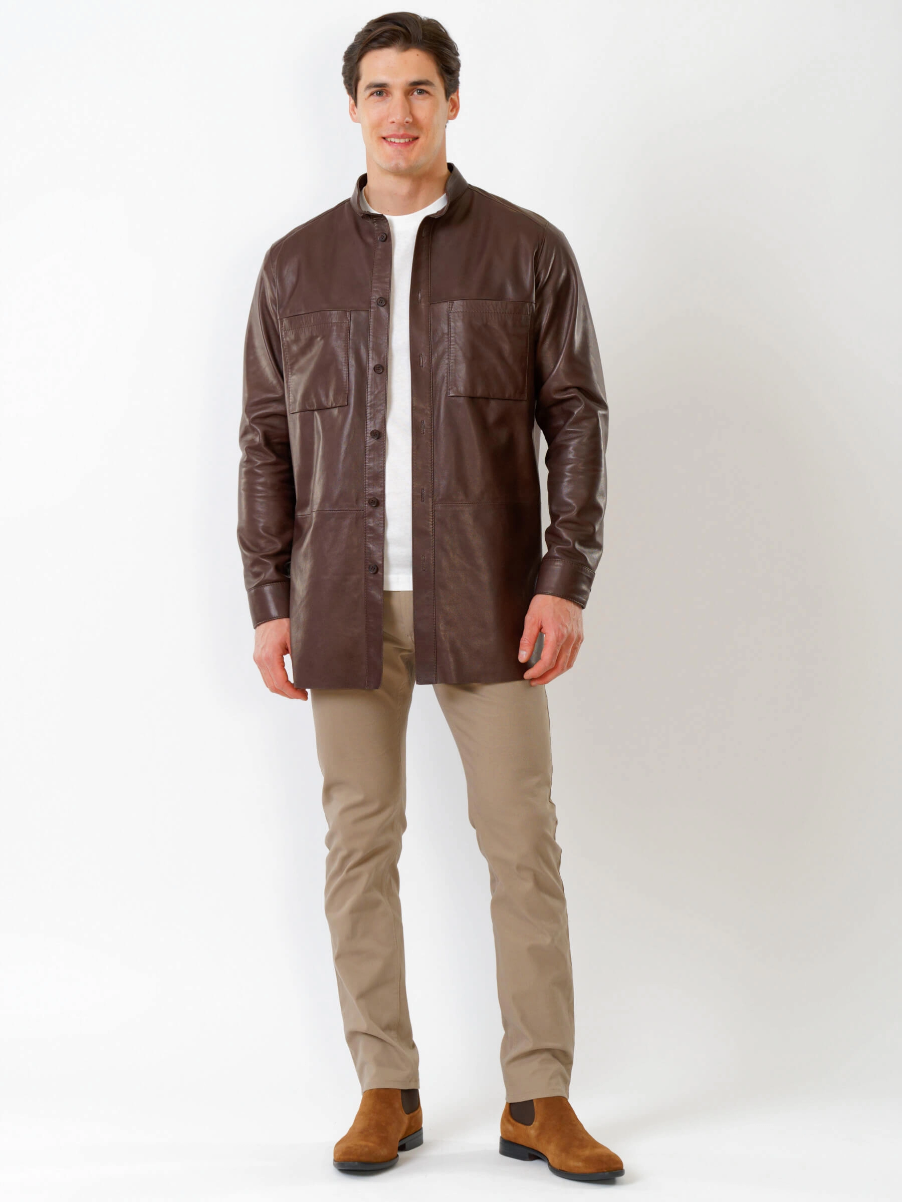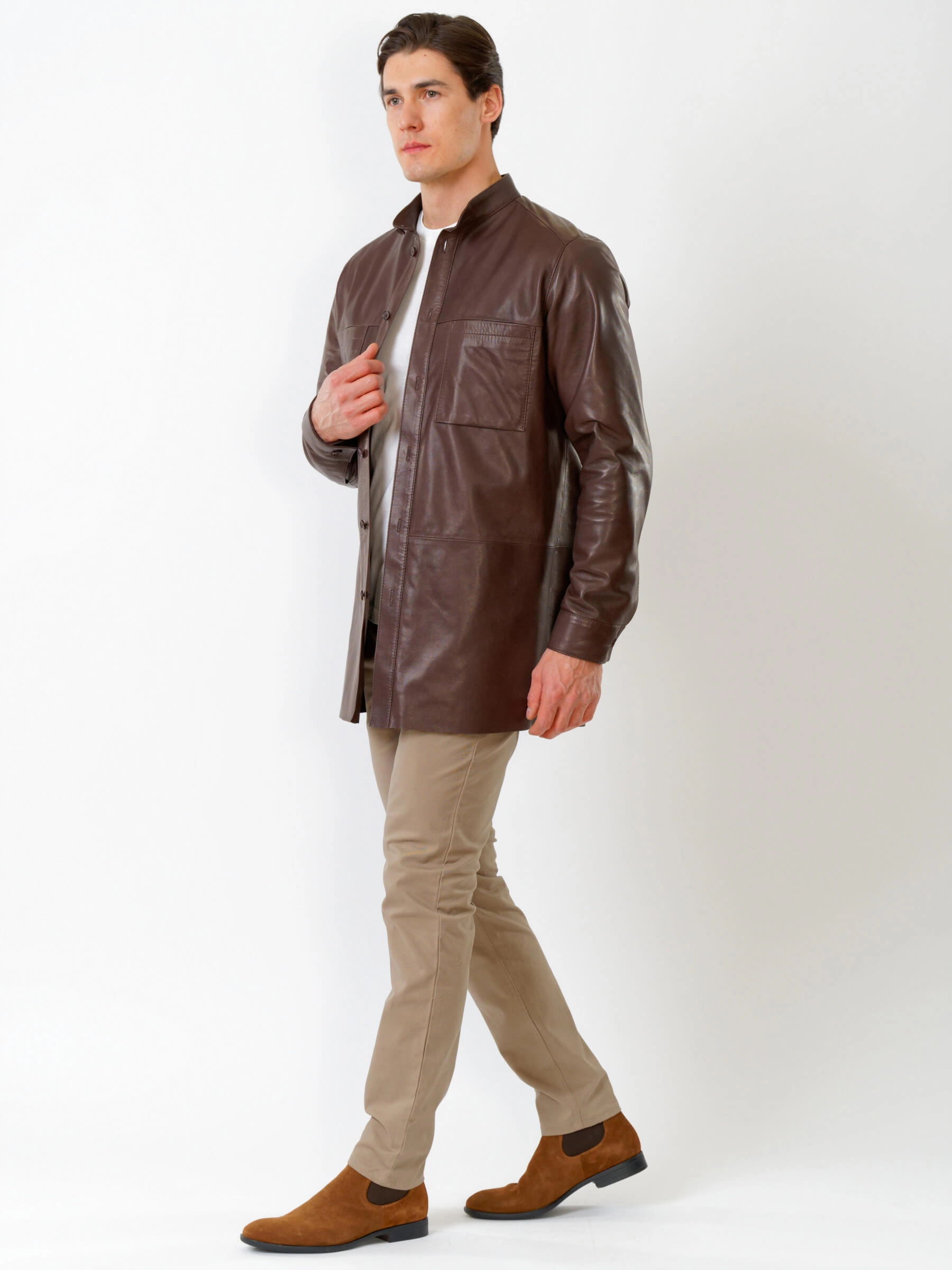 Товар рубашка из натуральной кожи премиум класса для мужчин 01, коричневая, размер 48, артикул 130010 выполнен из натуральной кожи с застежкой пуговицы. Рассчитан на сезон: демисезон. Длина изделия 85 см, силуэт прямой.