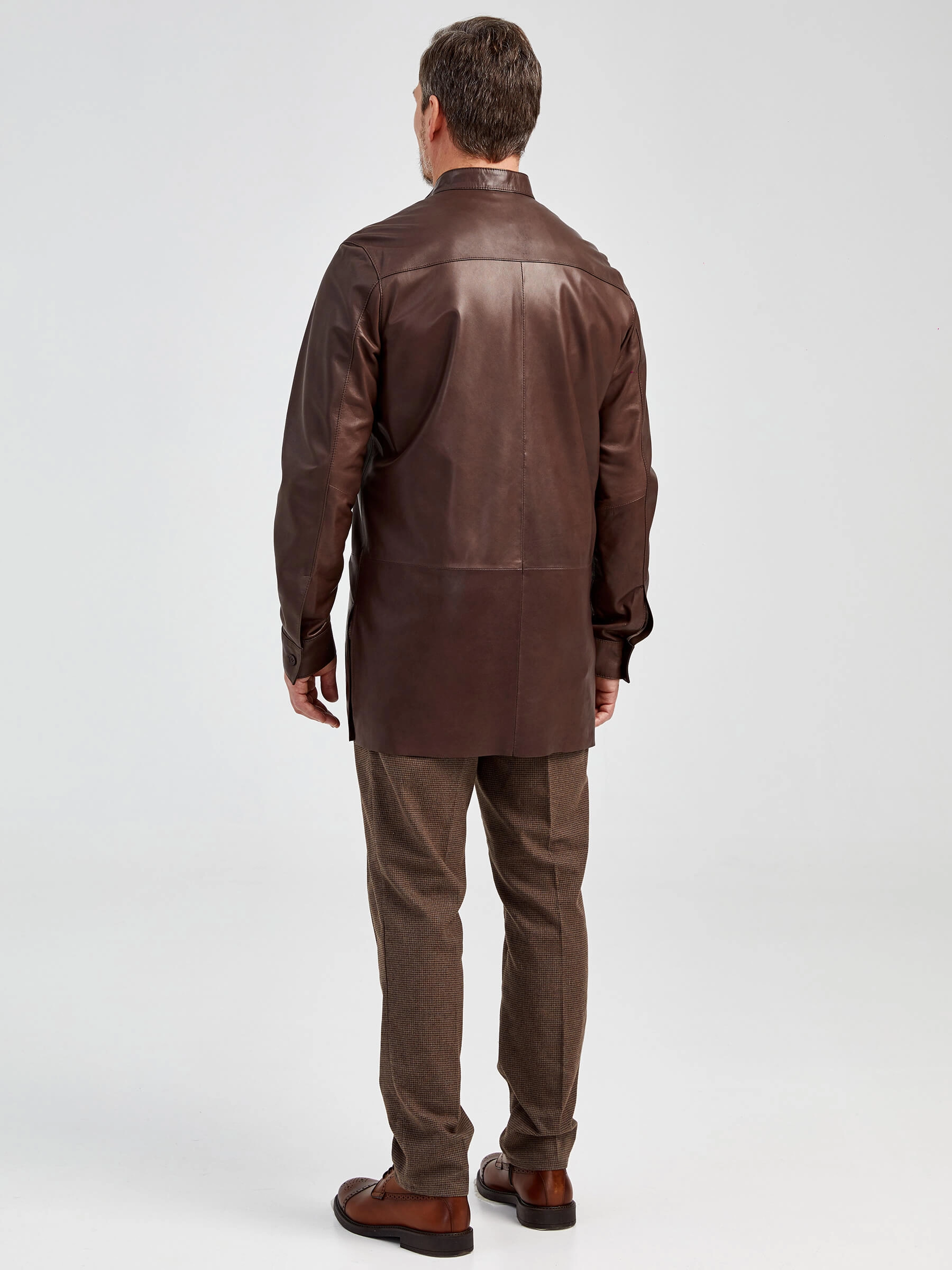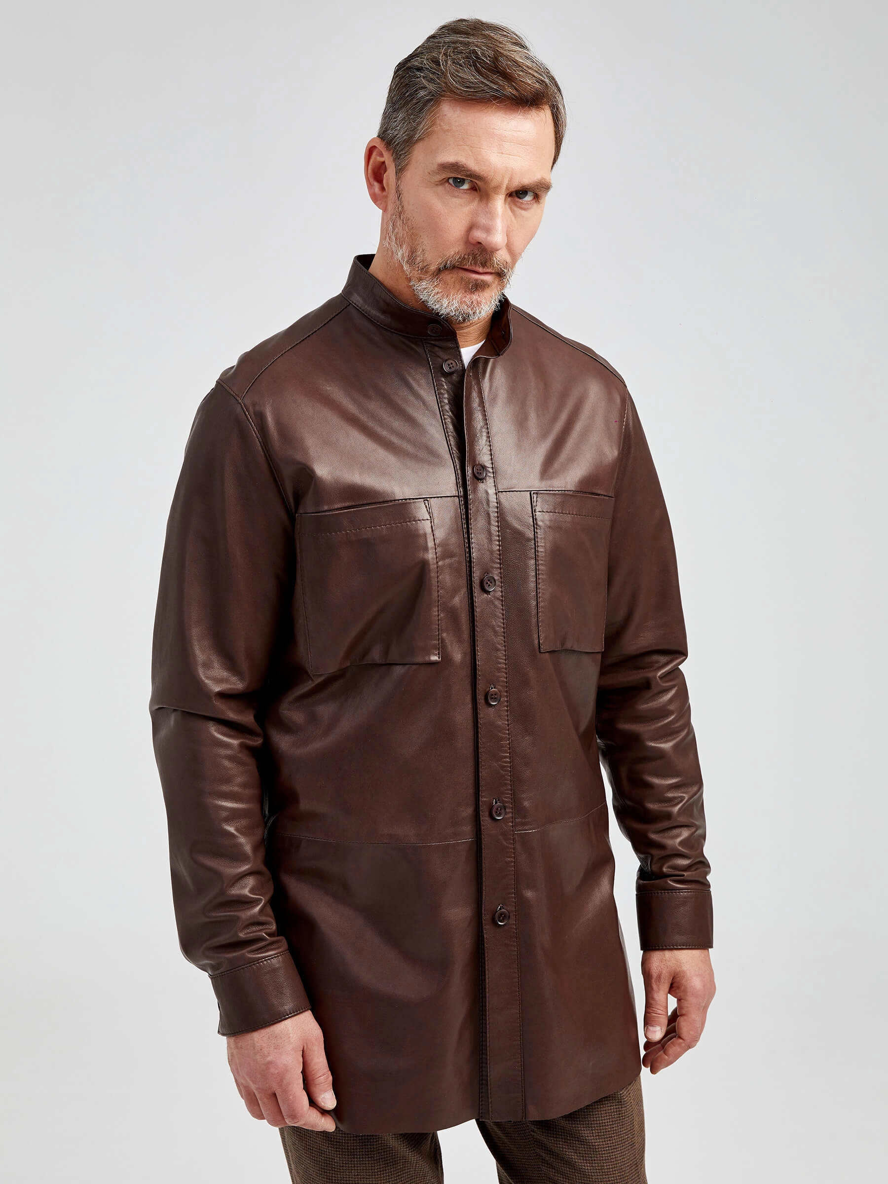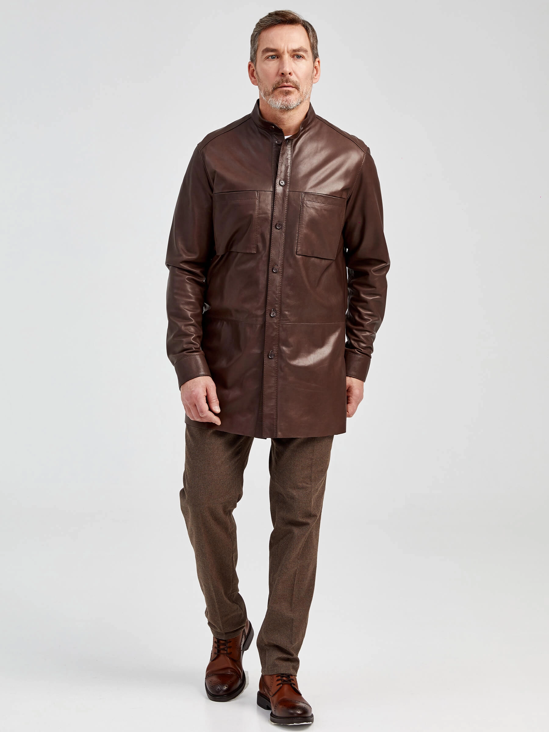 Товар рубашка из натуральной кожи премиум класса для мужчин 01, коричневая, размер 48, артикул 130021 выполнен из натуральной кожи с застежкой пуговицы. Рассчитан на сезон: демисезон. Длина изделия 85 см, силуэт прямой.