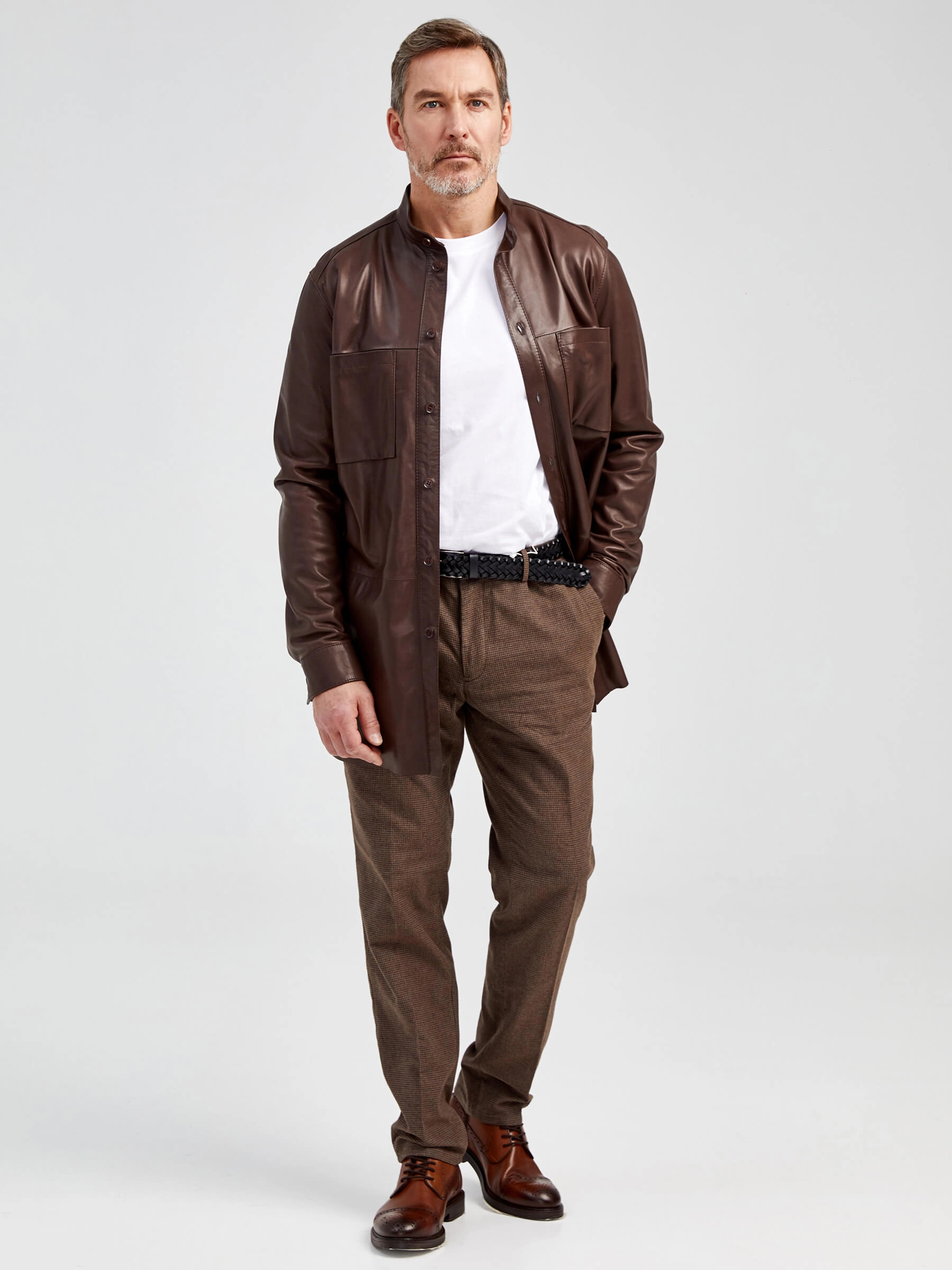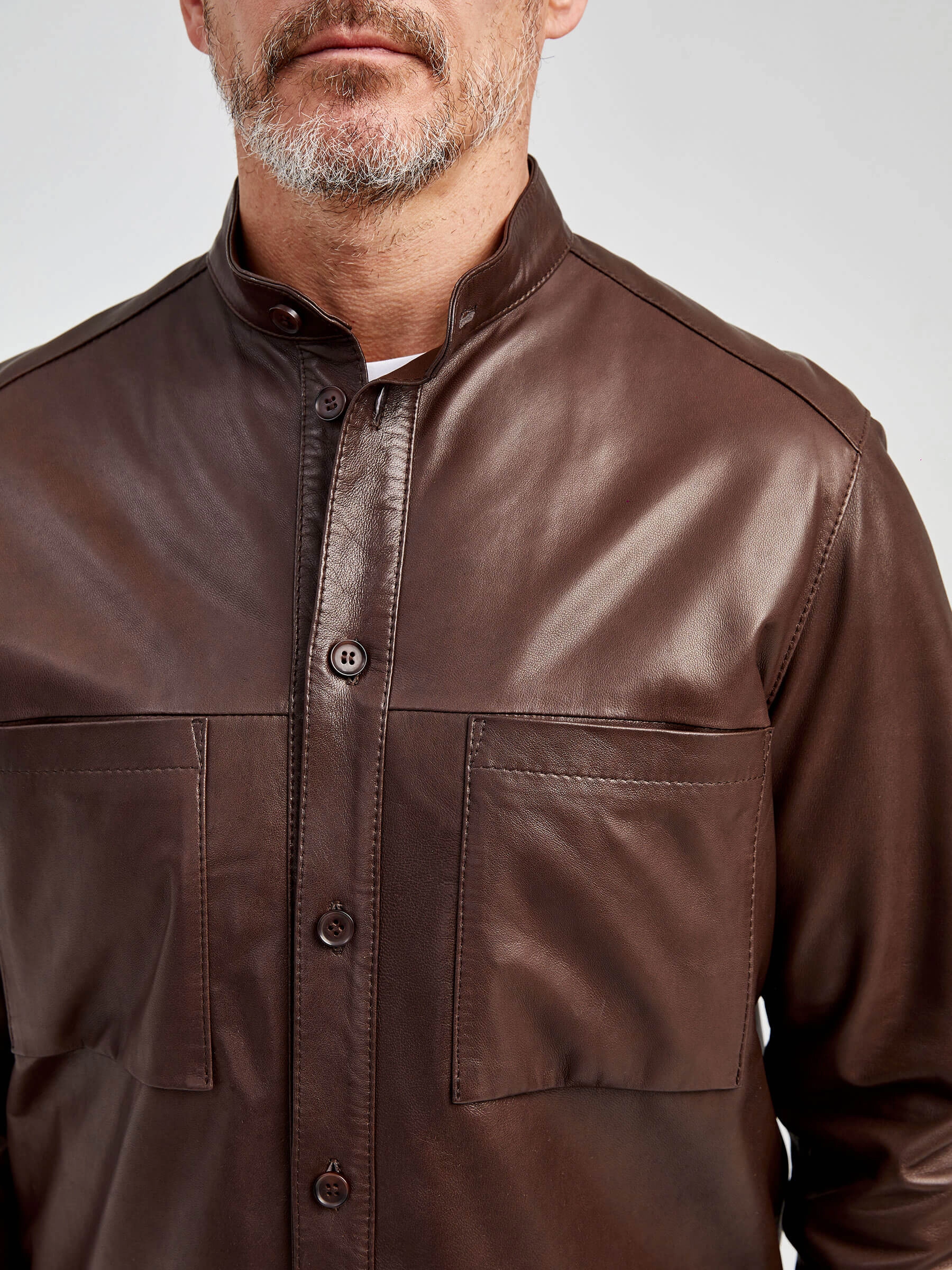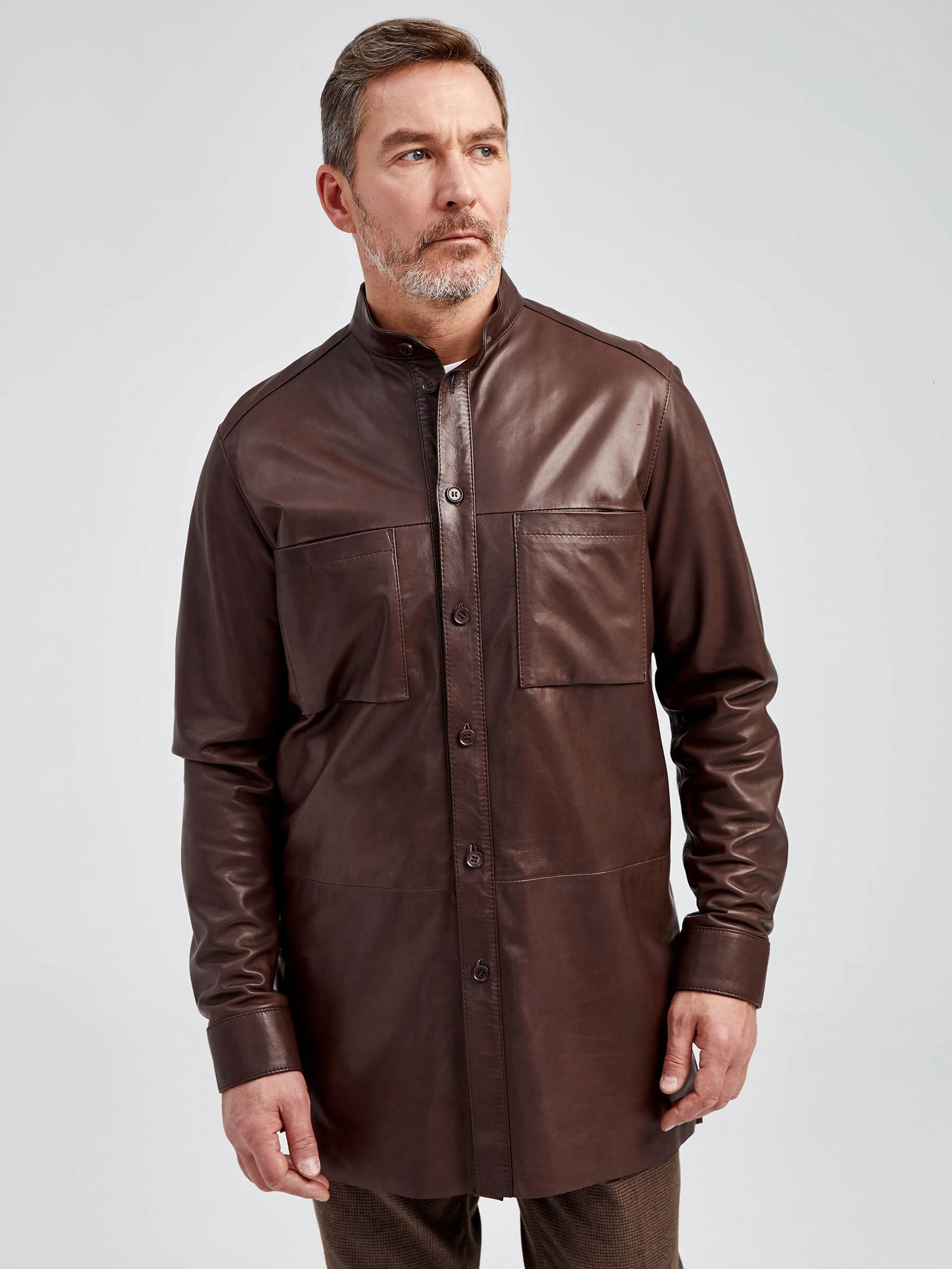 Товар рубашка из натуральной кожи премиум класса для мужчин 01, коричневая, размер 48, артикул 130021 выполнен из натуральной кожи с застежкой пуговицы. Рассчитан на сезон: демисезон. Длина изделия 85 см, силуэт прямой.