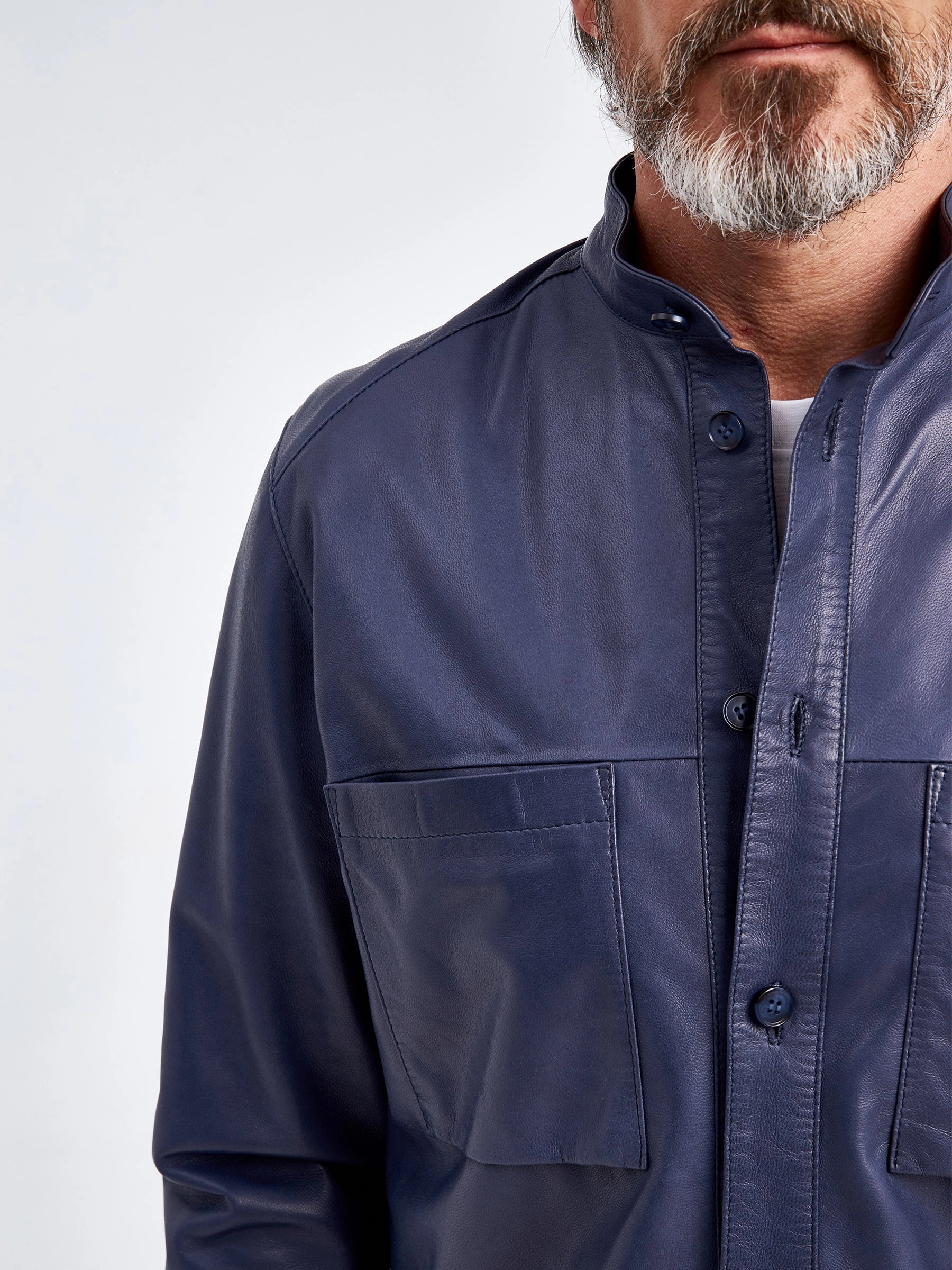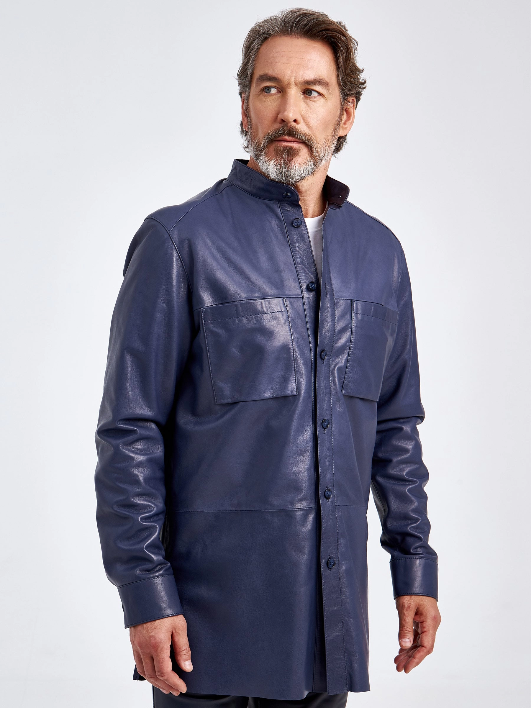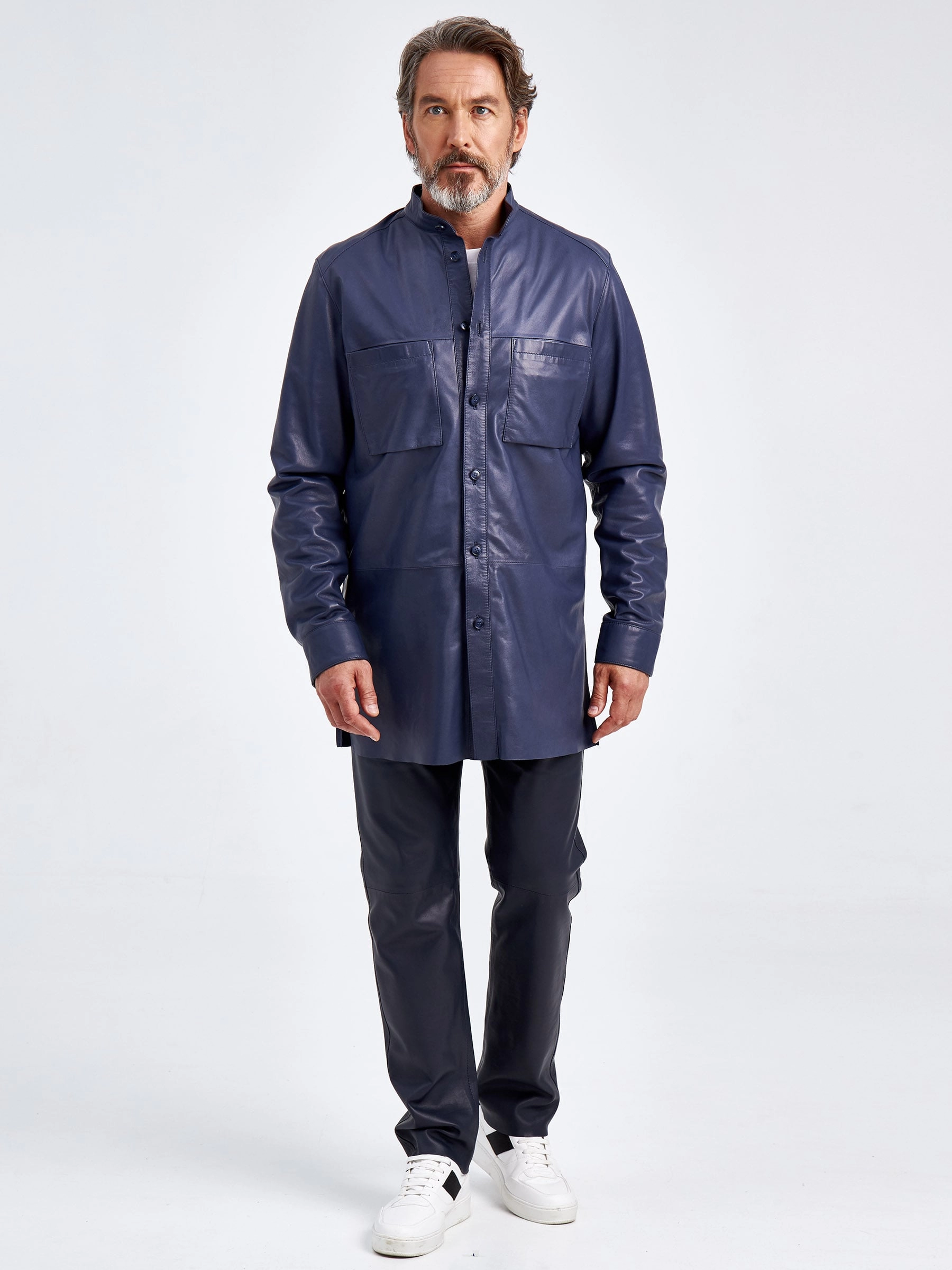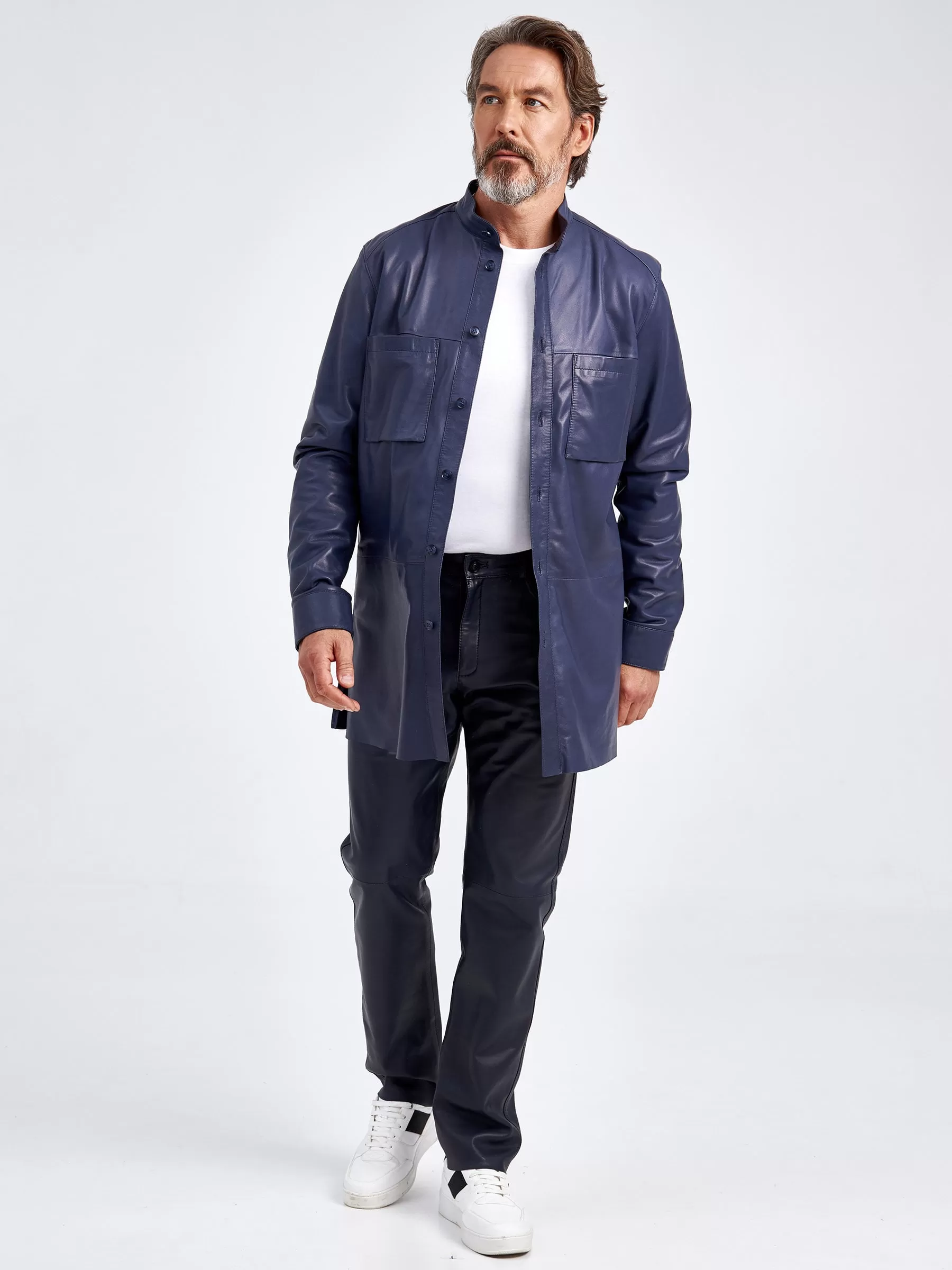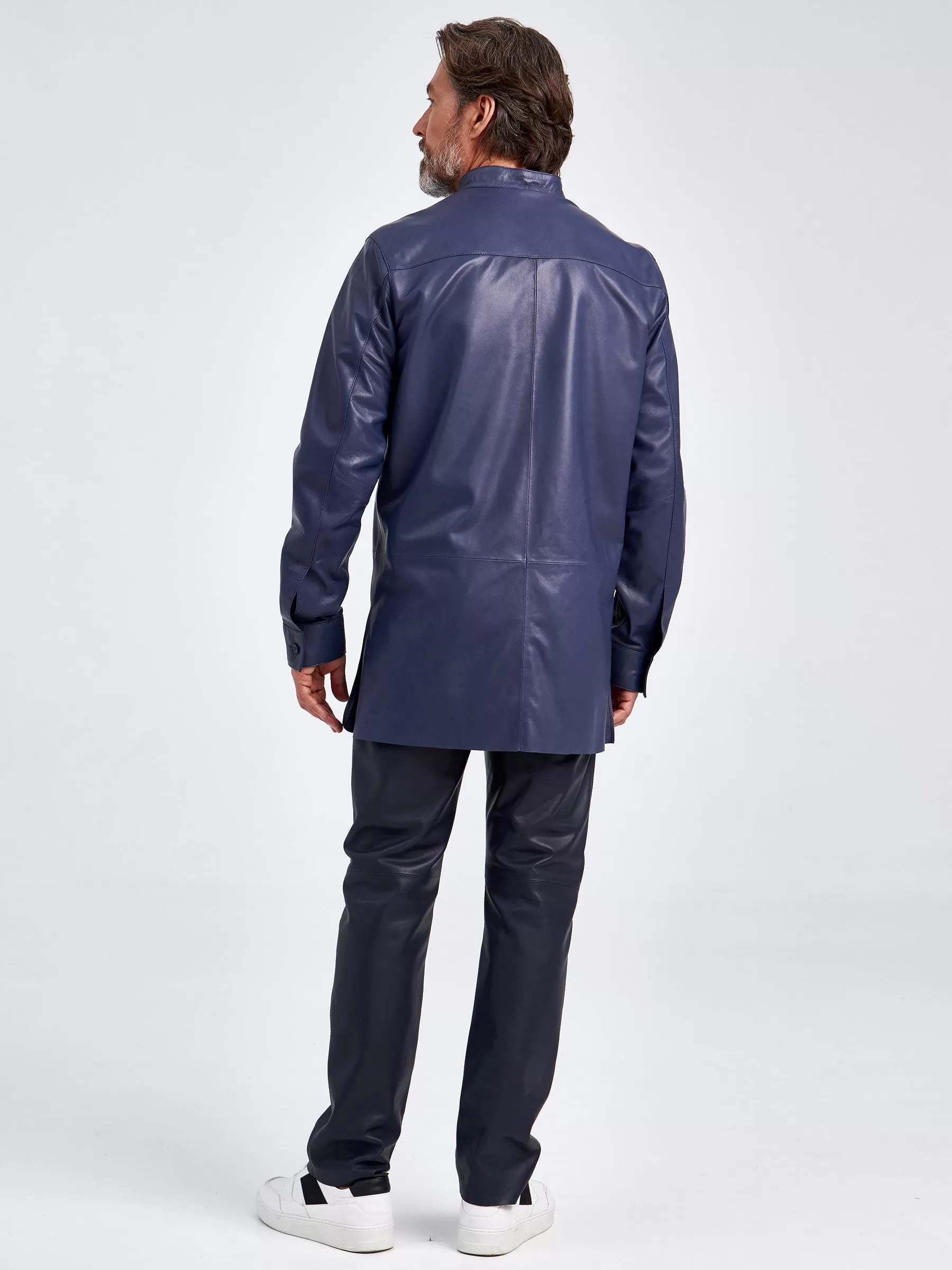 Товар рубашка из натуральной кожи премиум класса для мужчин 01, синяя, размер 48, артикул 130011 выполнен из натуральной кожи с застежкой пуговицы. Рассчитан на сезон: демисезон. Длина изделия 85 см, силуэт прямой.