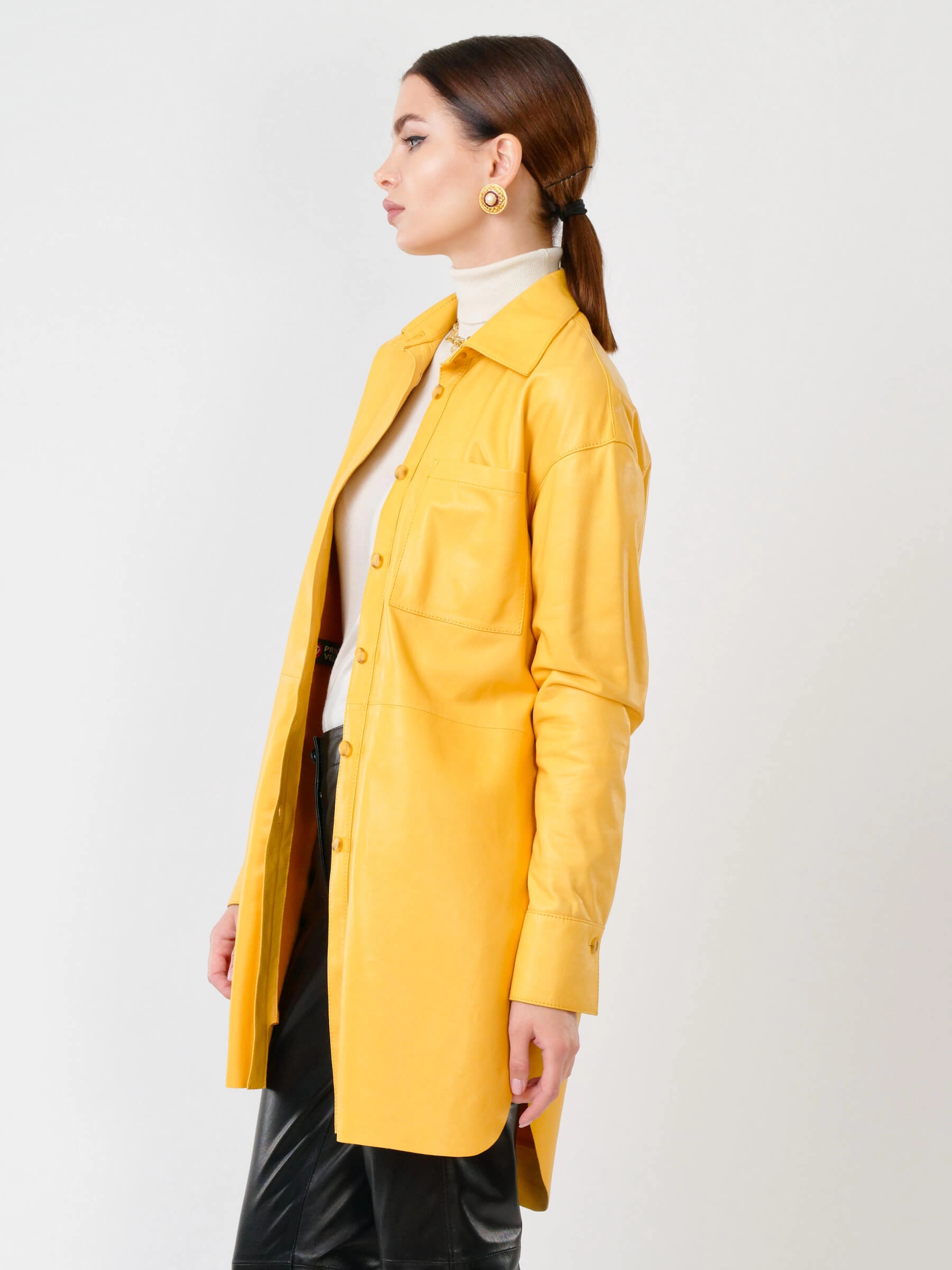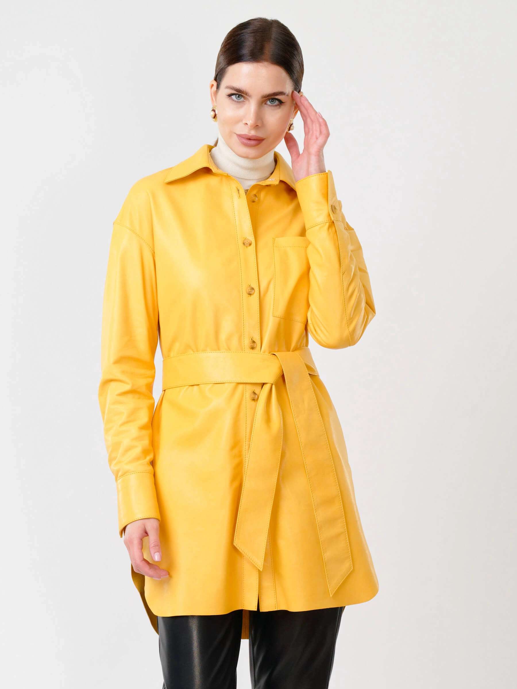 Товар женская кожаная рубашка с поясом из натуральной кожи 01_1, желтая, размер 46, артикул 90761 выполнен из натуральной кожи с застежкой пуговицы. Рассчитан на сезон: весна-лето. Длина изделия 94 см, силуэт свободный.