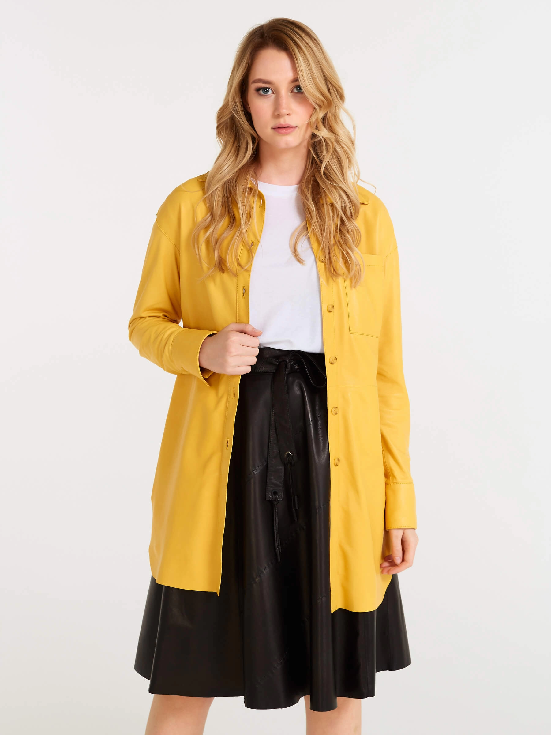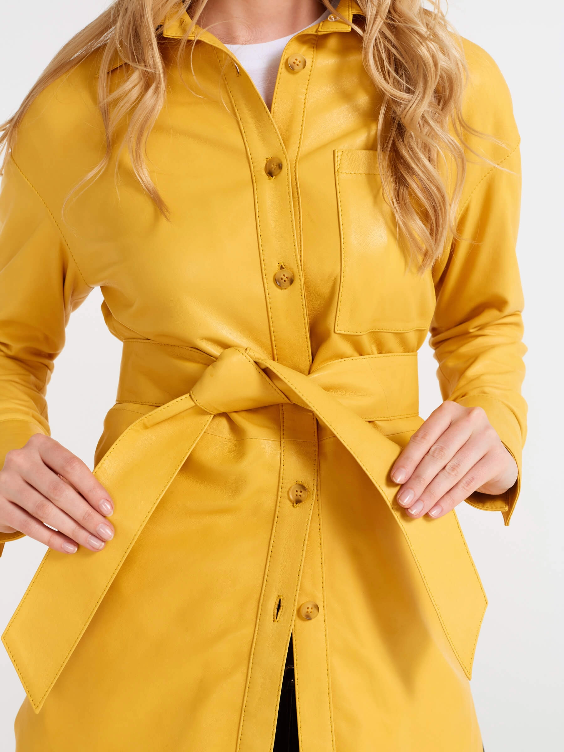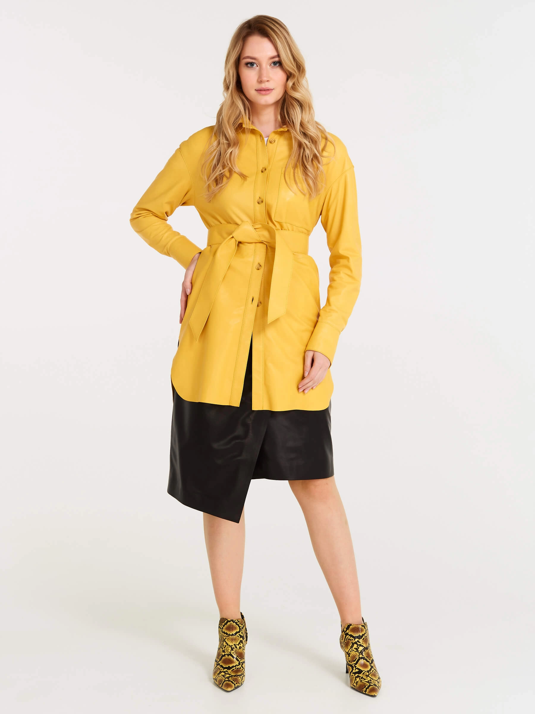 Товар кожаная женская рубашка с поясом из натуральной кожи 01, желтая, размер 48, артикул 90490 выполнен из натуральной кожи с застежкой пуговицы. Рассчитан на сезон: весна-лето. Длина изделия 94 см, силуэт свободный.