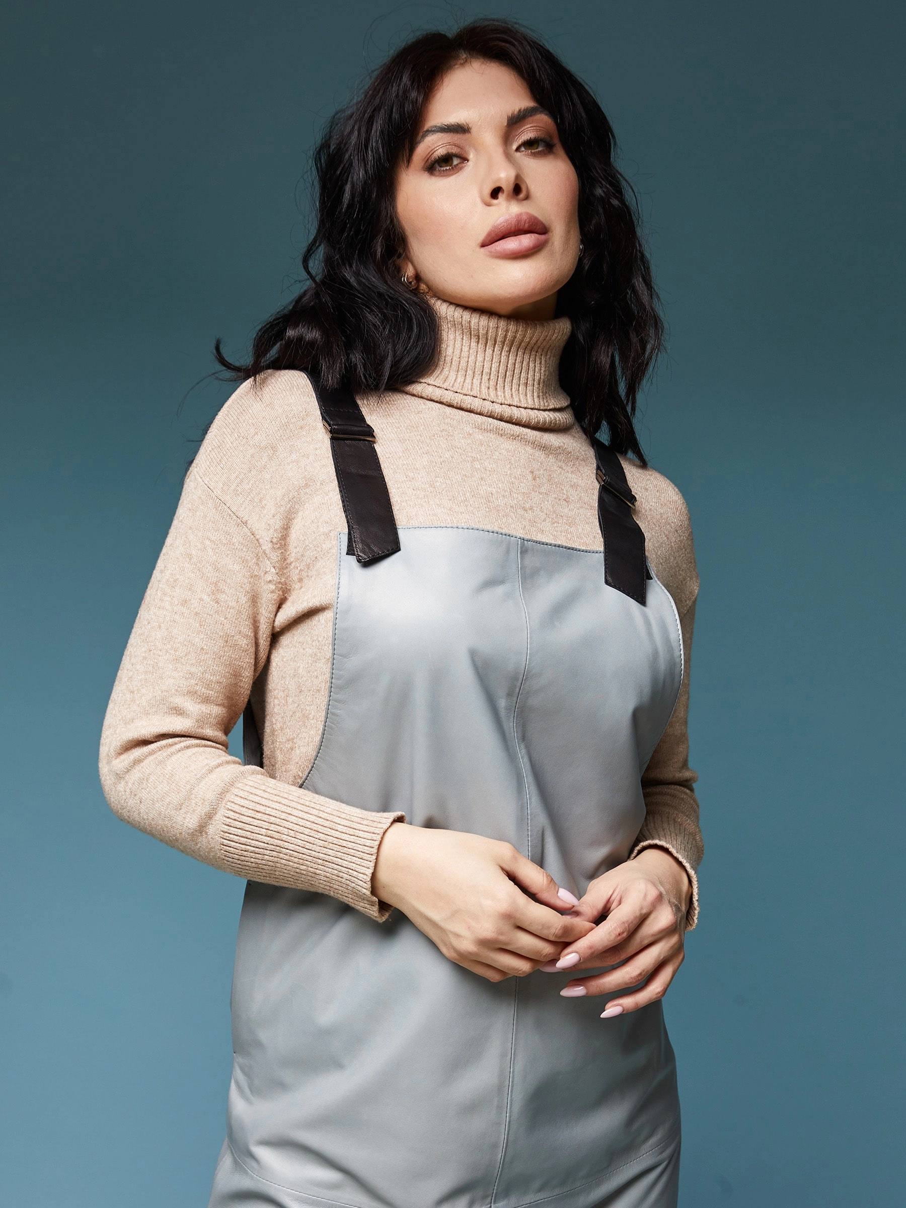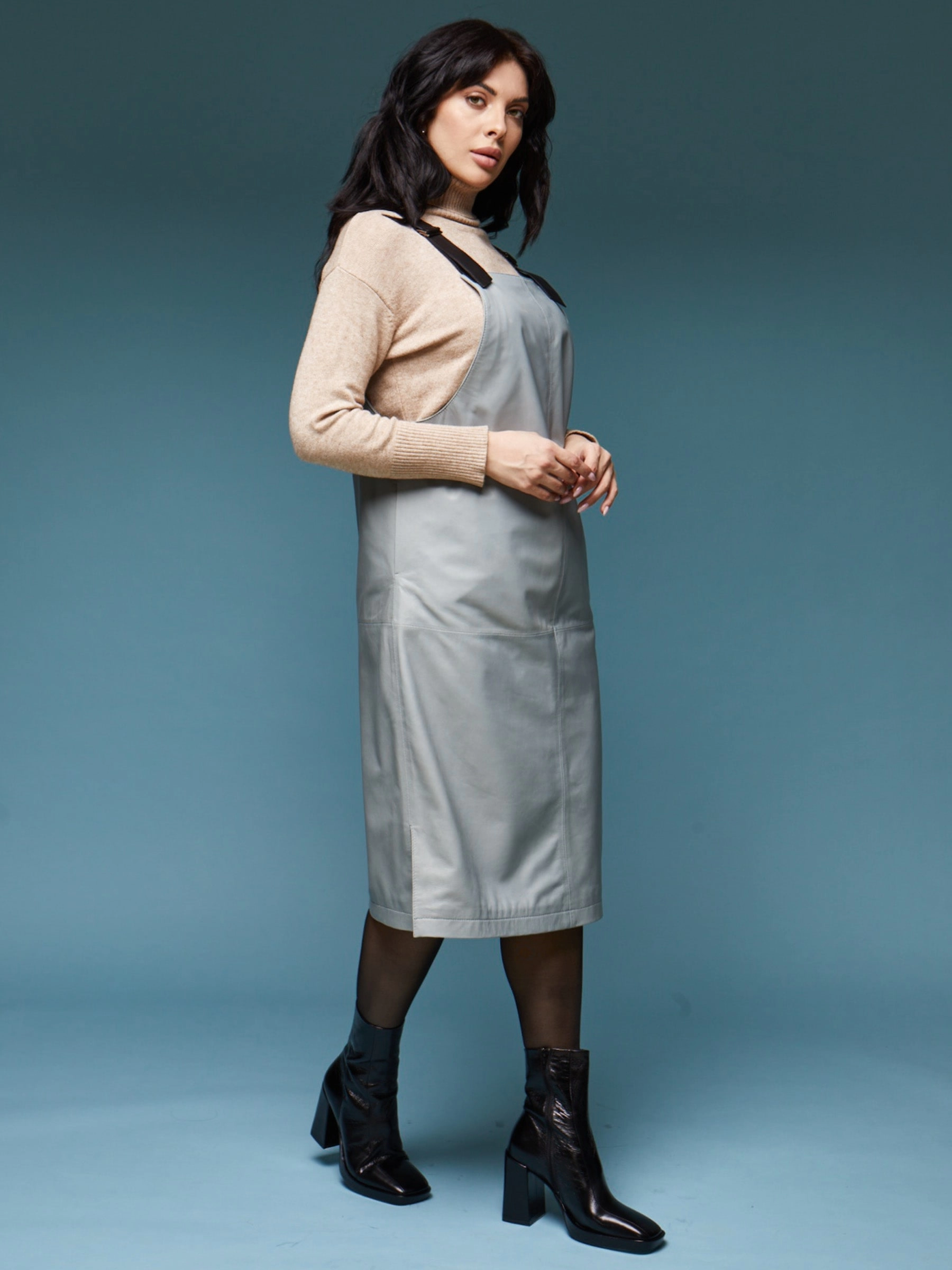 Сарафан из серо-голубой натуральной кожи длиной 98 см переосмысливает концепцию экологичной кожи благодаря инновационной технологии растительного дубления, создающей материал с шелковистой поверхностью и гипоаллергенными свойствами. Прямой силуэт с широкими лямками и боковыми разрезами обеспечивает элегантность и свободу движений, а отсутствие фурнитуры подчеркивает чистоту линий цельного кожного полотна. Уникальный серо-голубой оттенок, меняющий интенсивность при разном освещении, сочетается с объемными трикотажными вещами, минималистичными топаами и любой обувью, а натуральная кожа гарантирует, что с годами изделие будет становиться только выразительнее, сохраняя свои премиальные качества.