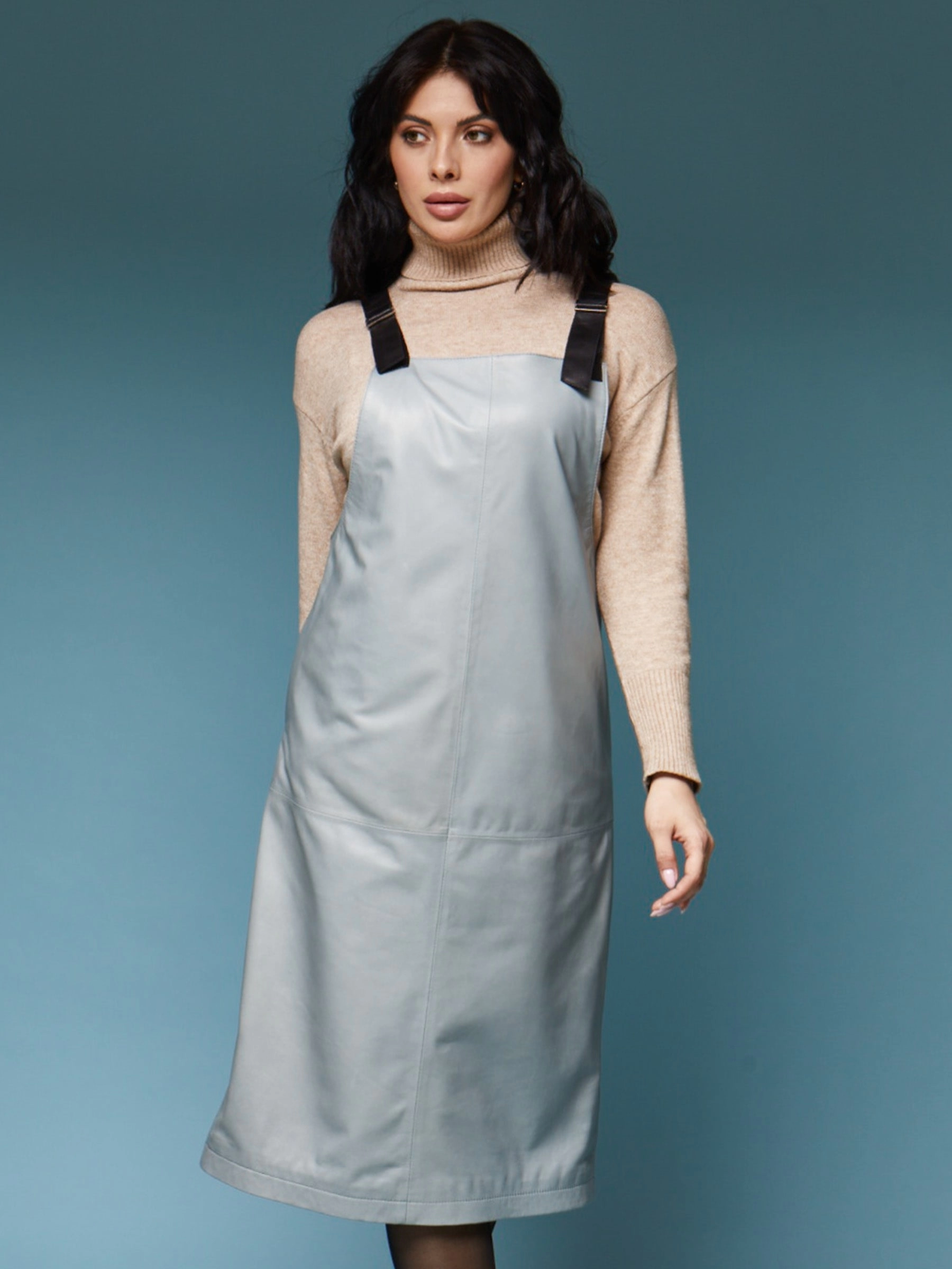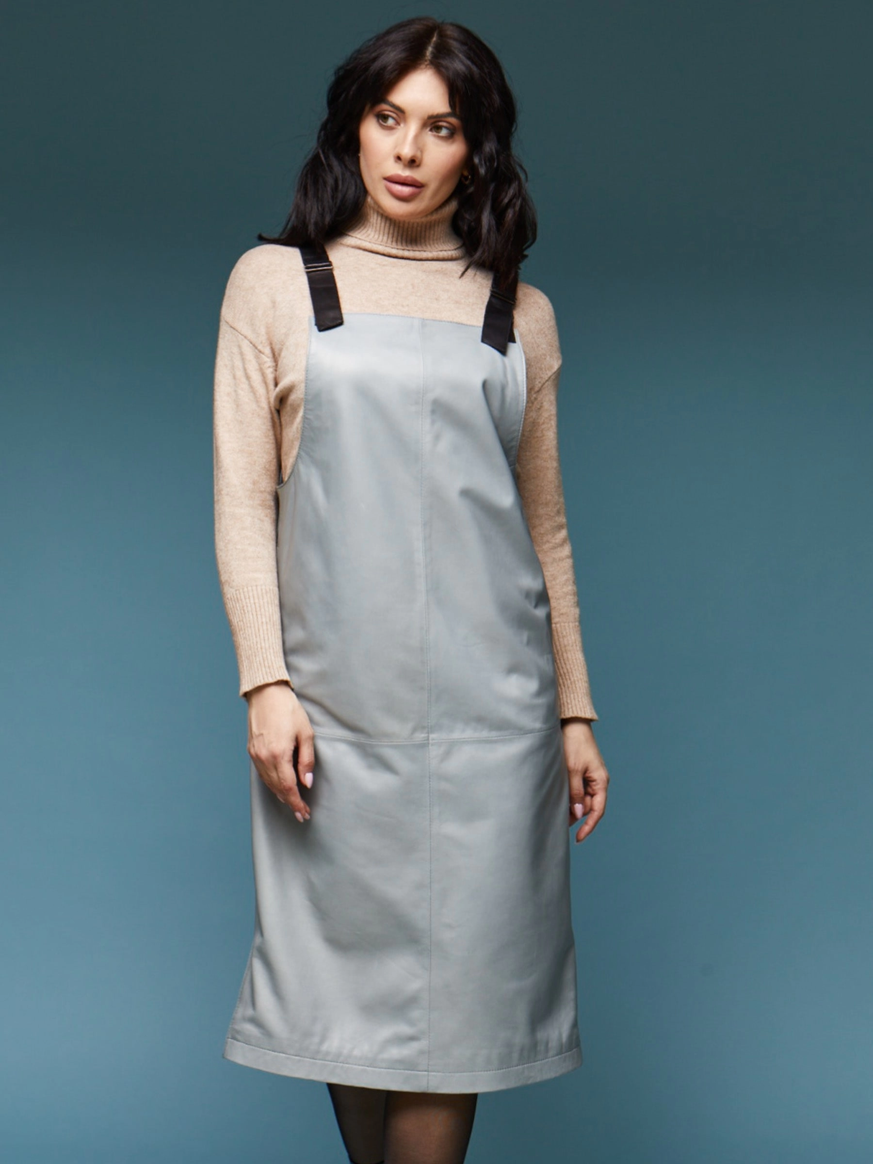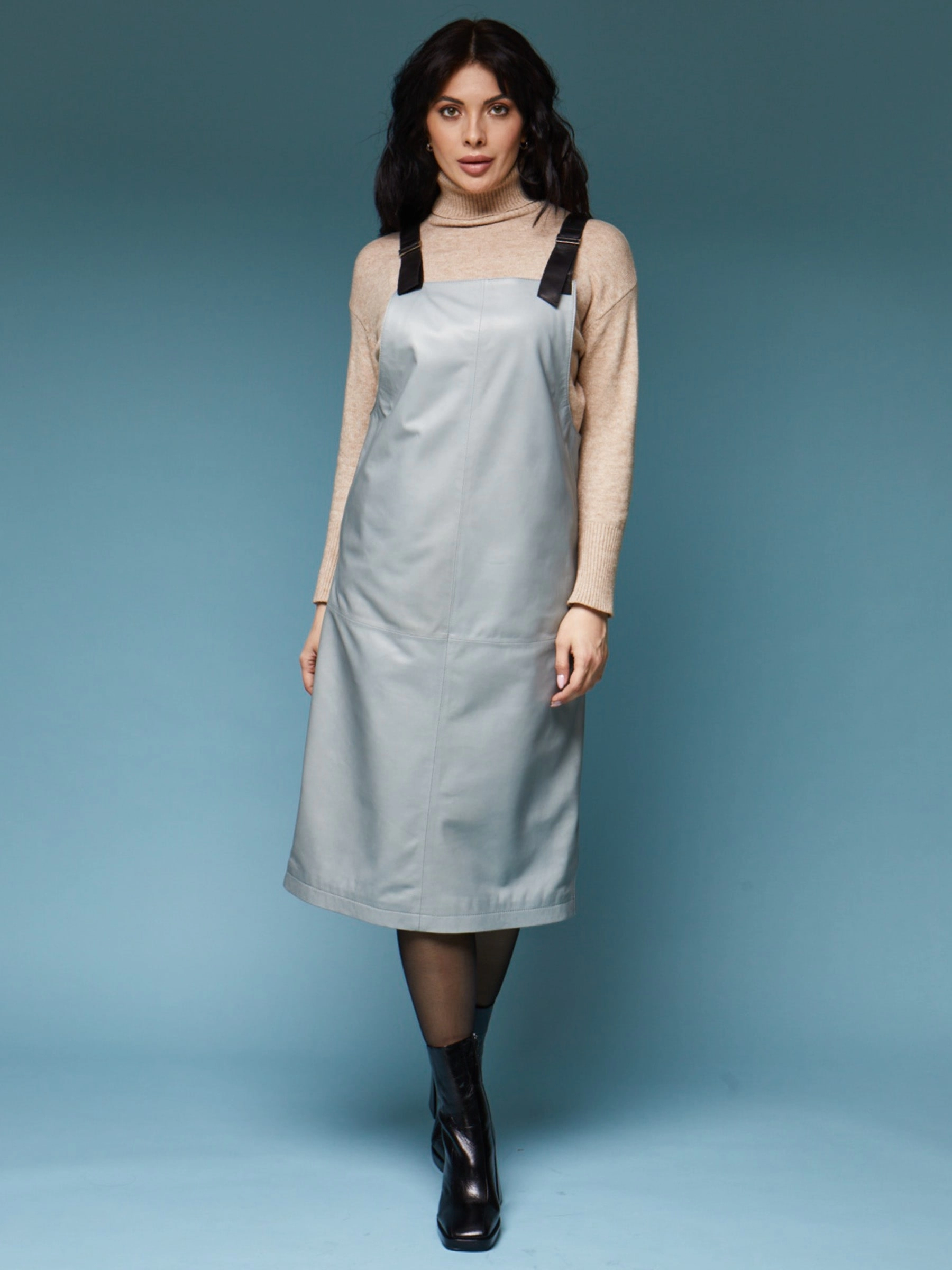 Товар длинный кожаный сарафан 01_1, серо-голубой, размер 46, артикул 85170 выполнен из натуральной кожи с застежкой бретели. Рассчитан на сезон: демисезон. Длина изделия 98 см, силуэт прямой.