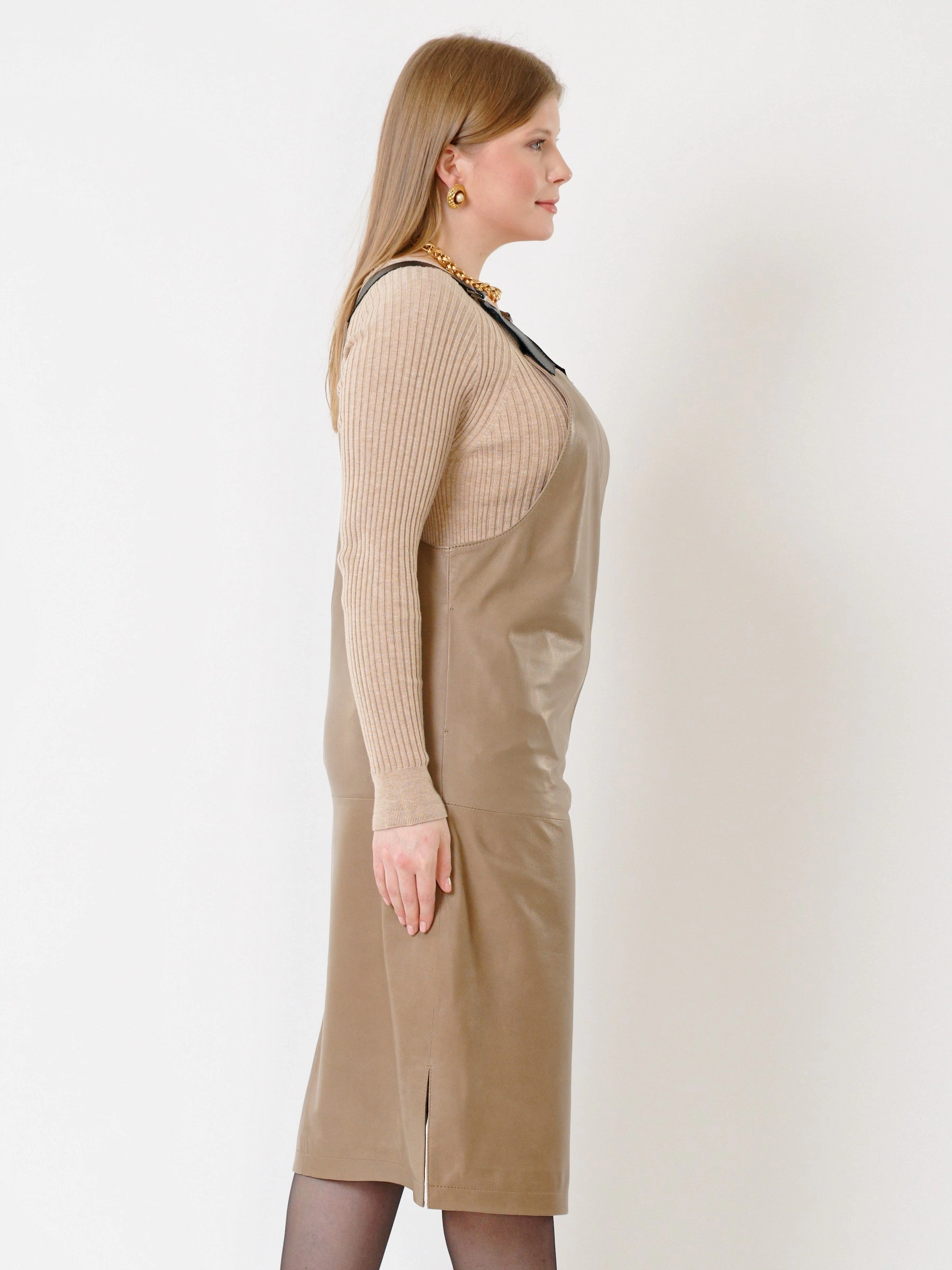 Серо-коричневый кожаный сарафан длиной 98 см из натуральной органической кожи. Прямой крой с широкими лямками создает элегантный силуэт, а глубокие боковые разрезы обеспечивают легкость движения. В отличие от аналогов, эта модель полностью лишена фурнитуры - молнии и застежки заменяет продуманная конструкция из цельного кожного полотна. При обработке материала применялась особая технология дубления растительными экстрактами, благодаря чему кожа сохранила природную мягкость и приобрела гипоаллергенные свойства. Тактильные качества превосходят обычную кожу - поверхность напоминает струящийся шелк, но с характерной благородной текстурой.