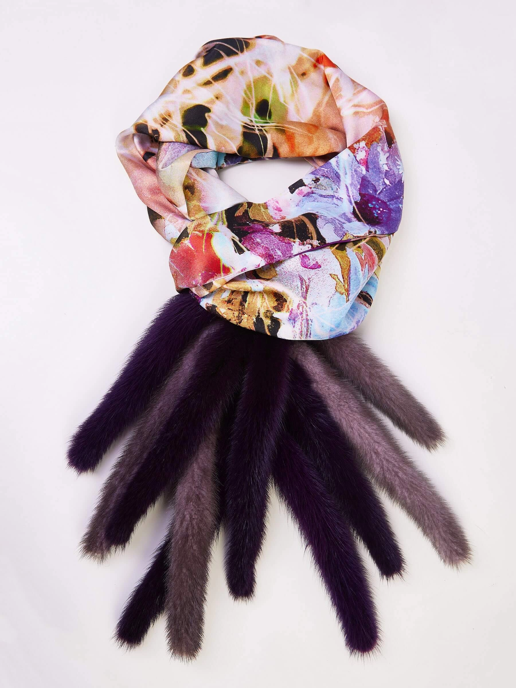 Элегантный шарф мастера выполнили из шелка, дополнением послужили хвосты норки. Аксессуар идеально сочетается как с меховой, так и с кожаной одеждой.