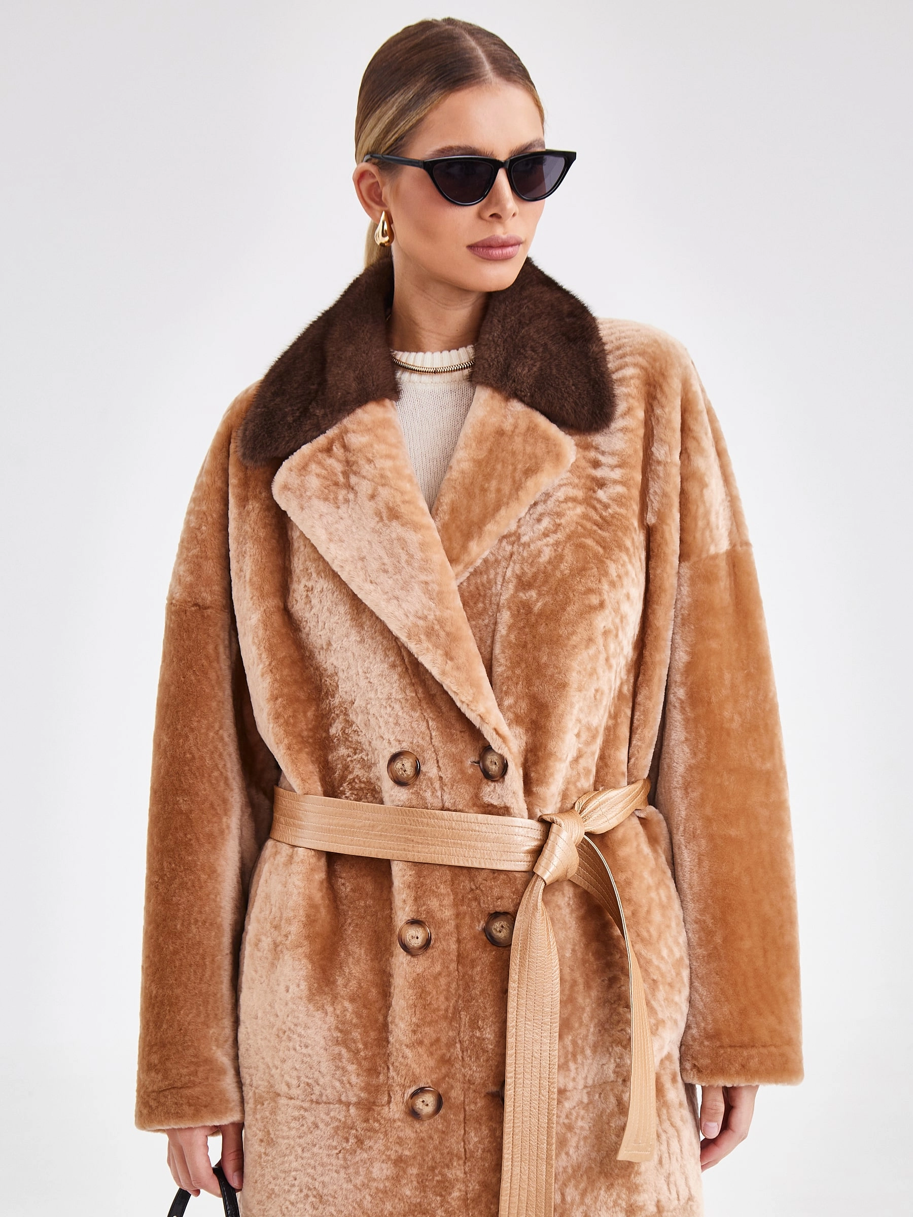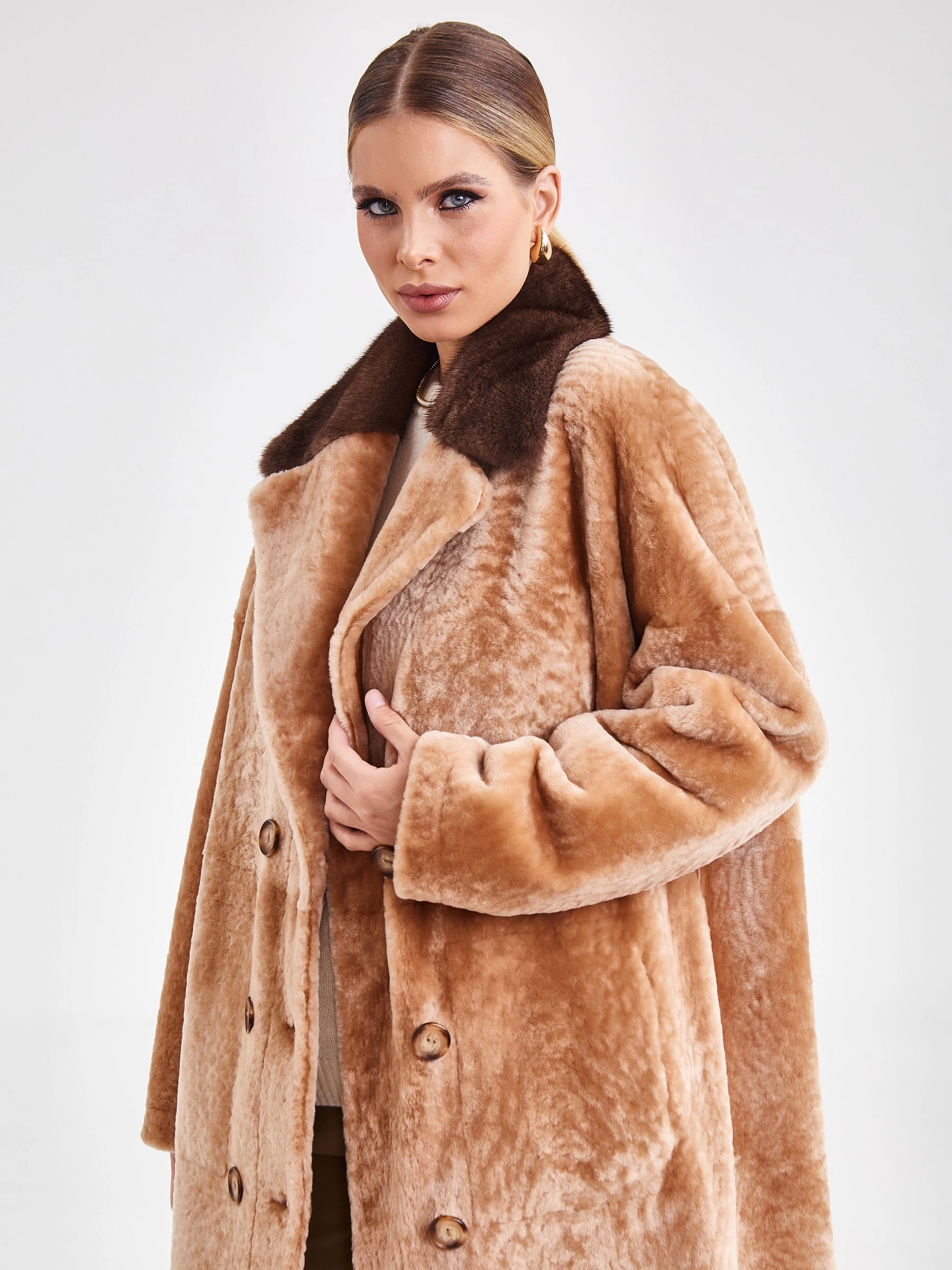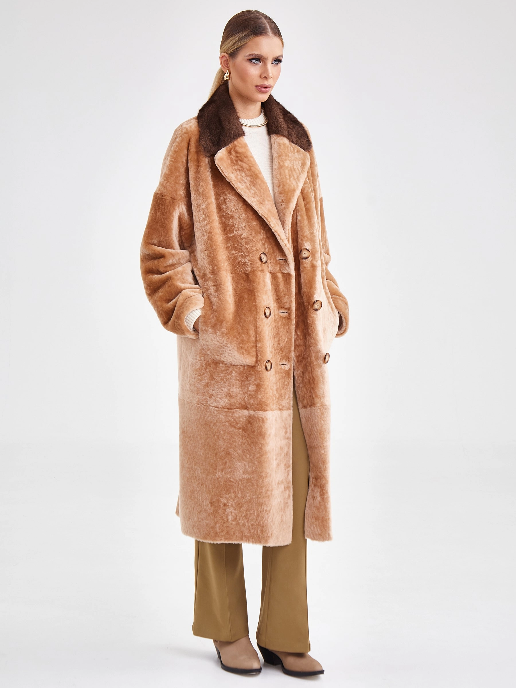 Двубортная двусторонняя шуба из овчины «астраган» и меха норки премиум-класса представляет собой превосходный пример актуальной классики. Эта удлинённая модель (свыше 90 см) прямого кроя со спущенными плечами и широкими лацканами сшита из мягкой плотной овчины: одна сторона — гладкая кожа, а другая — тёплый густой мех. Благодаря особой обработке швов изделие легко трансформируется в элегантную шубу. Застёжка на пуговицы, английский воротник из норки и контрастный пояс из натуральной кожи завершают образ, делая эту шубу универсальным и роскошным выбором для повседневной носки осенью и зимой. Совет стилиста: носите её как лаконичное пальто с джинсами скинни и грубыми ботинками для дерзкого образа в стиле кэжуал или наденьте поверх вечернего платья, добавив лоска любому выходу.