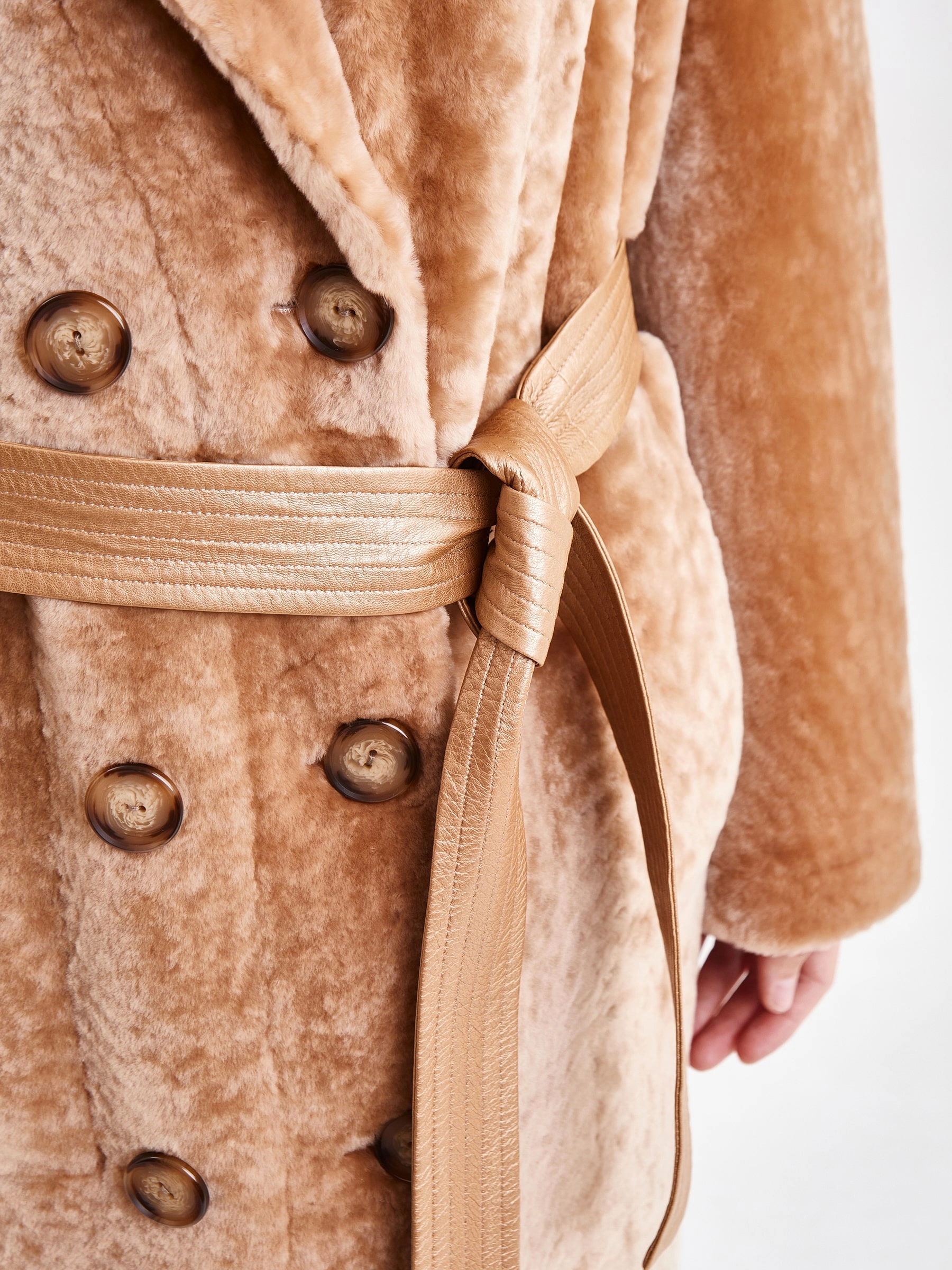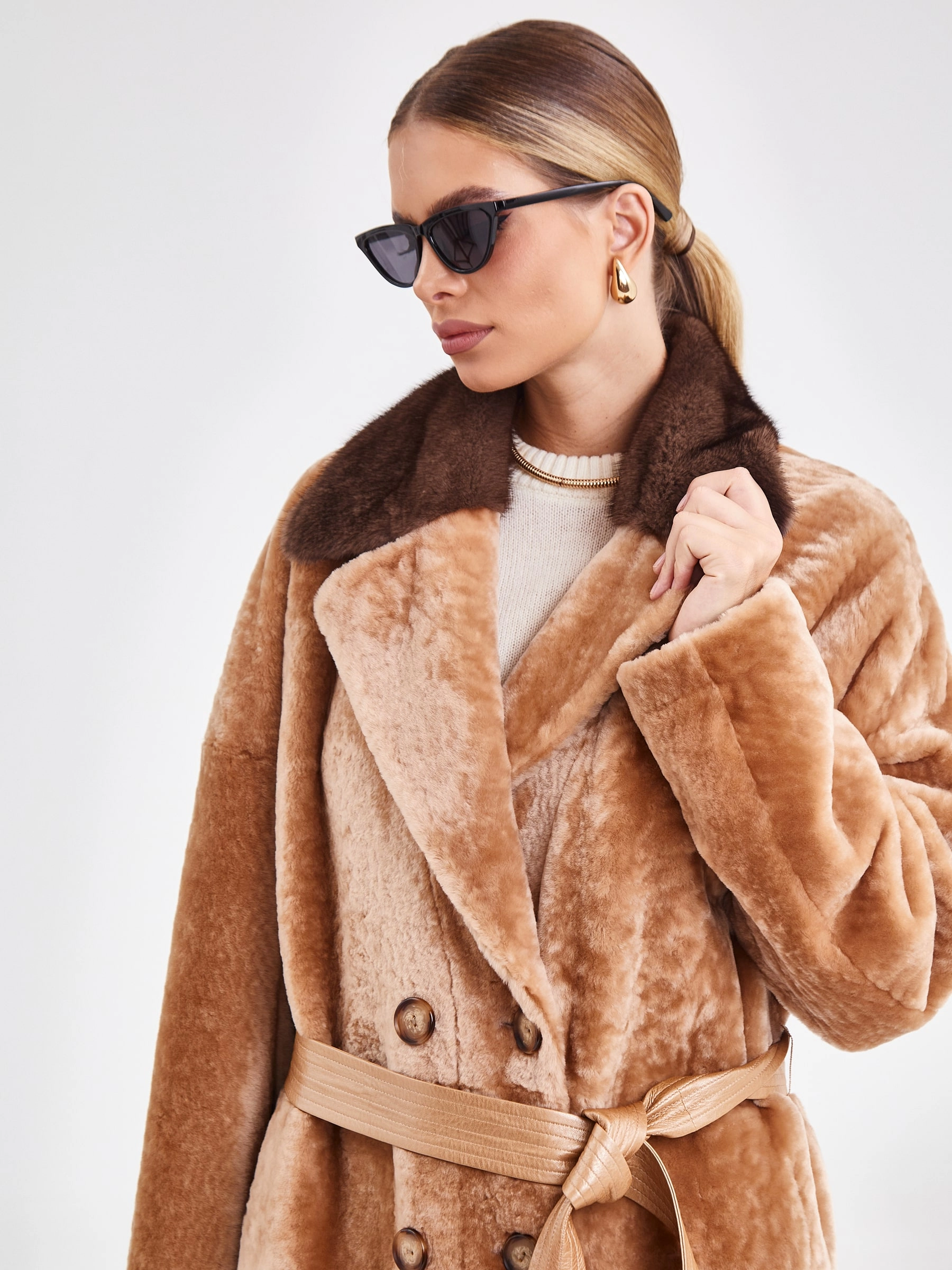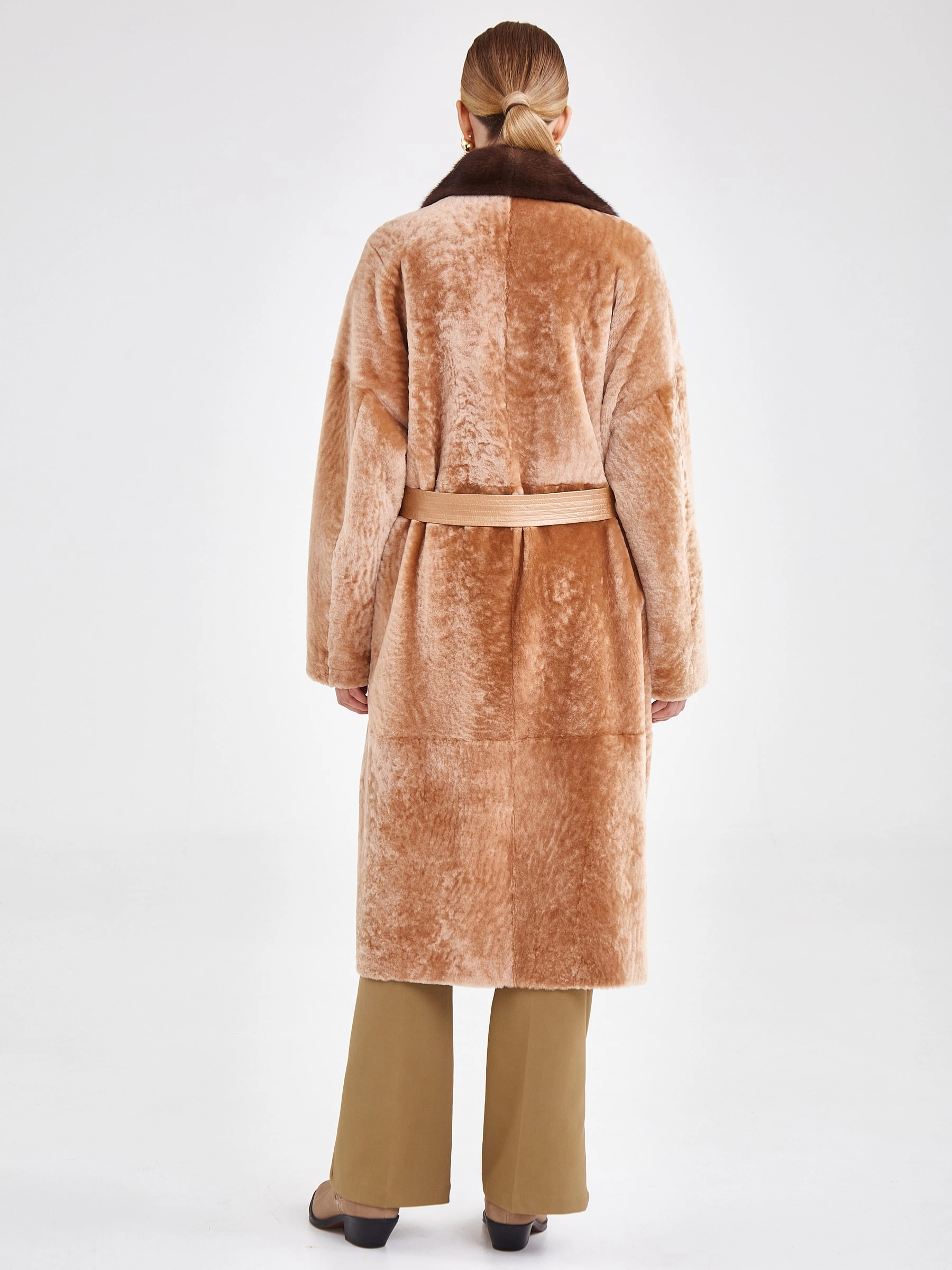 Двубортная двусторонняя шуба из овчины «астраган» и меха норки премиум-класса представляет собой превосходный пример актуальной классики. Эта удлинённая модель (свыше 90 см) прямого кроя со спущенными плечами и широкими лацканами сшита из мягкой плотной овчины: одна сторона — гладкая кожа, а другая — тёплый густой мех. Благодаря особой обработке швов изделие легко трансформируется в элегантную шубу. Застёжка на пуговицы, английский воротник из норки и контрастный пояс из натуральной кожи завершают образ, делая эту шубу универсальным и роскошным выбором для повседневной носки осенью и зимой. Совет стилиста: носите её как лаконичное пальто с джинсами скинни и грубыми ботинками для дерзкого образа в стиле кэжуал или наденьте поверх вечернего платья, добавив лоска любому выходу.