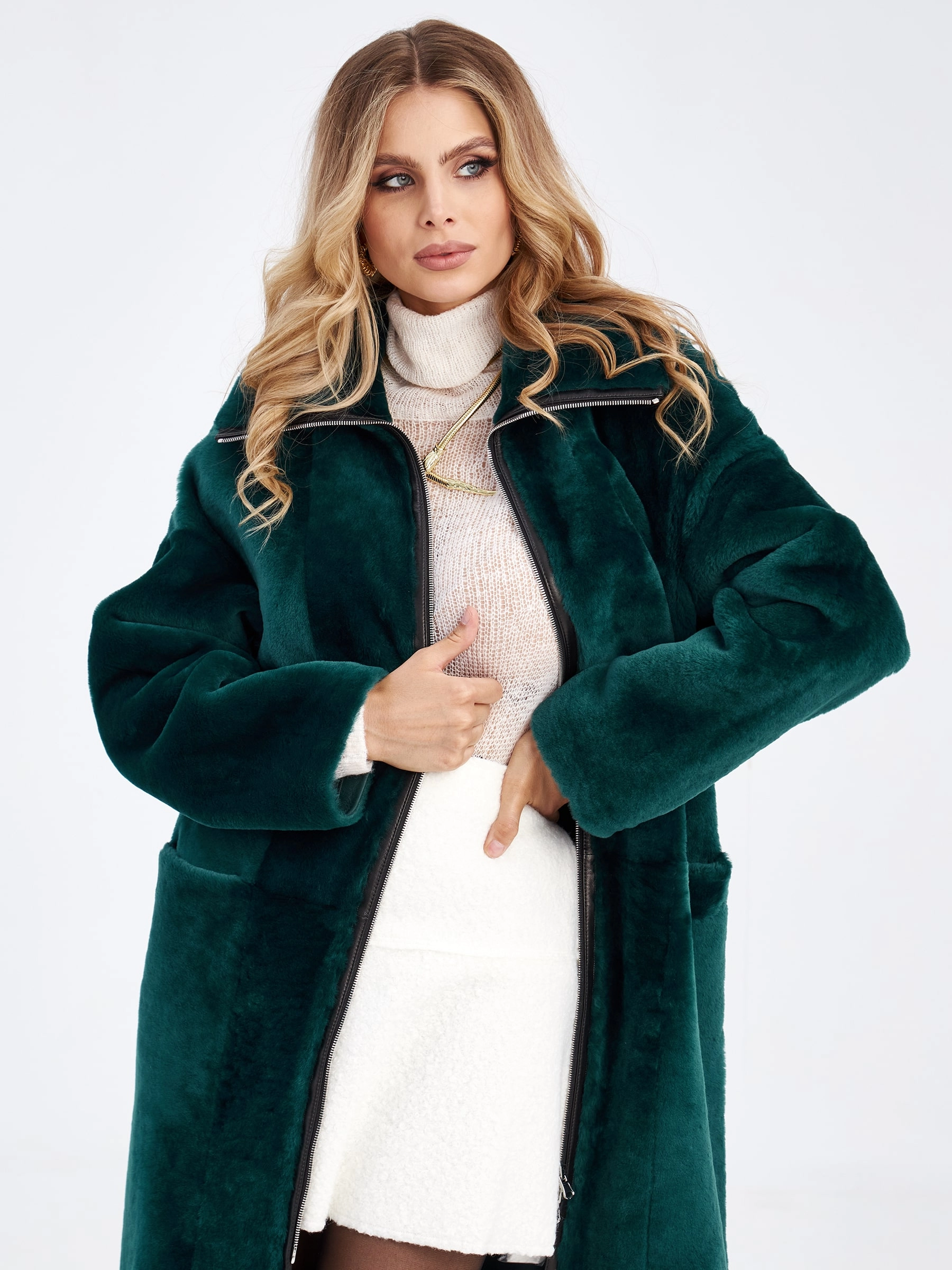 Товар двусторонняя шуба из астрагана для женщин премиум класса 2015н, зеленая, размер 46, артикул 13710 выполнен из овчина "астраган" с застежкой молния. Рассчитан на сезон: осень-зима. Длина изделия 115 см, силуэт прямой.