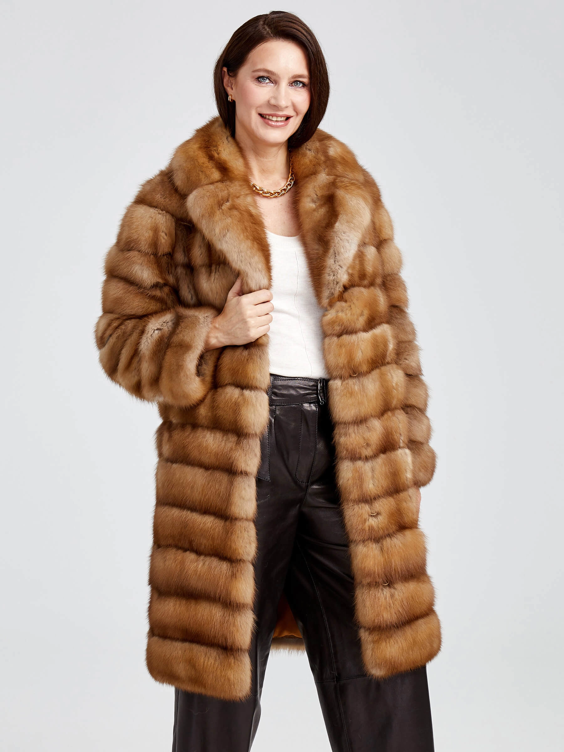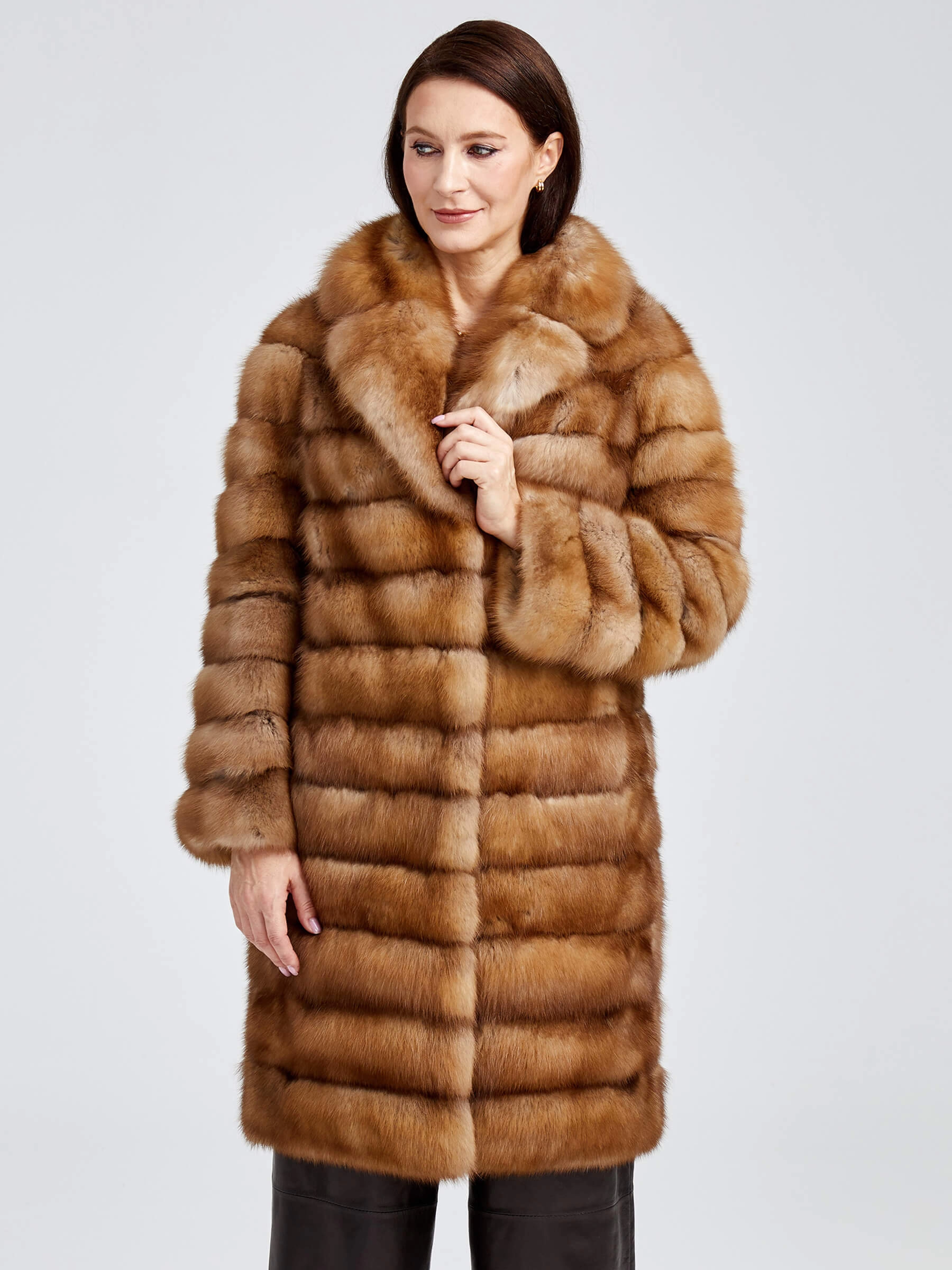 Изысканное пальто длиной 90 см из меха куницы с горизонтальной раскладкой: густой подшёрсток создаёт бархатистое тепло, а невысокий воротник-стойка и застёжка на клипсах подчёркивают классический силуэт. Совет стилиста: сочетайте с кожаными брюками и лаковыми сапогами для вечернего выхода или с кашемировым платьем-миди — невероятная лёгкость и комфорт этой шубы сделают её жемчужиной вашего гардероба. Для тех, кто ценит не только роскошь, но и практичность, где каждый элемент подчинён гармонии стиля и комфорта.