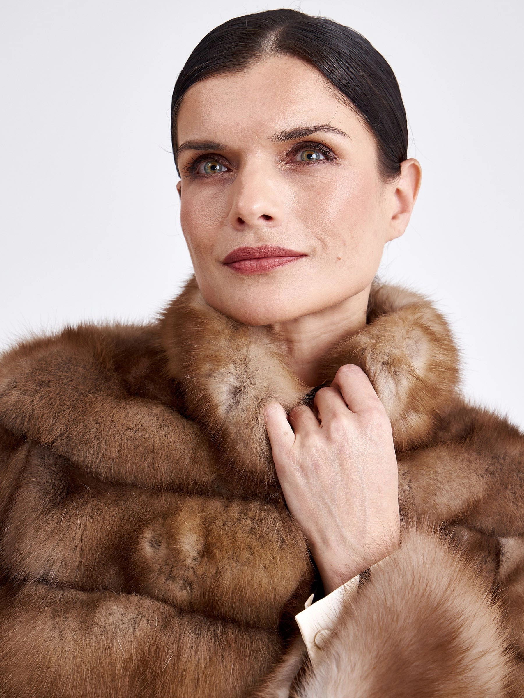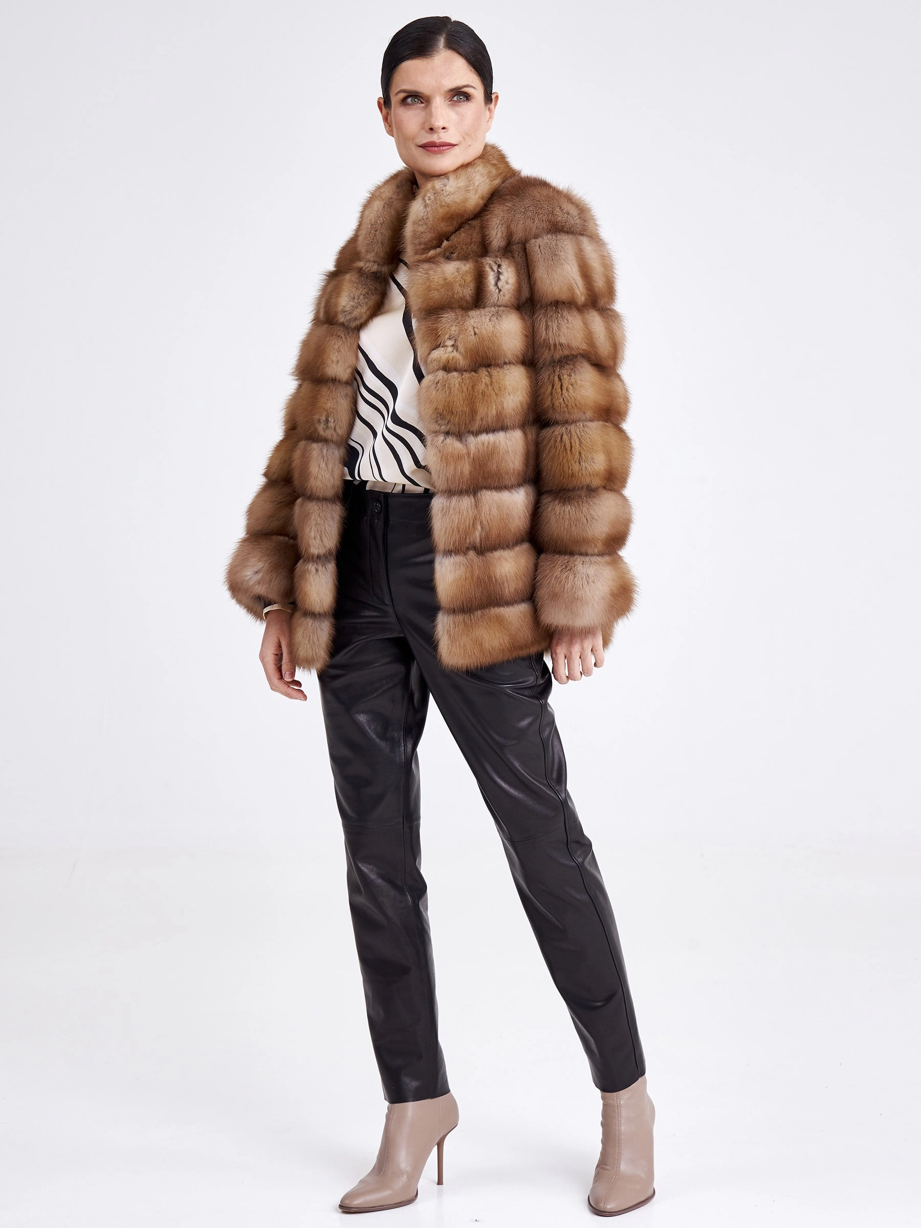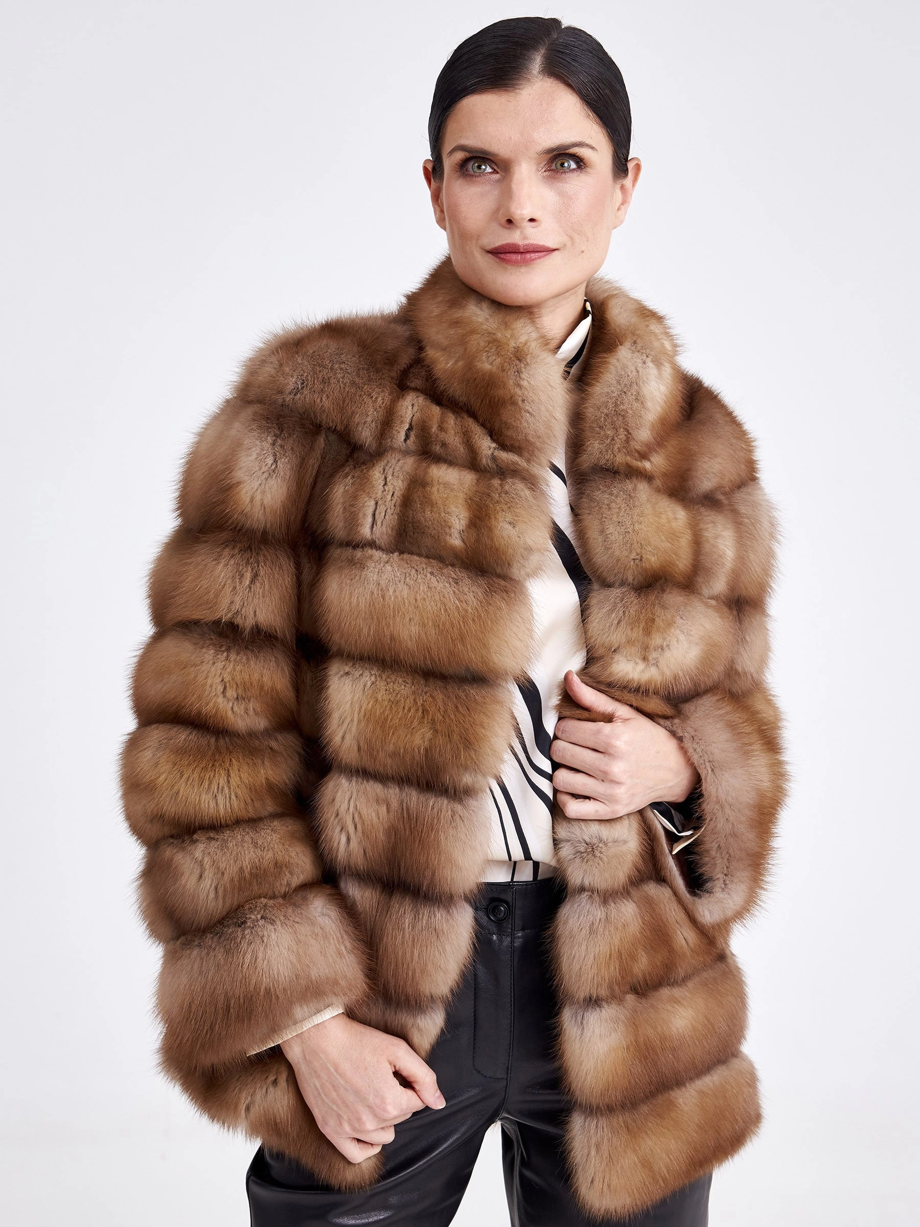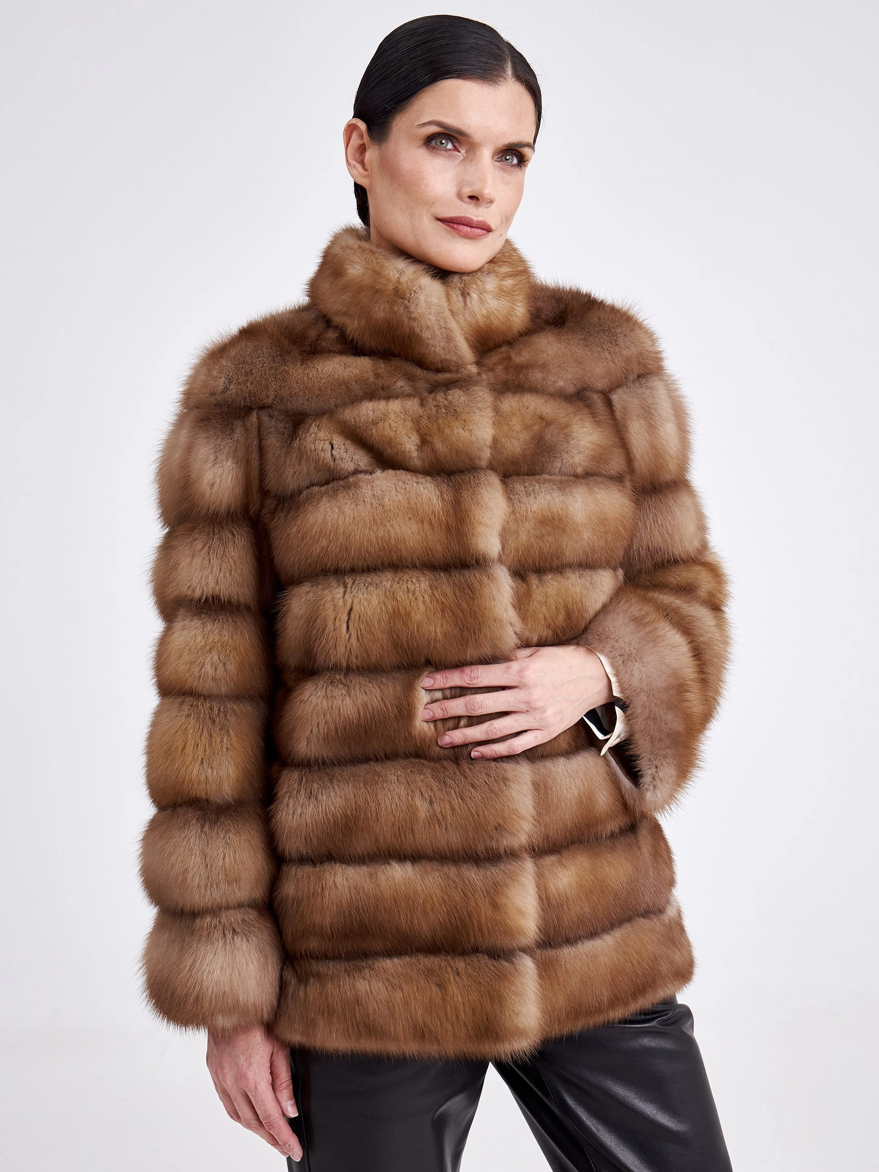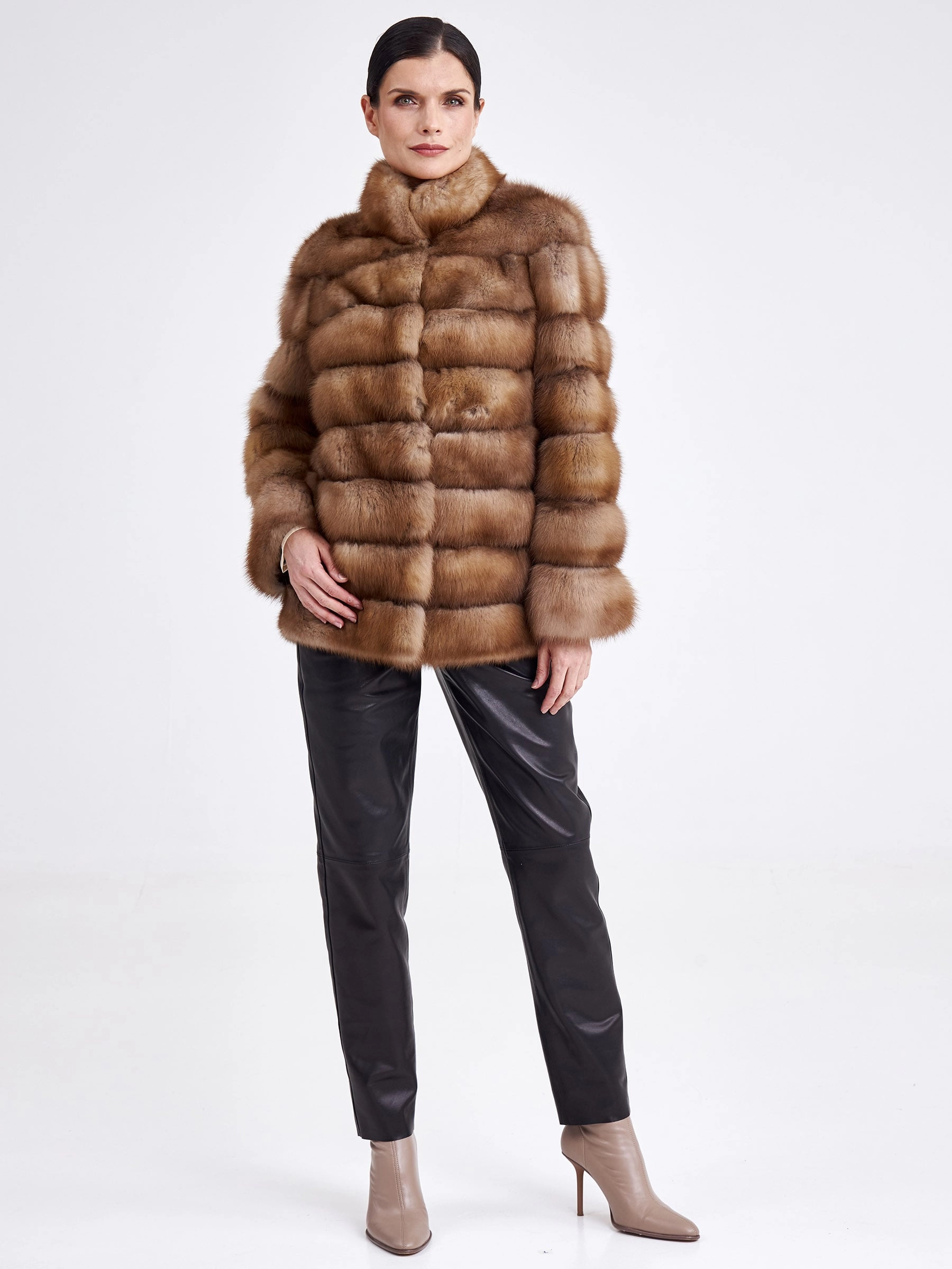 Короткая шуба премиум-класса из густого меха куницы, длиной 51-74 см, в нежном светло-коричневом оттенке — идеальный выбор для тех, кто ценит безупречное качество и зимнюю элегантность. Прямой крой, поперечная раскладка меха и лаконичная стойка создают аккуратный, утончённый силуэт, подчёркивая статусность и изысканность модели. Совет стилиста: эта шуба премиум-класса станет центром любого образа — сочетайте её с однотонной базой в кремовых, бежевых или шоколадных тонах, например, с шерстяными брюками-кюлотами и высокими сапогами из мягкой кожи, чтобы подчеркнуть благородство меха и создать образ сдержанной роскоши, подходящий как для повседневной носки, так и для особых выходов.