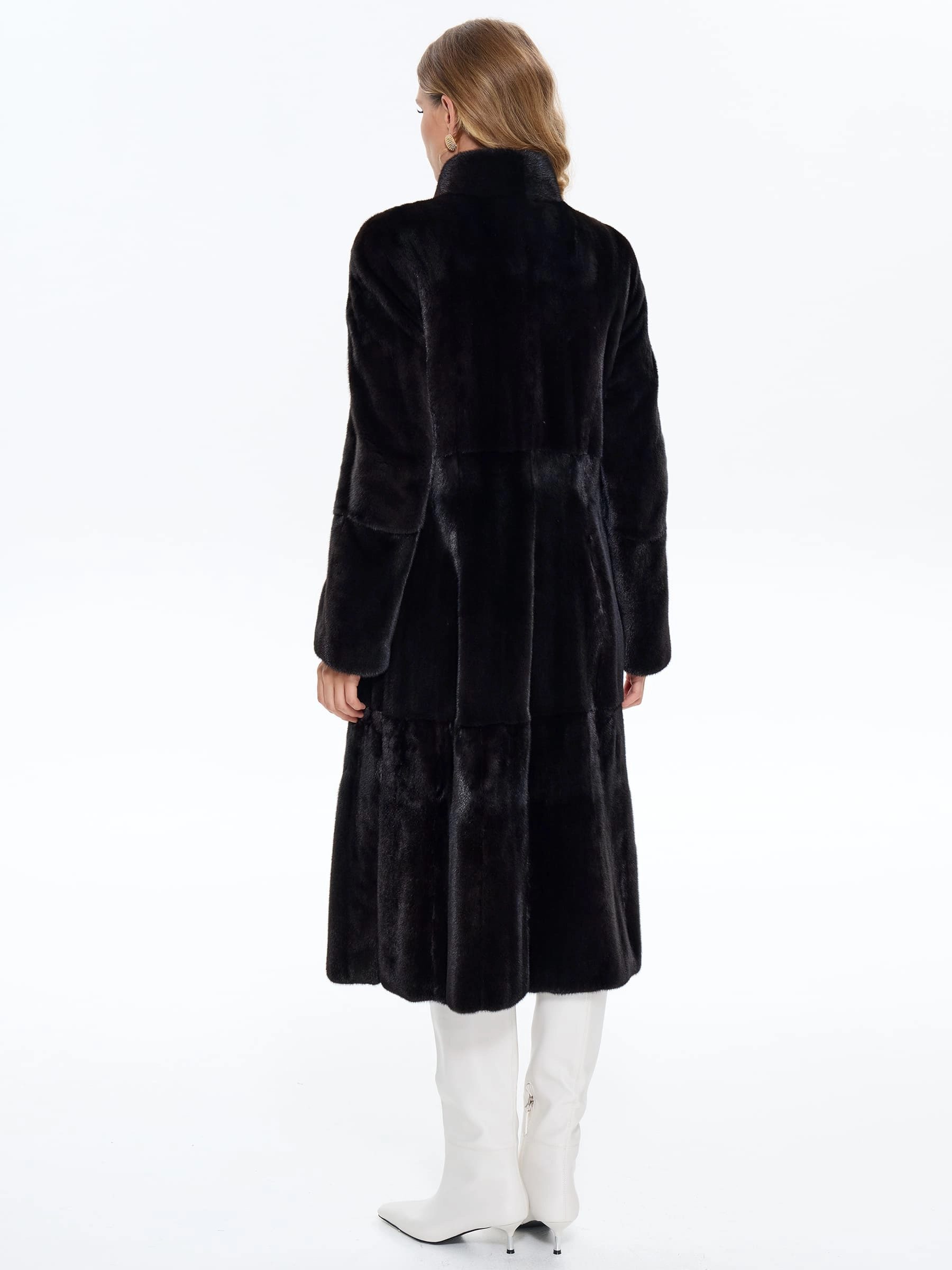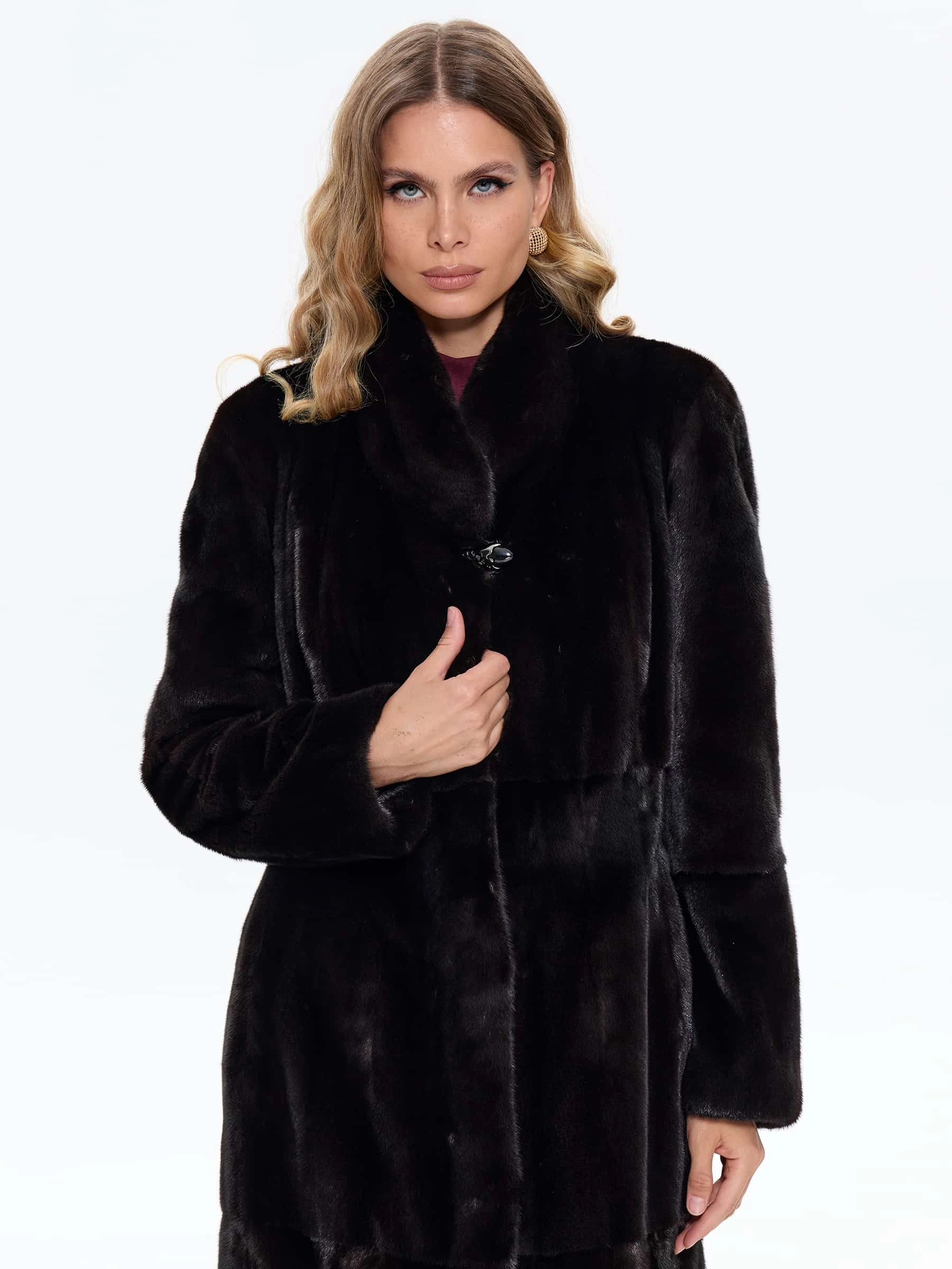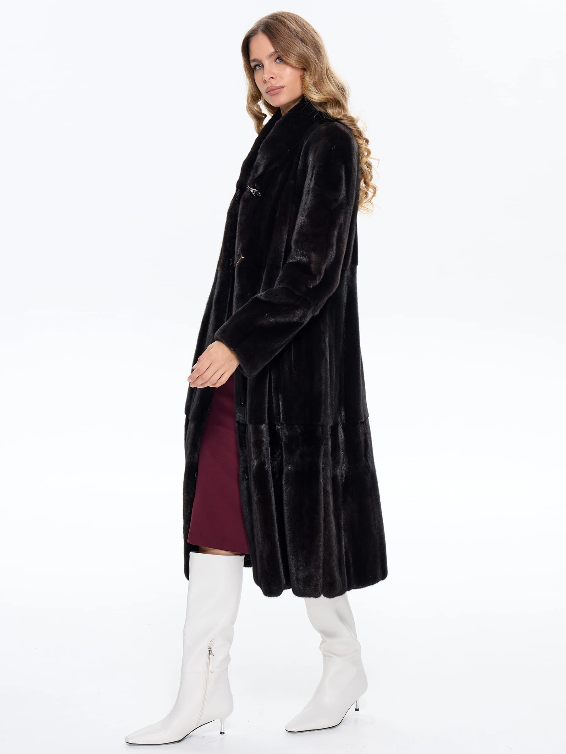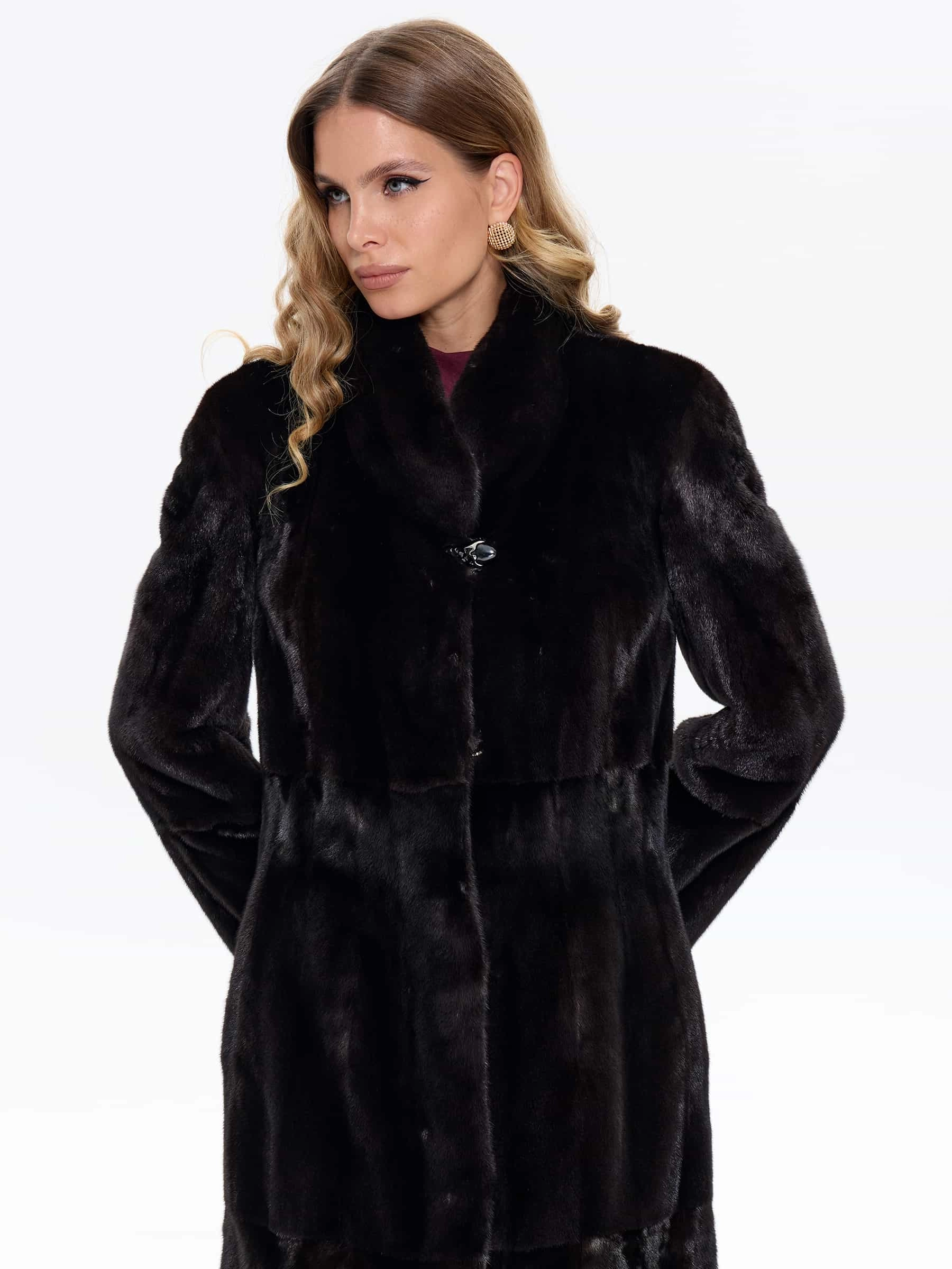 Эта классическая длинная шуба из густого меха норки глубокого черного цвета — истинный образец элегантности и продуманного комфорта для суровой зимы. Полуприлегающий крой с анатомическими вытачками в талии деликатно подчеркивает силуэт, в то время как свободное расклешение от бедра мягко корректирует особенности фигуры, обеспечивая идеальную посадку. Строгий шалевидный воротник-стойка надежно защищает от ветра, а невидимые клипсы с титановым покрытием гарантируют долговечность и безупречный внешний вид изделия. Два боковых кармана добавляют практичности, не нарушая чистоты линий. Совет стилиста: используйте эффектный шалевый воротник как рамку для верхней части образа — надевайте под шубу тонкий кашемировый водолазочный комплект или блузу с высоким горлом, чтобы создать вертикаль и избежать громоздкости в области шеи. Длина до щиколотки (115 см) требует особого подхода к обуви: выбирайте изящные сапоги на устойчивом каблуке или элегантные ботфорты с узким голенищем — это сохранит стройность и изящество линий,