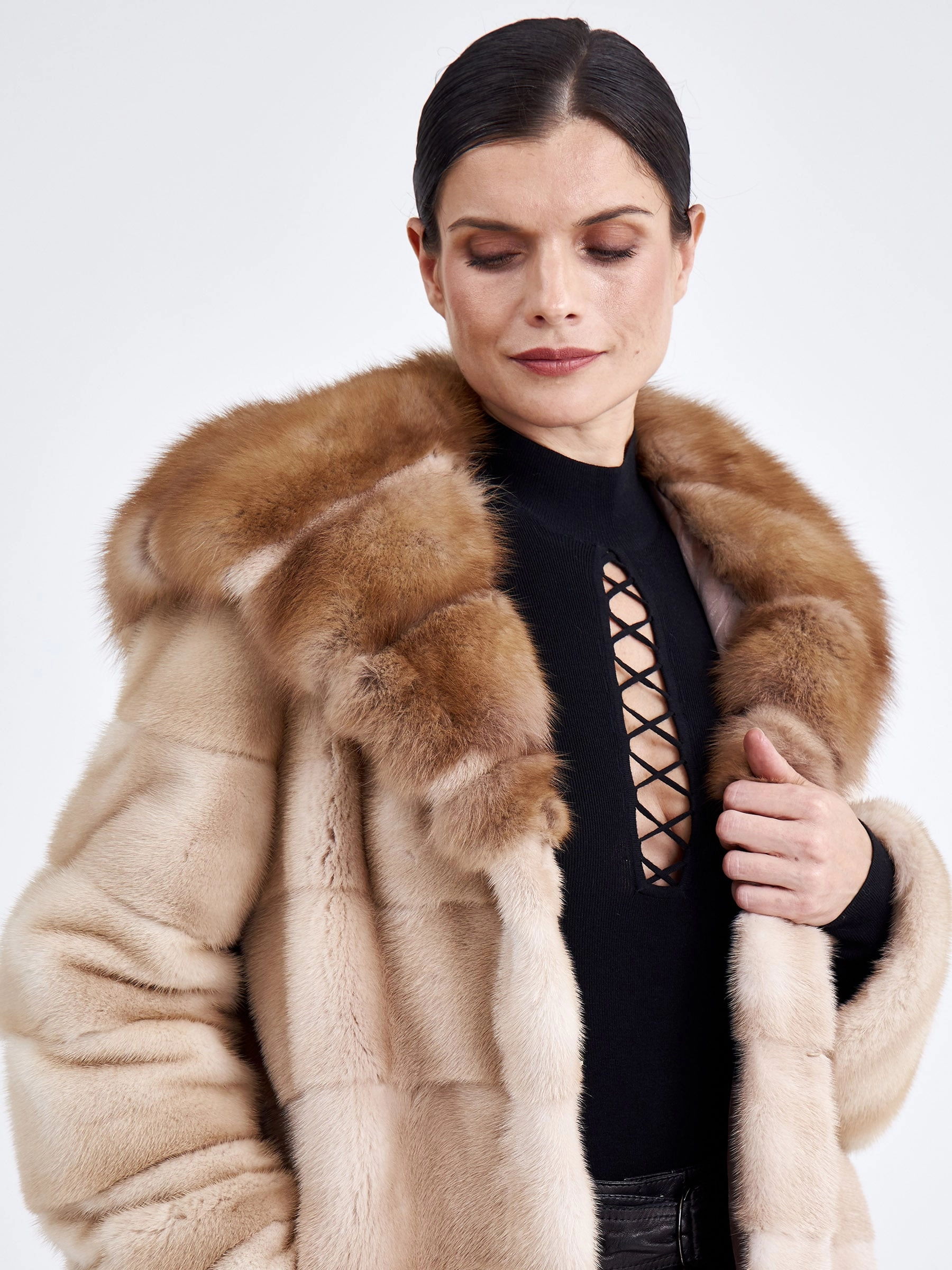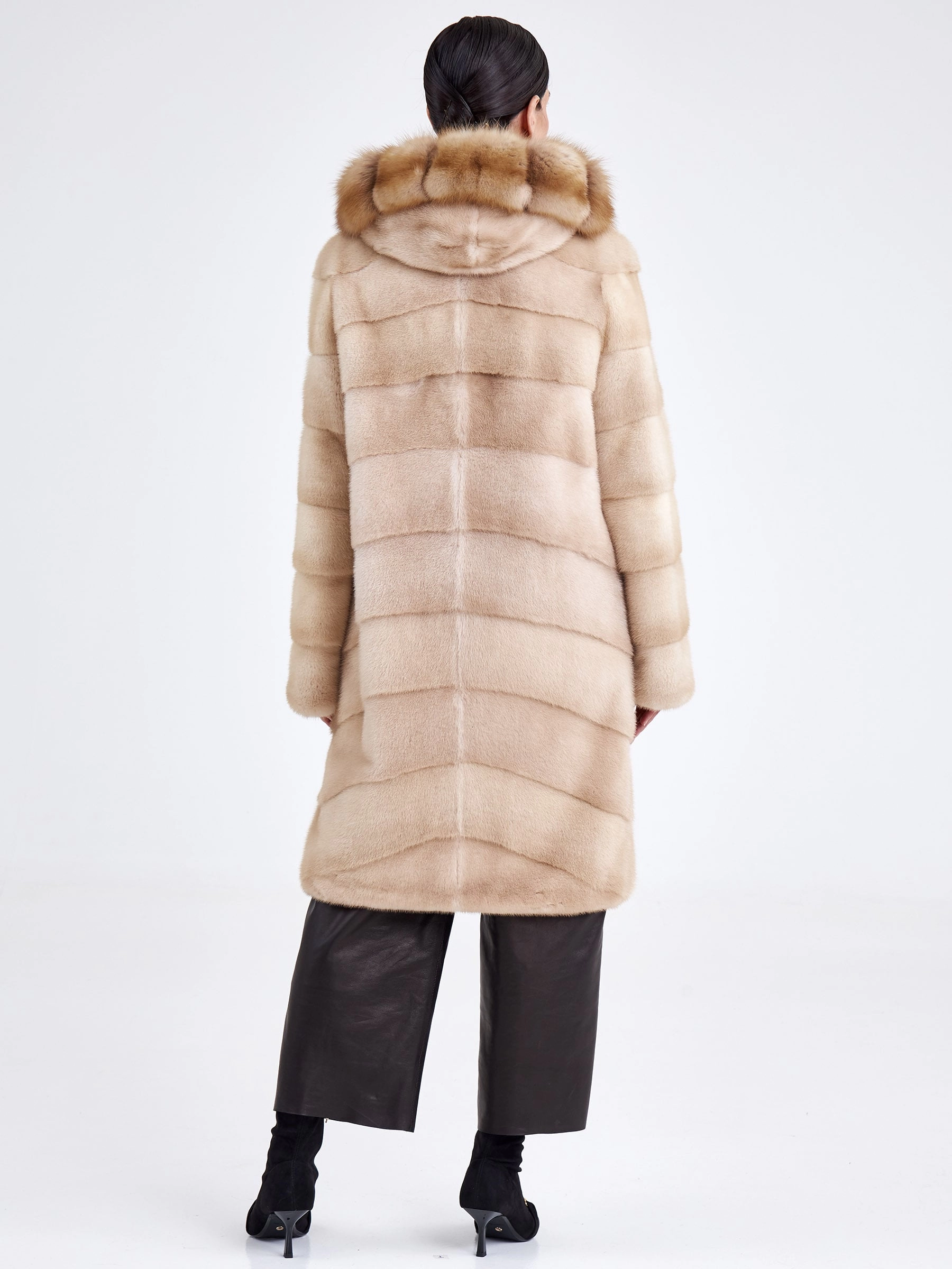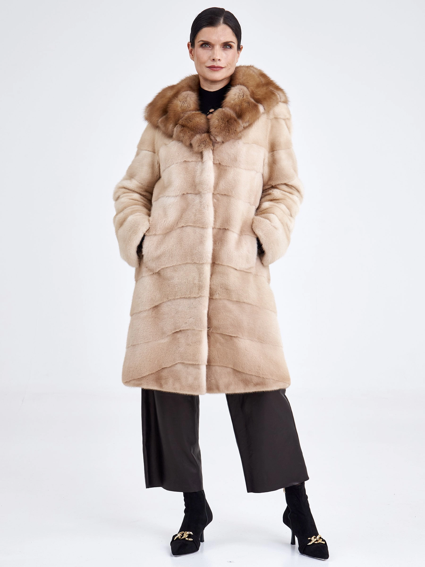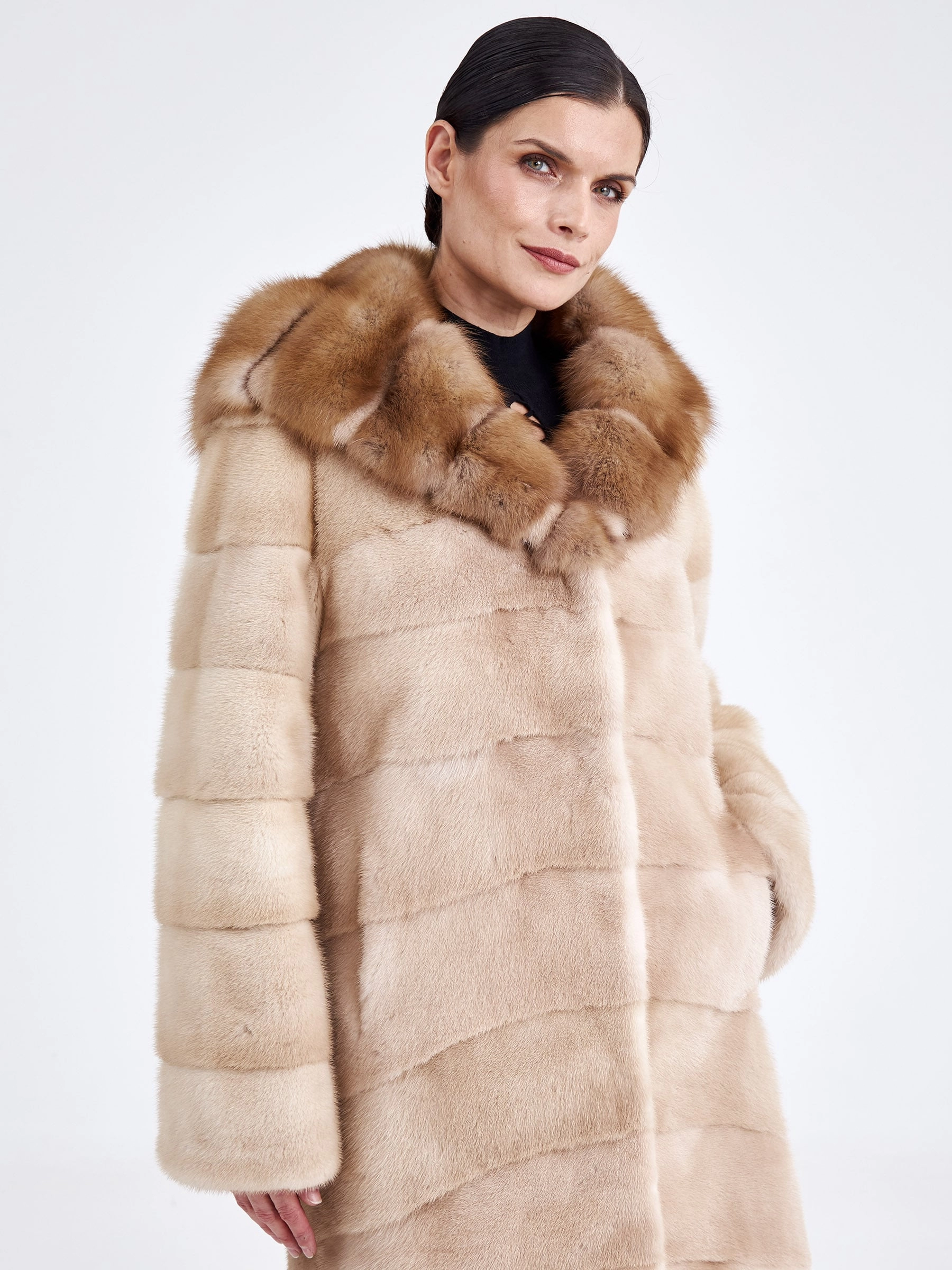 Женская шуба из светло-коричневой норки с отделкой капюшона из куницы — это идеальное сочетание повседневного комфорта и утончённой эстетики. Модель прямого кроя выполнена из нежной низковорсовой норки с поперечной выкладкой меха, а её выразительным акцентом стал глубокий объёмный капюшон, декорированный шелковистым мехом куницы. Втачной рукав, застёжка на клипсах и подкладка из 100% вискозы обеспечивают удобство и тепло даже в самую суровую зиму. Совет стилиста: мягкая нейтральная гамма и чистые линии делают эту шубу невероятно универсальной — наденьте её поверх плотных джинсов и свитера оверсайз для повседневного casual-образа или сочетайте с однотонным платьем-миди и высокими сапогами, чтобы подчеркнуть женственный силуэт и благородную текстуру меха.