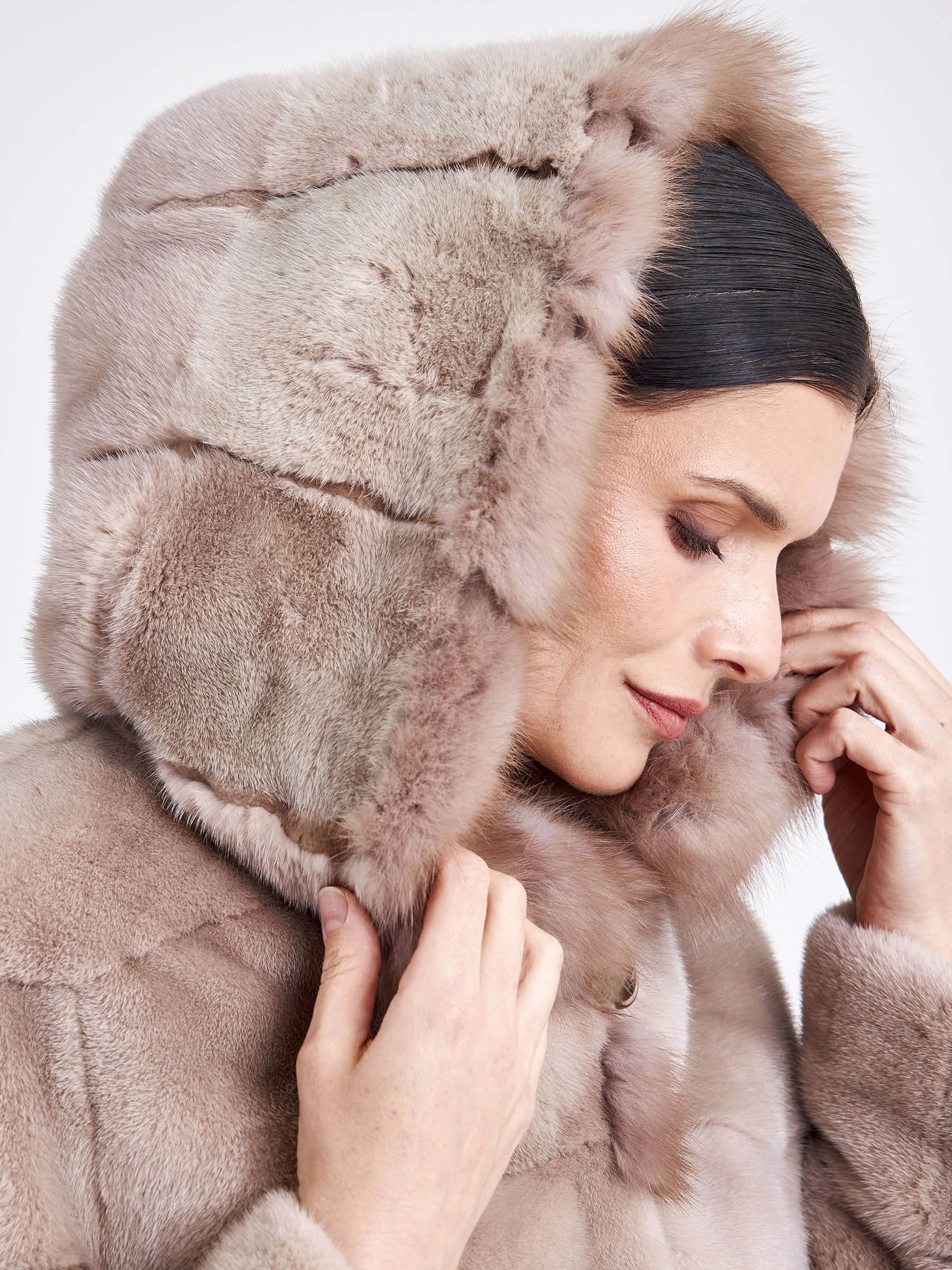 Женская шуба из светло-коричневой норки с отделкой капюшона из куницы — это идеальное сочетание повседневного комфорта и утончённой эстетики. Модель прямого кроя выполнена из нежной низковорсовой норки с поперечной выкладкой меха, а её выразительным акцентом стал глубокий объёмный капюшон, декорированный шелковистым мехом куницы. Втачной рукав, застёжка на клипсах и подкладка из 100% вискозы обеспечивают удобство и тепло даже в самую суровую зиму. Совет стилиста: мягкая нейтральная гамма и чистые линии делают эту шубу невероятно универсальной — наденьте её поверх плотных джинсов и свитера оверсайз для повседневного casual-образа или сочетайте с однотонным платьем-миди и высокими сапогами, чтобы подчеркнуть женственный силуэт и благородную текстуру меха.