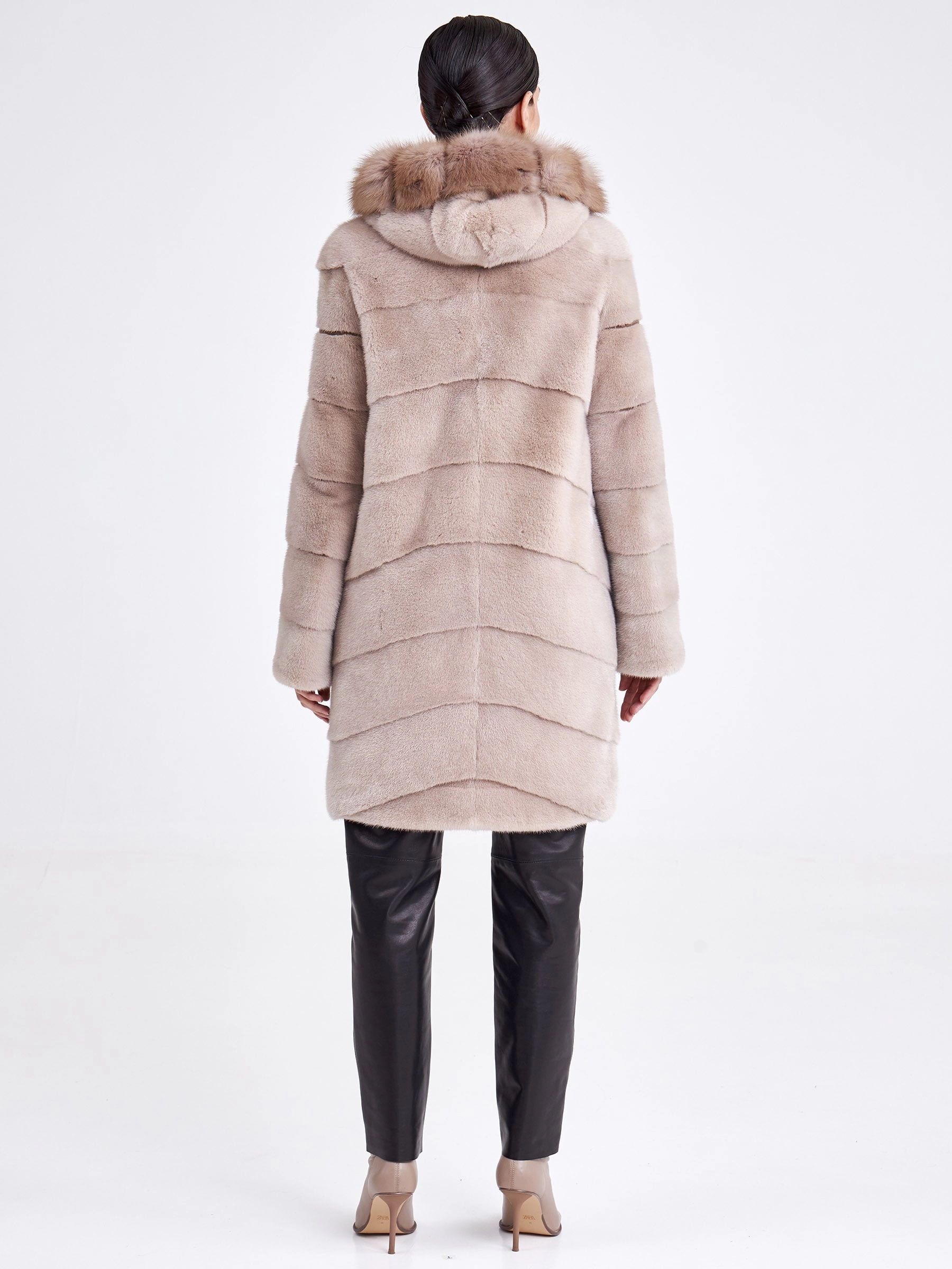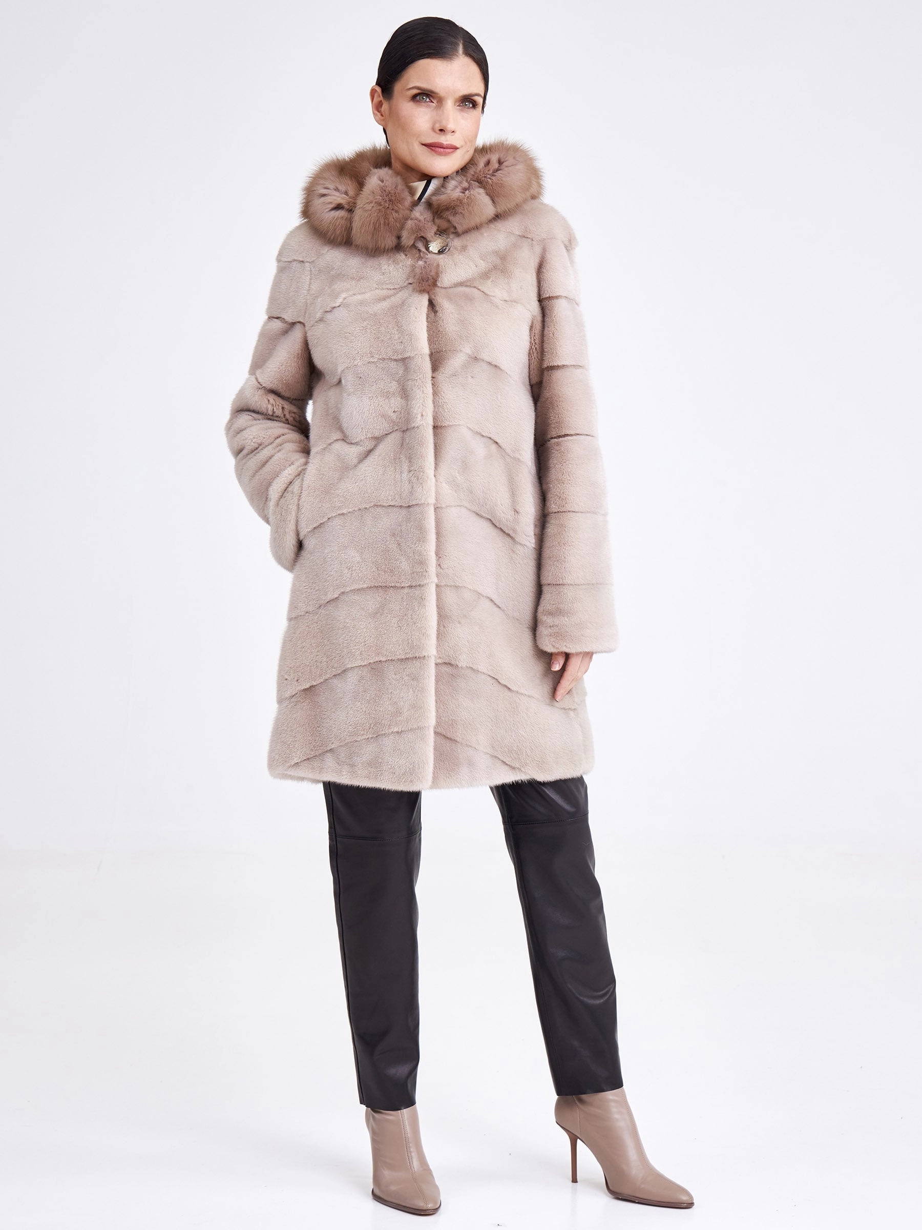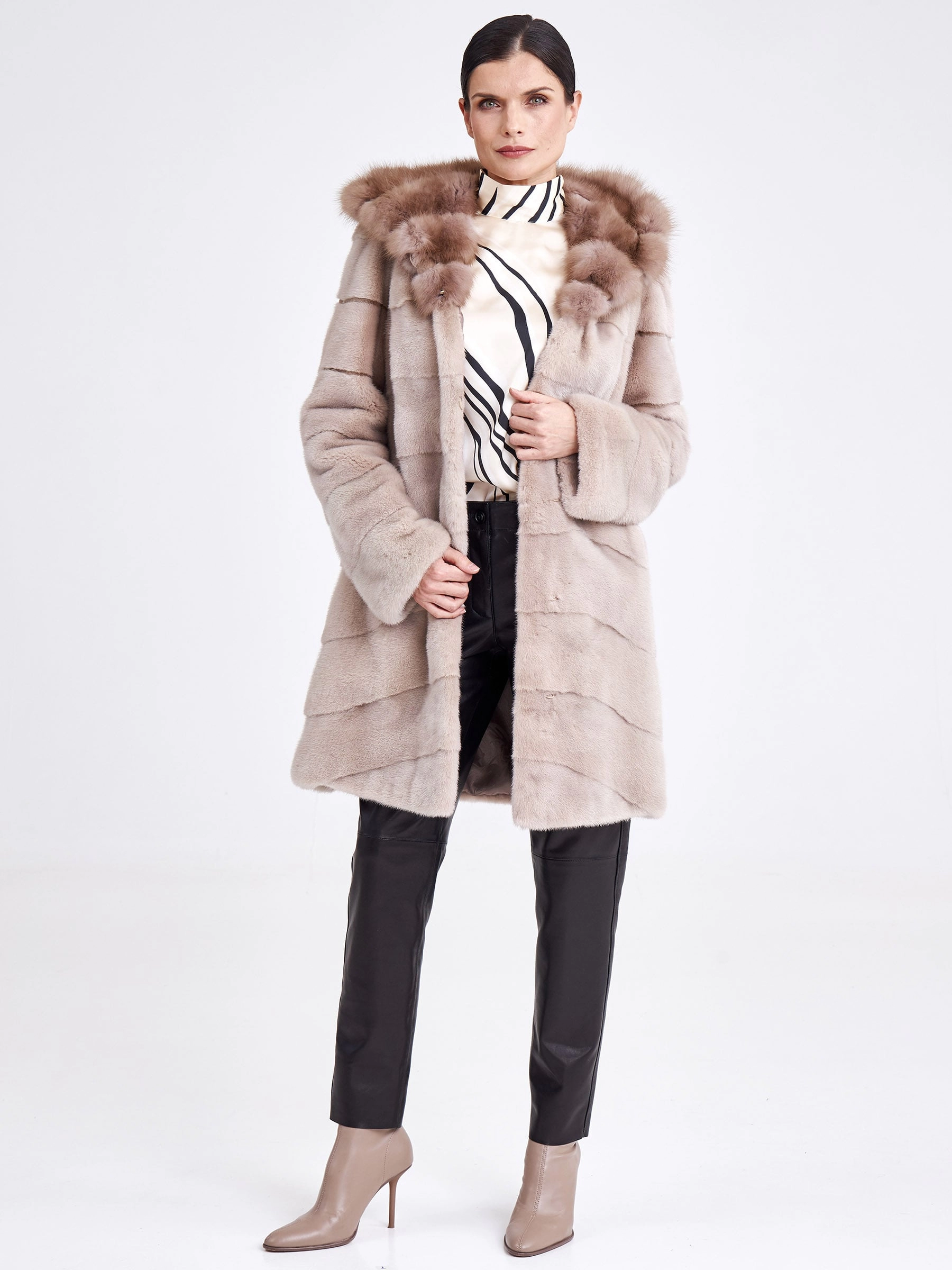 Шуба из меха норки с отделкой капюшона из меха куницы для женщин 2а(кк), светло-коричневая, размер 44, артикул 33250