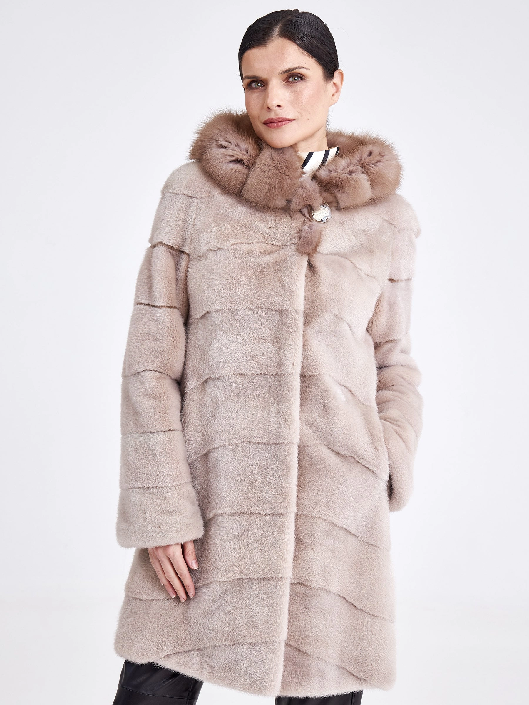 Товар шуба из меха норки с отделкой капюшона из меха куницы для женщин 2а(кк), светло-коричневая, размер 44, артикул 33250 выполнен из норка крашенной с застежкой клипсы. Рассчитан на сезон: зима. Длина изделия свыше 90 см, силуэт прямой.