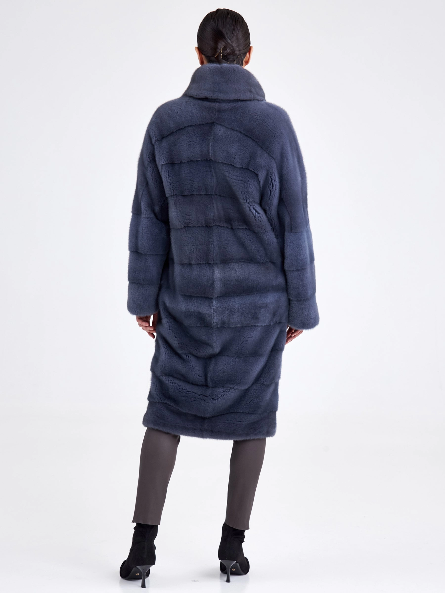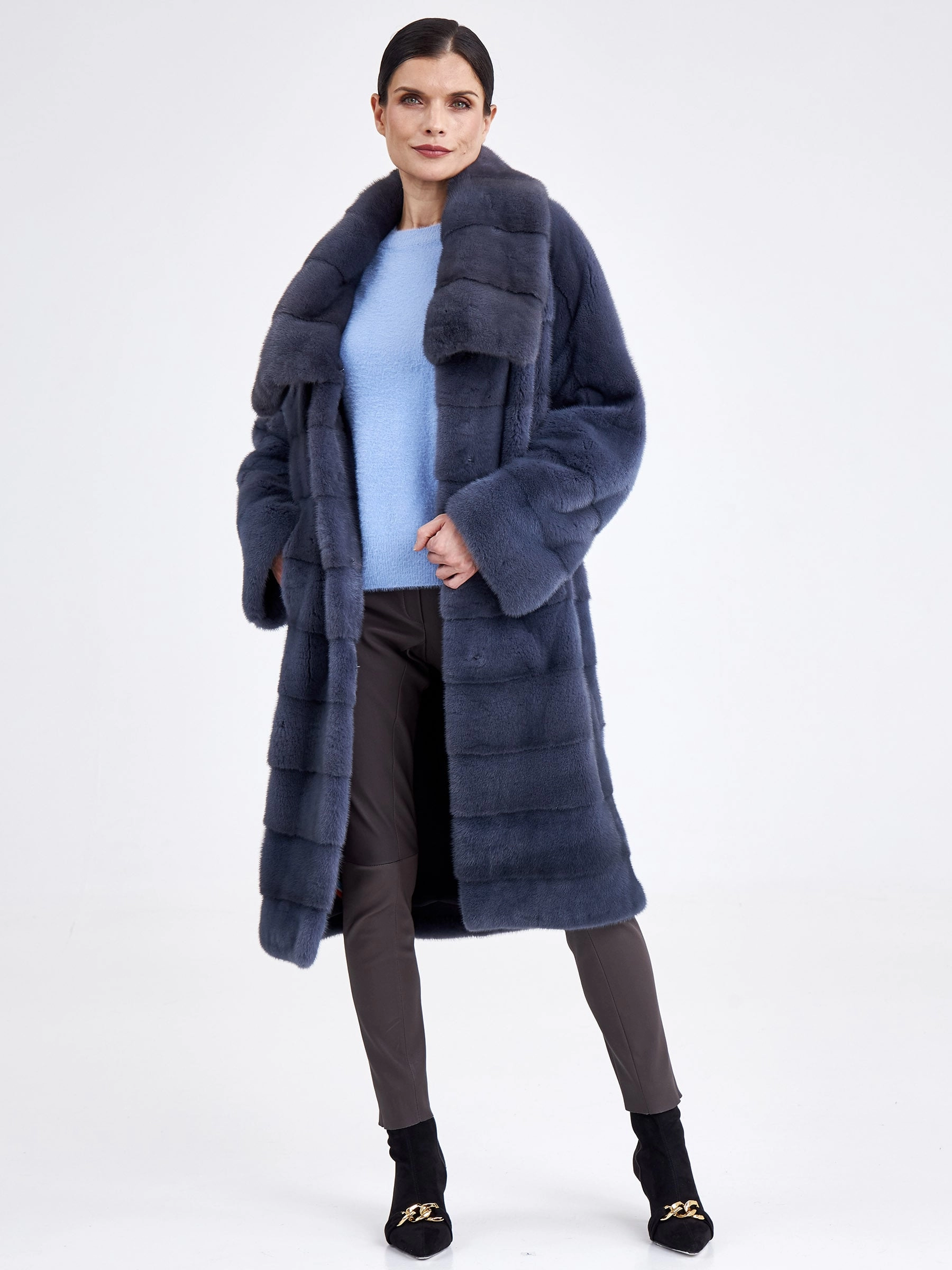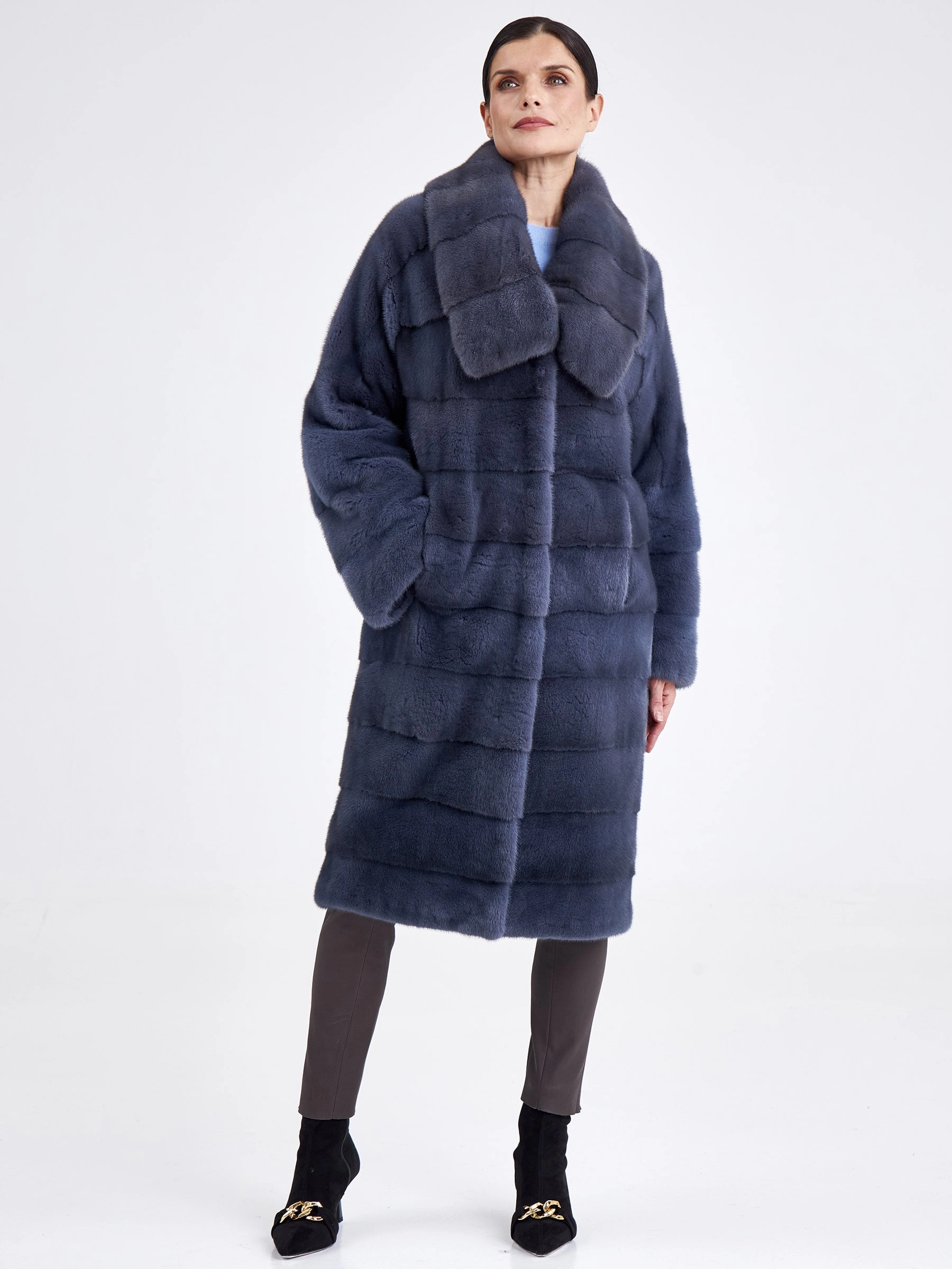 Изысканной альтернативой для суровой зимы станет длинная шуба из крашеной норки в сером цвете. Модель прямого кроя с поперечной раскладкой меха создаёт стройный вертикальный силуэт, а рукав реглан и глубокий воротник-апаш придают образу непринуждённую элегантность. Застёжка на клипсы обеспечивает удобство, а длина свыше 90 см гарантирует исключительное тепло и царственную пластику движений. Совет стилиста: эта шуба — готовый statement-образ, который не требует сложных комбинаций. Носите её как платье, подобрав тонкое водолазное платье-чехол и высокие сапоги-ботфорты, чтобы подчеркнуть её роскошную длину и фактуру. Добавьте объёмные кожаные перчатки и минималистичную сумку-кроссбоди для создания безупречного баланса между уютом, теплом и современной лаконичностью.