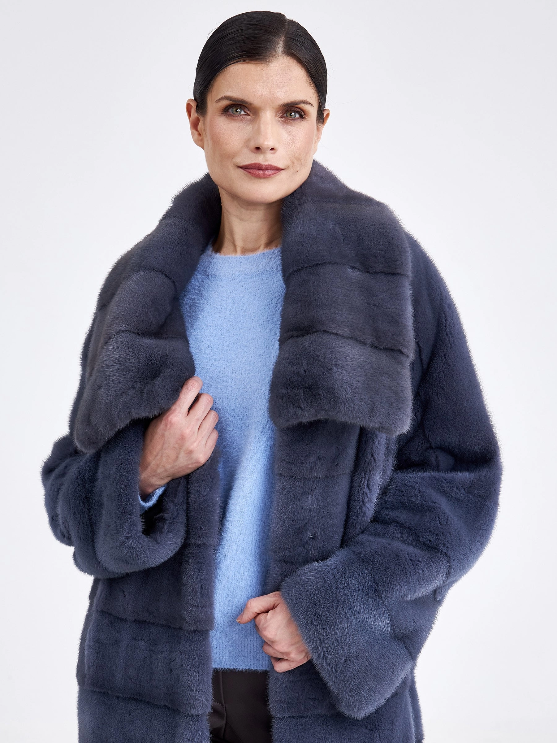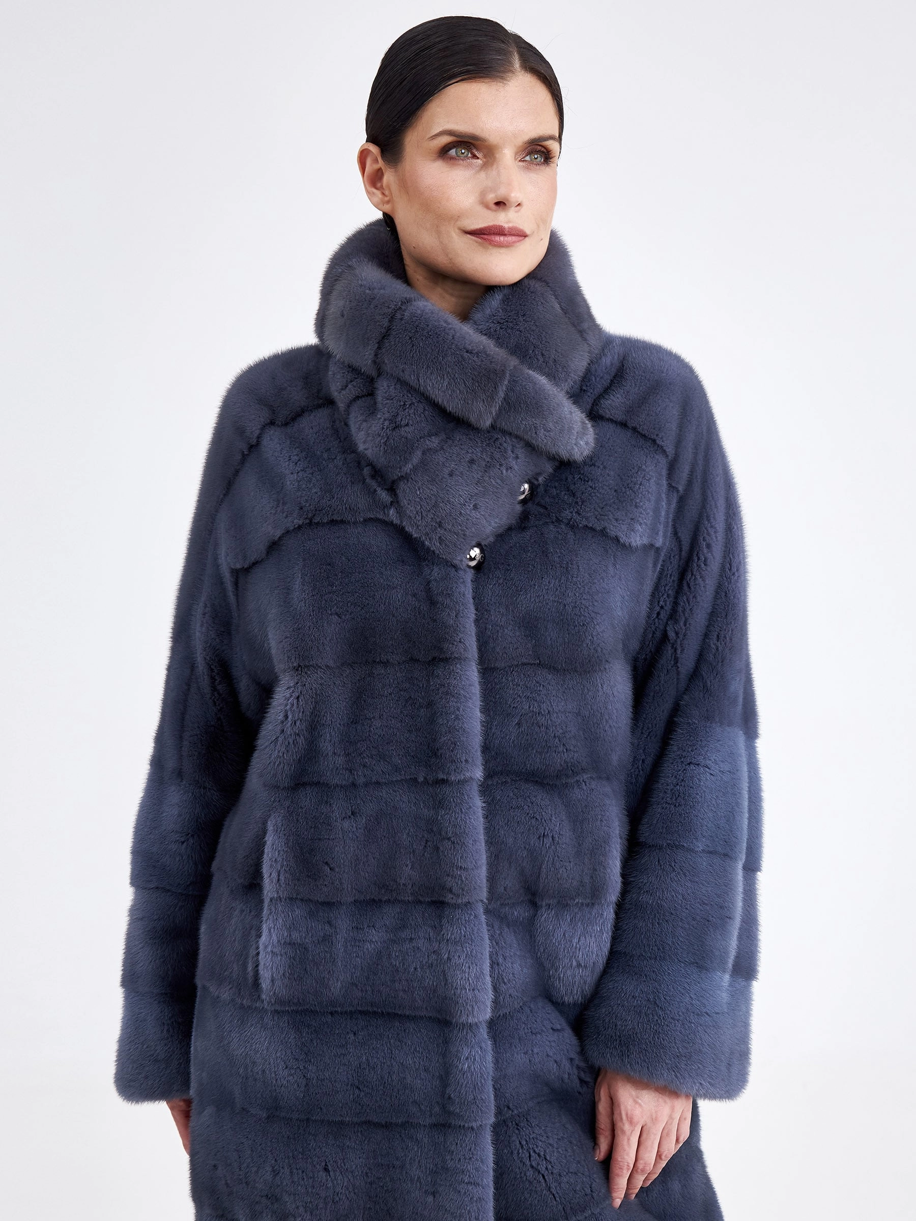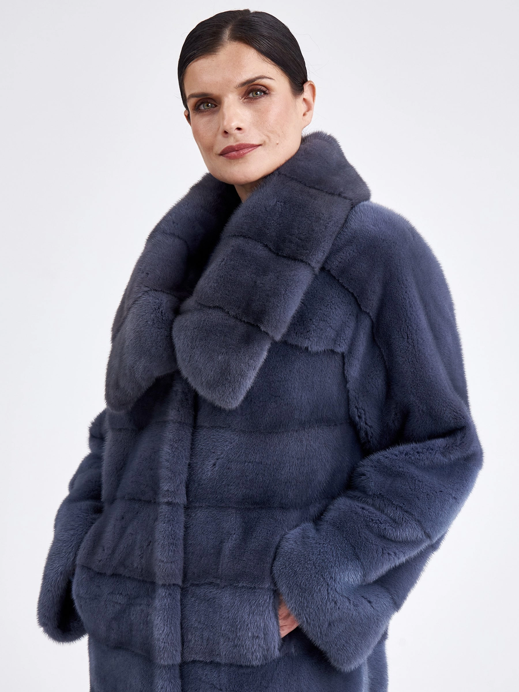 Изысканной альтернативой для суровой зимы станет длинная шуба из крашеной норки в сером цвете. Модель прямого кроя с поперечной раскладкой меха создаёт стройный вертикальный силуэт, а рукав реглан и глубокий воротник-апаш придают образу непринуждённую элегантность. Застёжка на клипсы обеспечивает удобство, а длина свыше 90 см гарантирует исключительное тепло и царственную пластику движений. Совет стилиста: эта шуба — готовый statement-образ, который не требует сложных комбинаций. Носите её как платье, подобрав тонкое водолазное платье-чехол и высокие сапоги-ботфорты, чтобы подчеркнуть её роскошную длину и фактуру. Добавьте объёмные кожаные перчатки и минималистичную сумку-кроссбоди для создания безупречного баланса между уютом, теплом и современной лаконичностью.