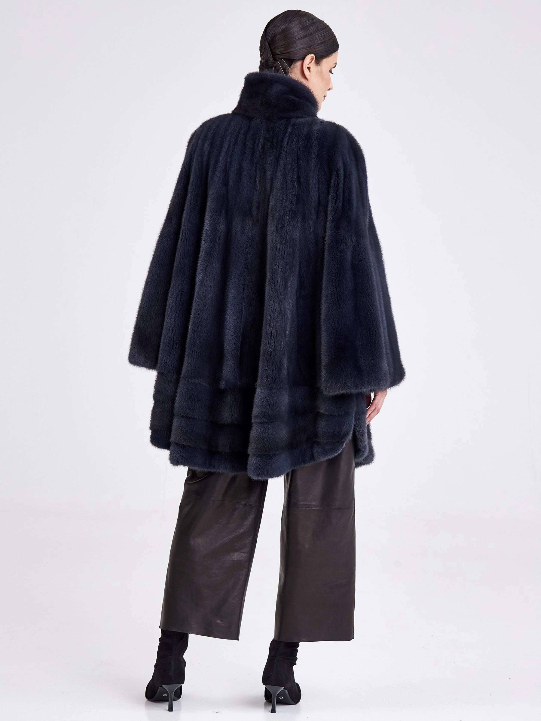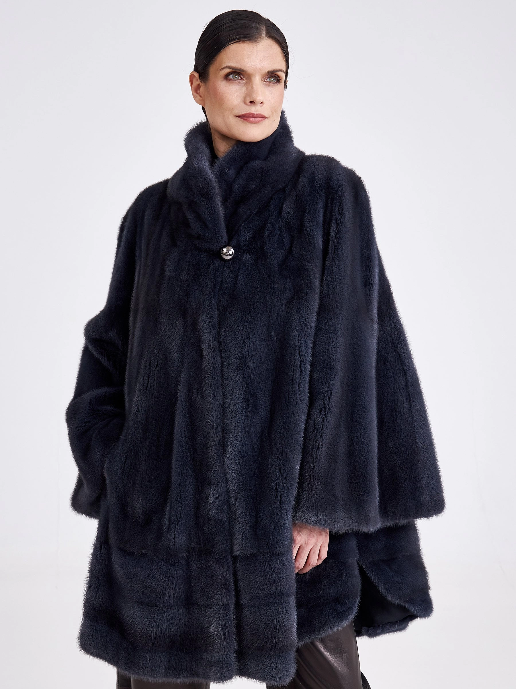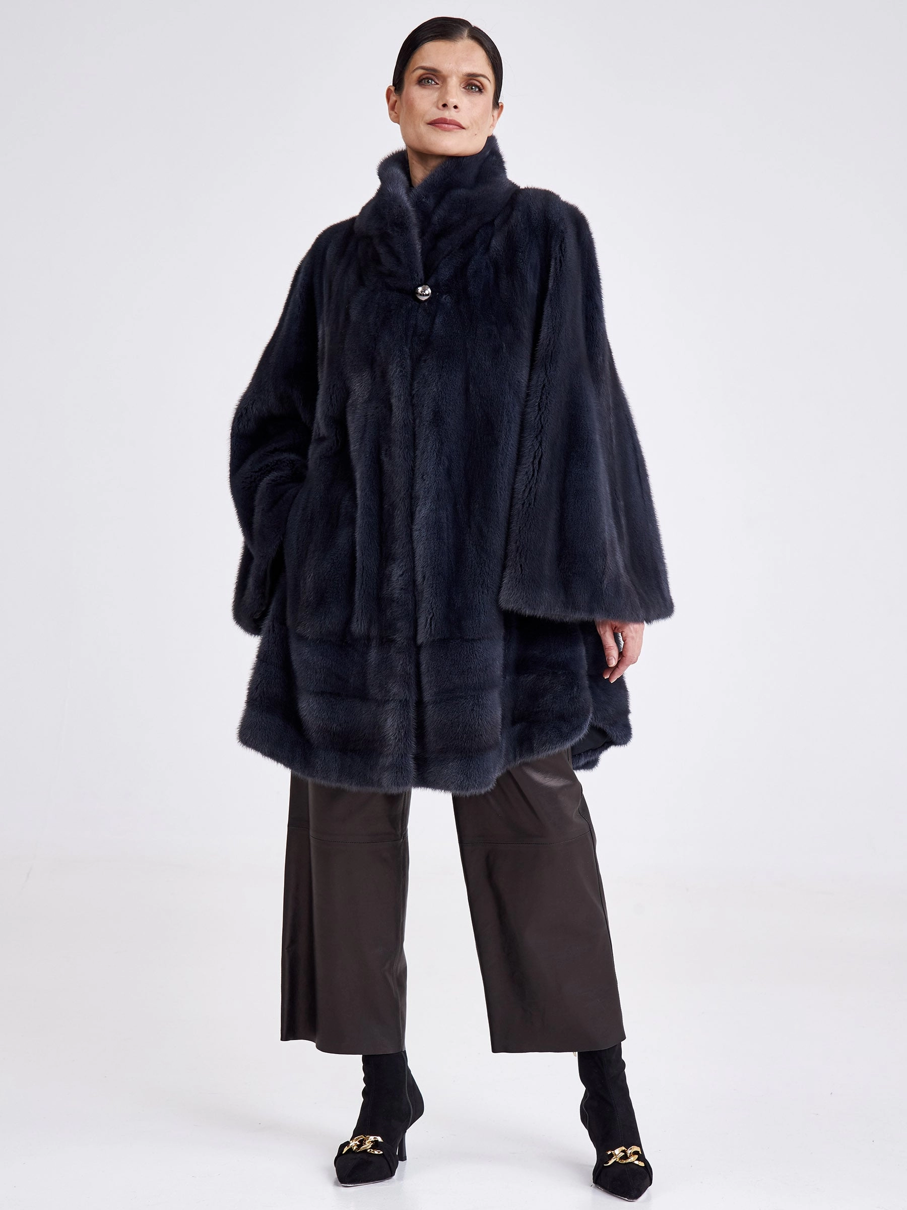 Невероятно стильное полупальто свободного кроя выполнено из низковорсовой шелковистой норки, окрашенной в глубокий оттенок графита. Модель максимальной длины создаёт элегантный зимний силуэт и сконструирована с применением двух техник выкладки меха: поперечной в нижней части и пластин в роспуск — в верхней, что обеспечивает идеальную пластичность, лёгкость и тепло. Лаконичный дизайн с мягким воротником апаш, застёжкой на клипсах и широкими рукавами, не сковывающими движения, подчёркивает благородство материала и современную эстетику. Практичная подкладка из стопроцентной вискозы добавляет комфорта, делая эту вещь безупречным выбором для повседневной носки в холодный сезон. Совет стилиста: универсальный цвет «графит» и чистый силуэт позволяют играть с контрастами — сочетайте эту шубу с объёмными свитерами и джинсами для непринуждённого лука, а для вечернего выхода с тонким водолазным платьем-футляром и стильными ботильонами на каблуке, следуя главному правилу: под свободный крой выбирайте облегающий или узкий