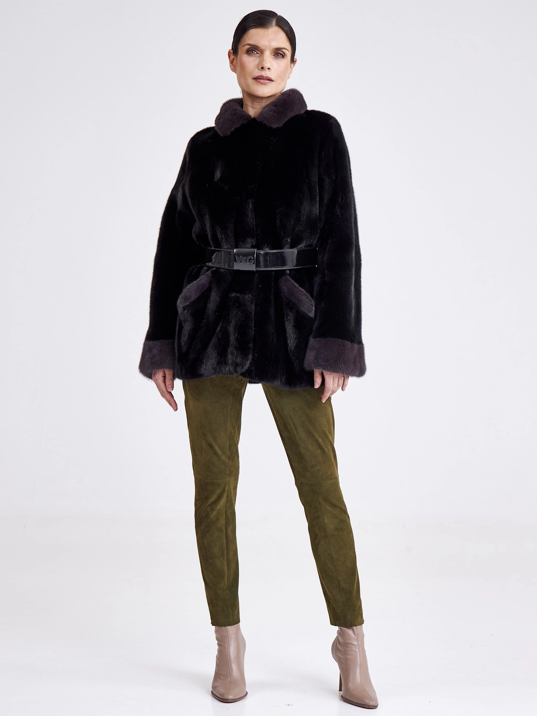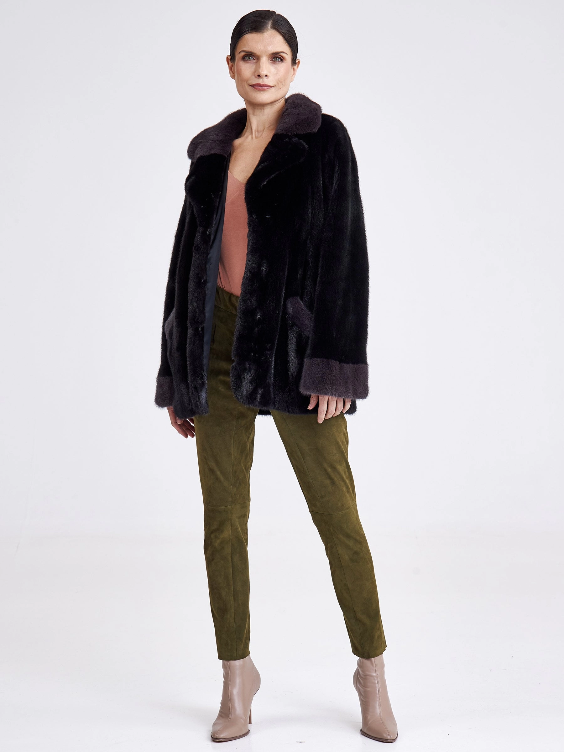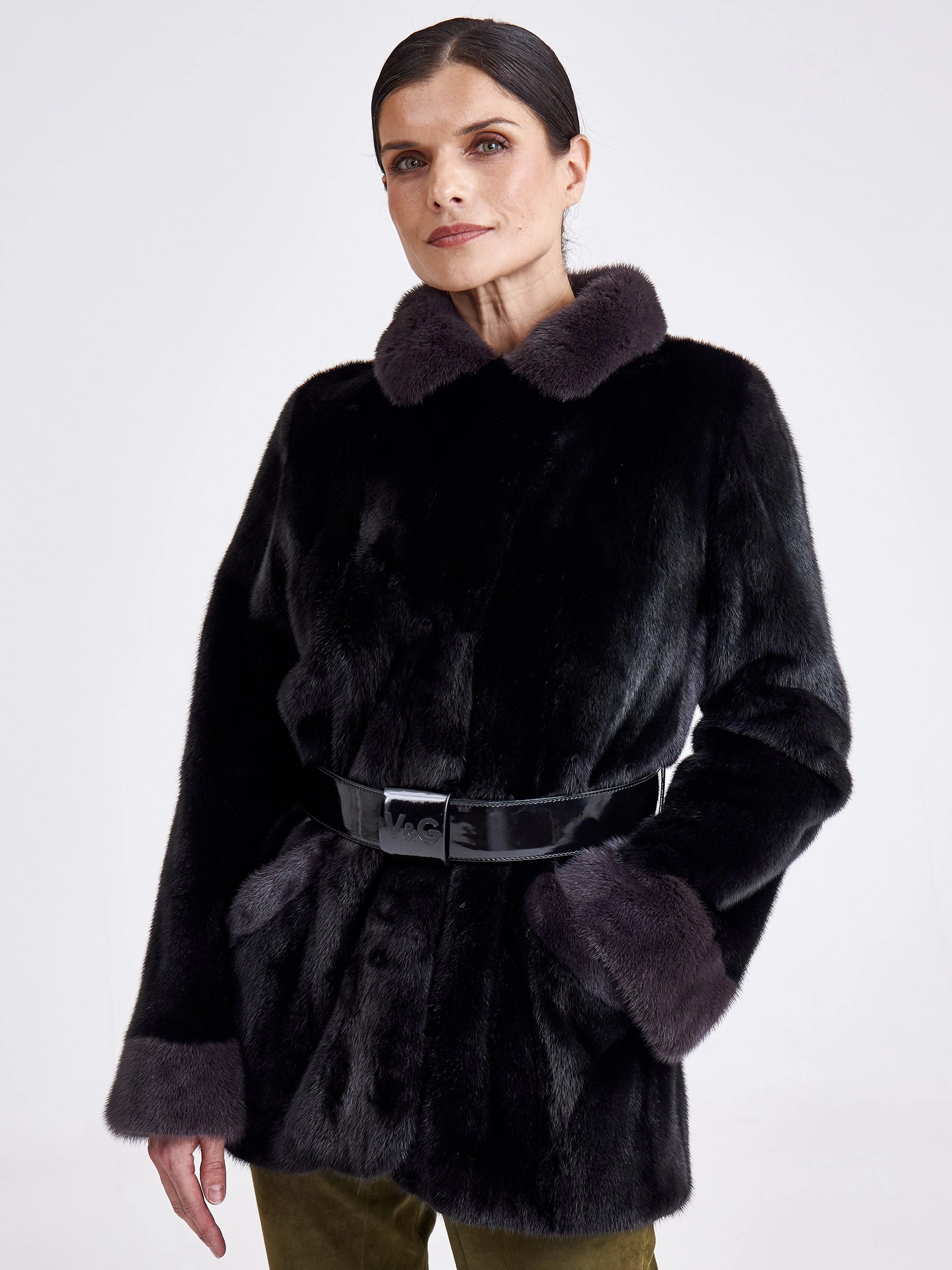 Эта классическая короткая шуба из низковорсовой крашеной норки насыщенного синего цвета демонстрирует безупречную зимнюю элегантность. Модель с прямым силуэтом, втачными плечами и строгим английским воротником обеспечивает идеальную посадку по фигуре. Короткая длина (51–74 см) и лаконичная застёжка на декоративные клипсы придают образу современную лёгкость. Шуба дополнена двумя функциональными карманами и длинным поясом, позволяющим варьировать силуэт. Благодаря шелковистому низковорсовому меху и подкладке из 100% вискозы изделие исключительно тёплое, лёгкое и комфортное для носки. Совет стилиста: наденьте её поверх однотонного платья-миди с сапогами на тонком каблуке для вечернего выхода или сочетайте с высокими кожаными брюками и объёмным свитером для создания дерзкого городского образа с акцентом на талии.