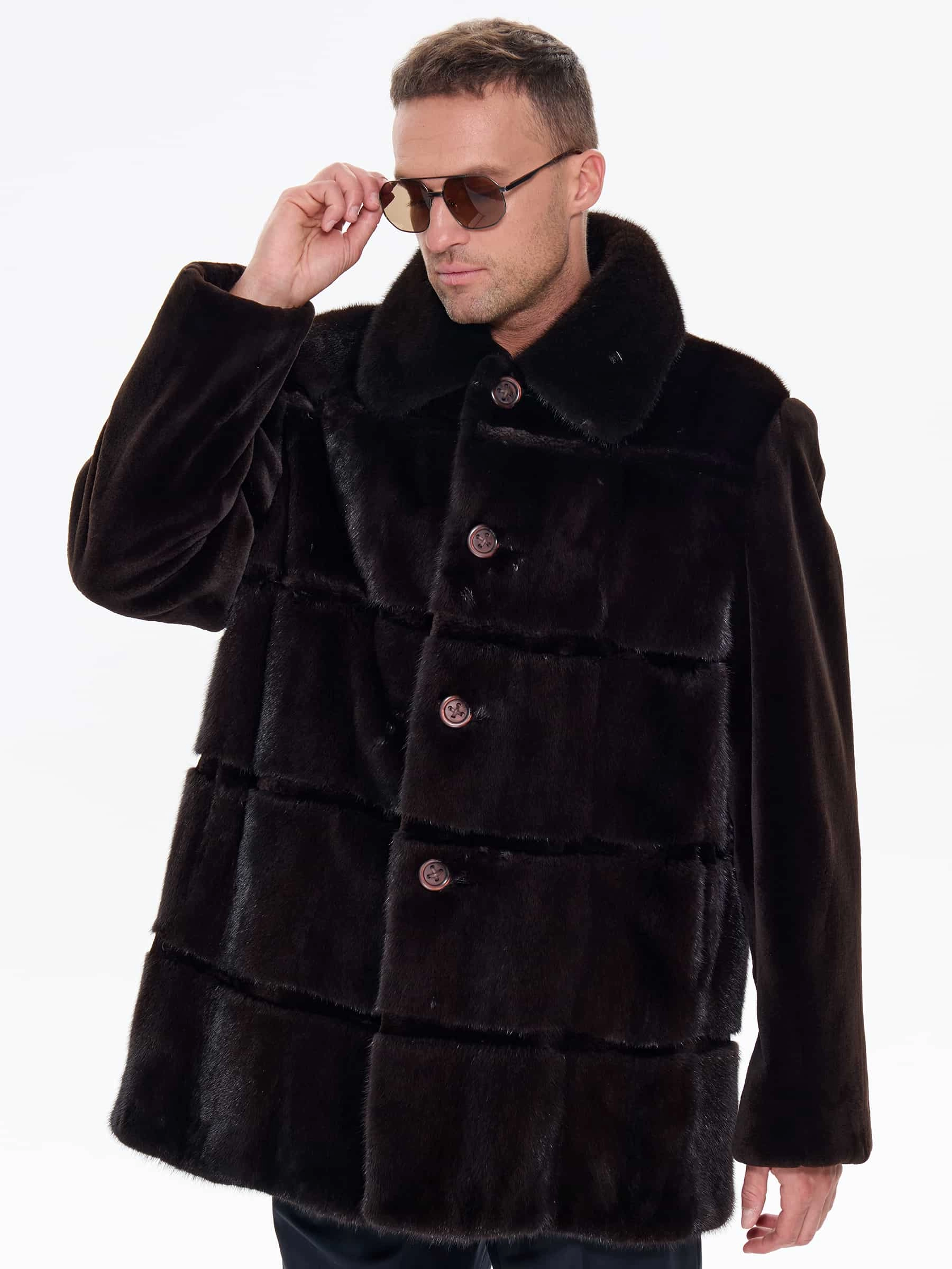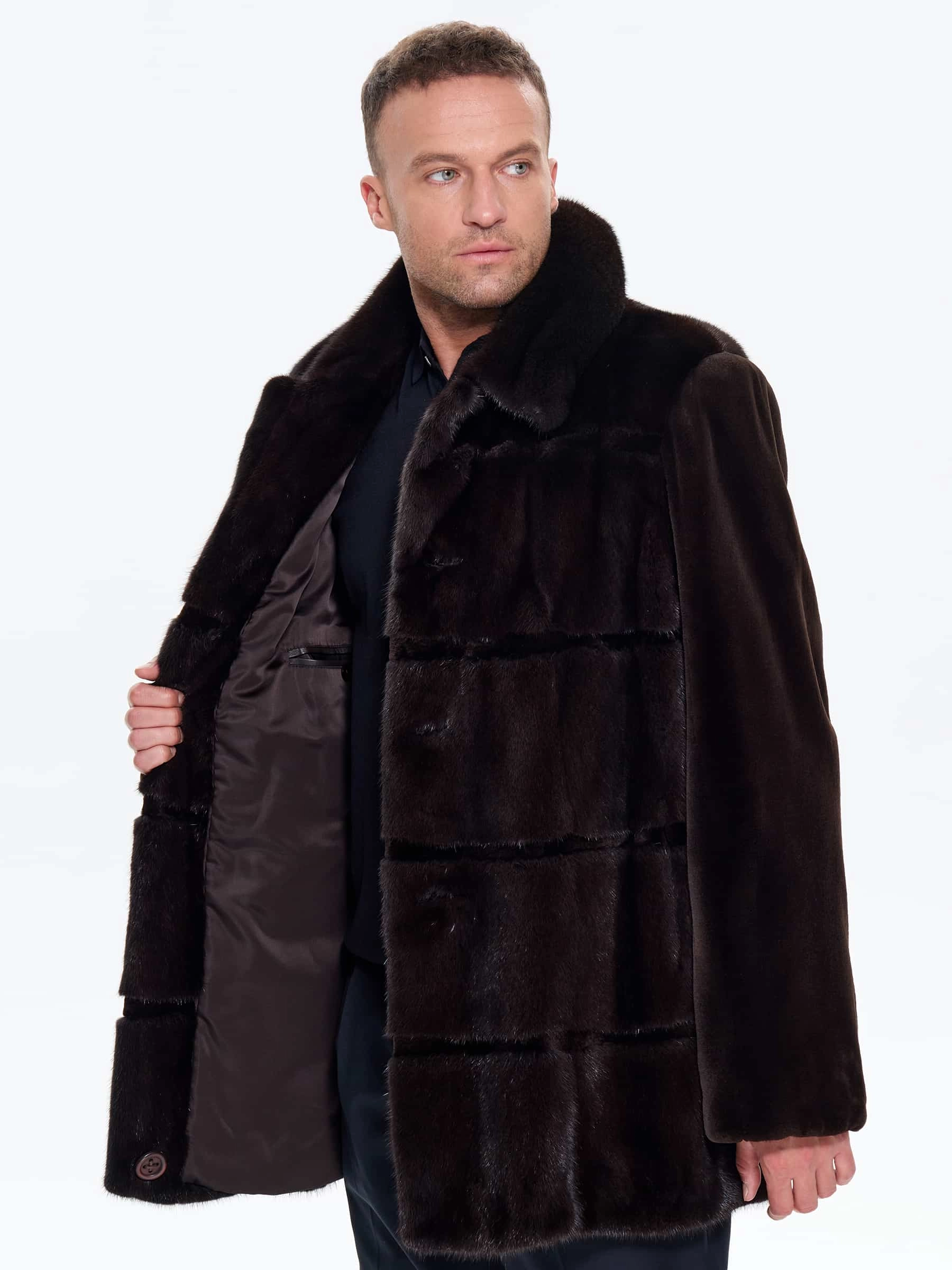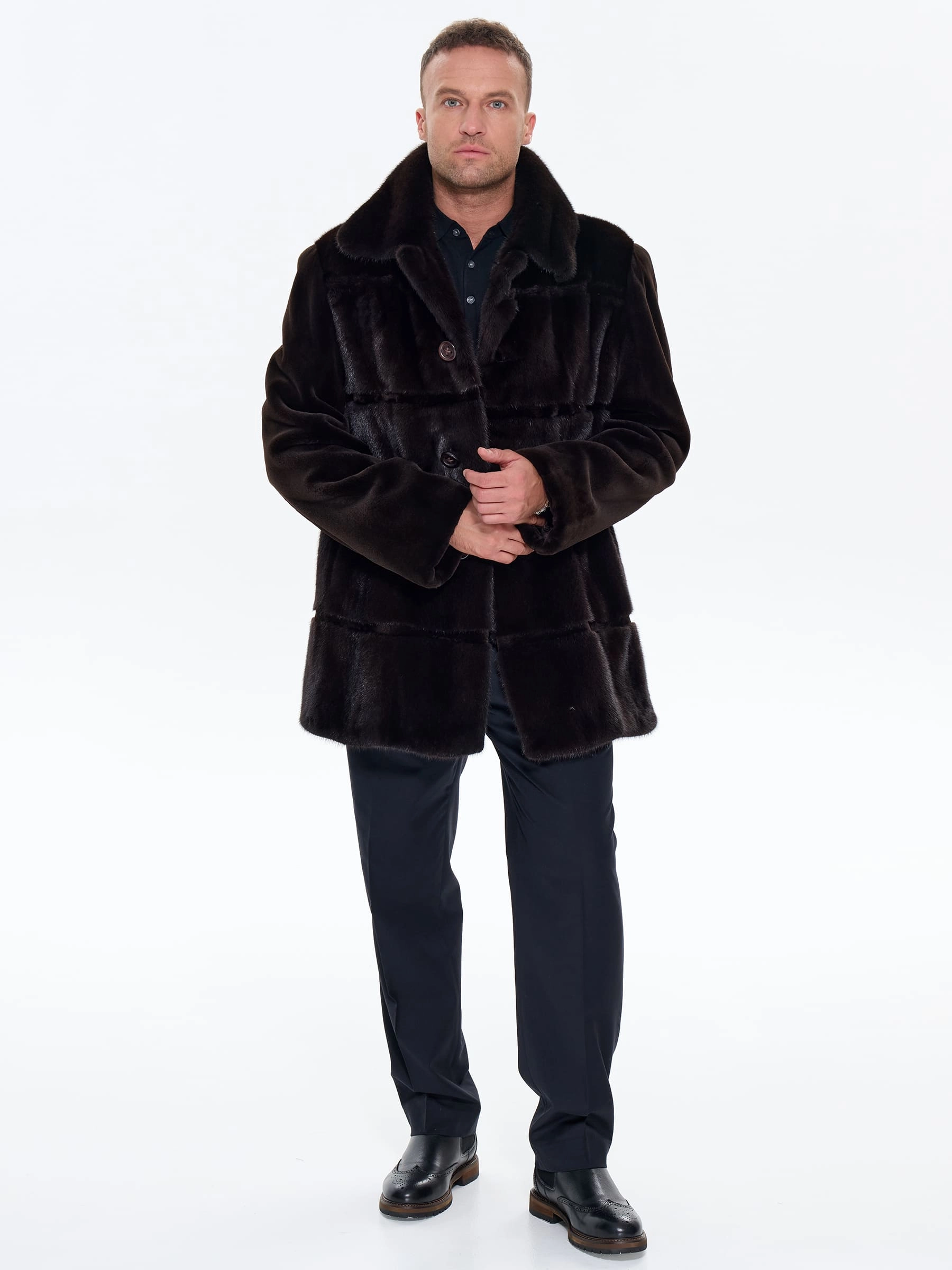 Классическую мужскую шубу выполнили из густого меха норки с равномерным глянцевым блеском. Строгий прямой силуэт, идеальная посадка по фигуре. Отложной воротник сочетается с костюмом, свитером, худи. Укороченная длина изделия оптимальна для горда: не стесняет движений в авто, общественном транспорте, при активной ходьбе. Закрывает бедра, максимальное тепло и защита от ветра. Модель дополнили двумя врезными боковыми и двумя внутренними карманами. Лаконичный дизайн подчеркивает качество меха. Застежка: пуговицы. .