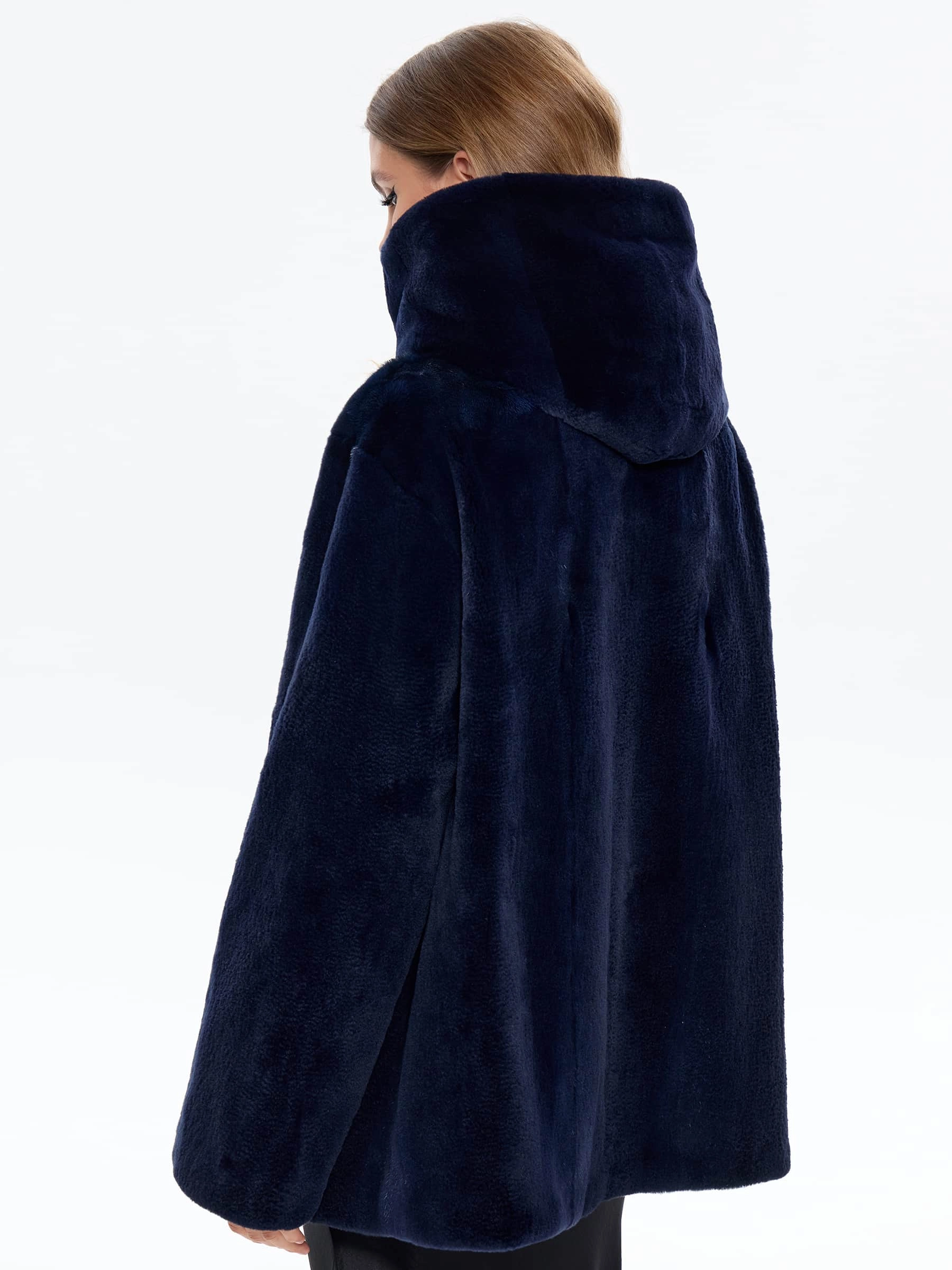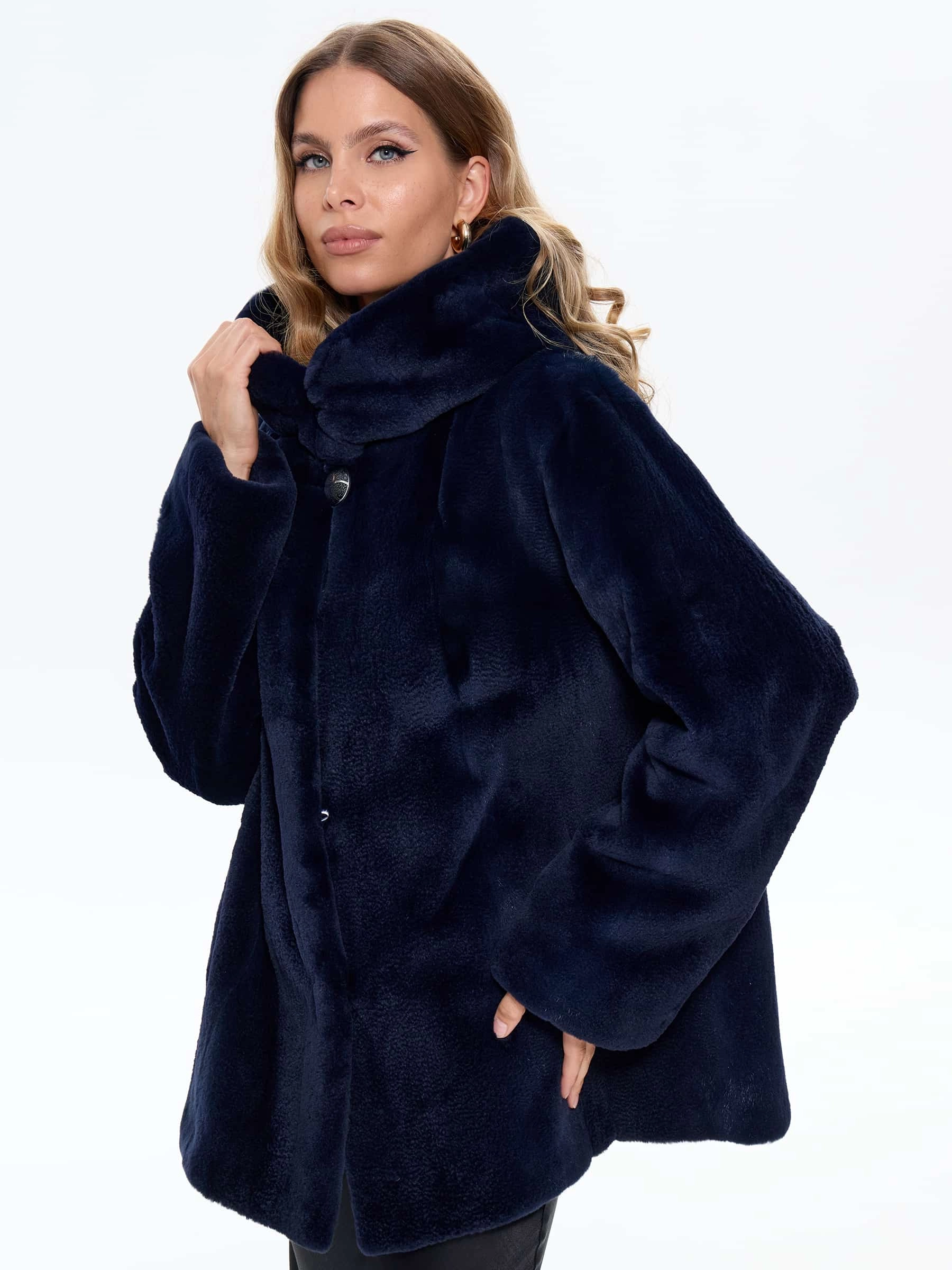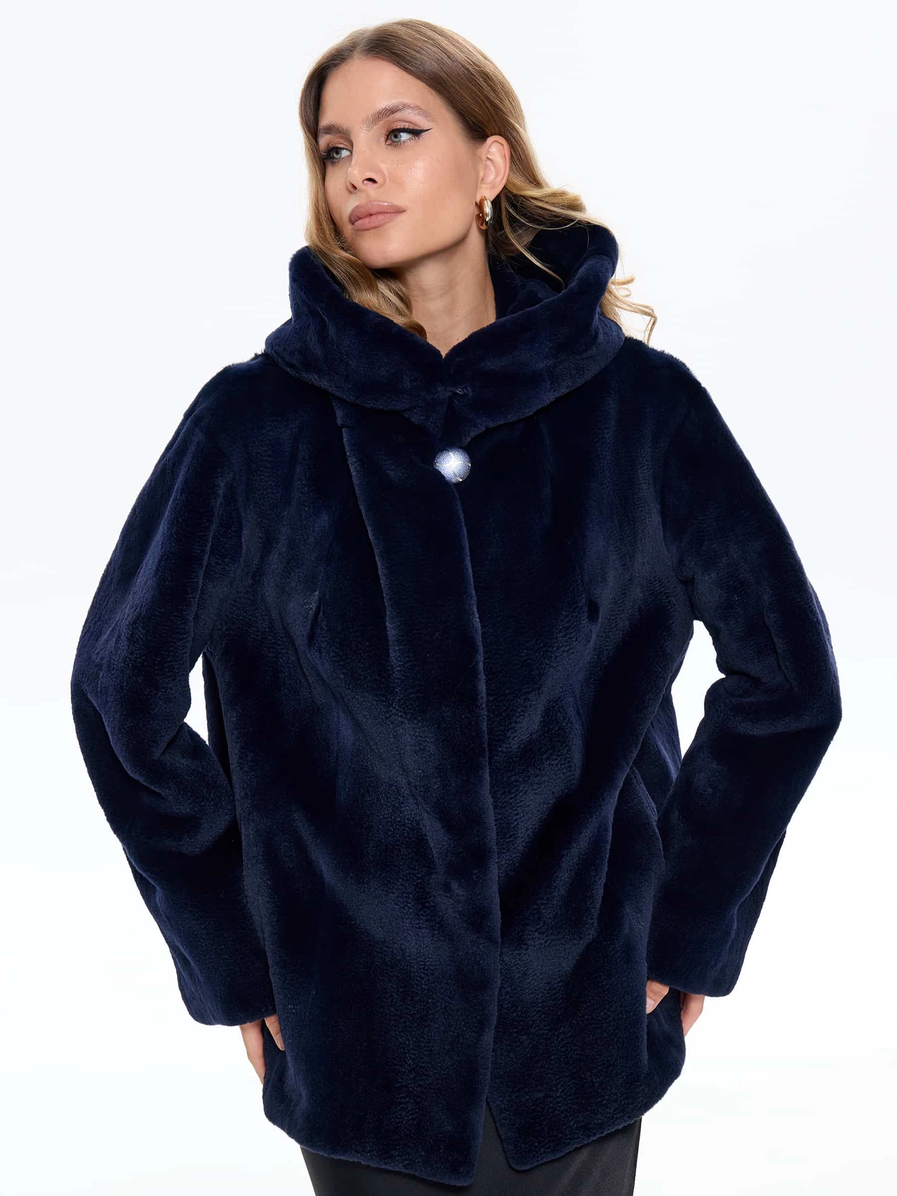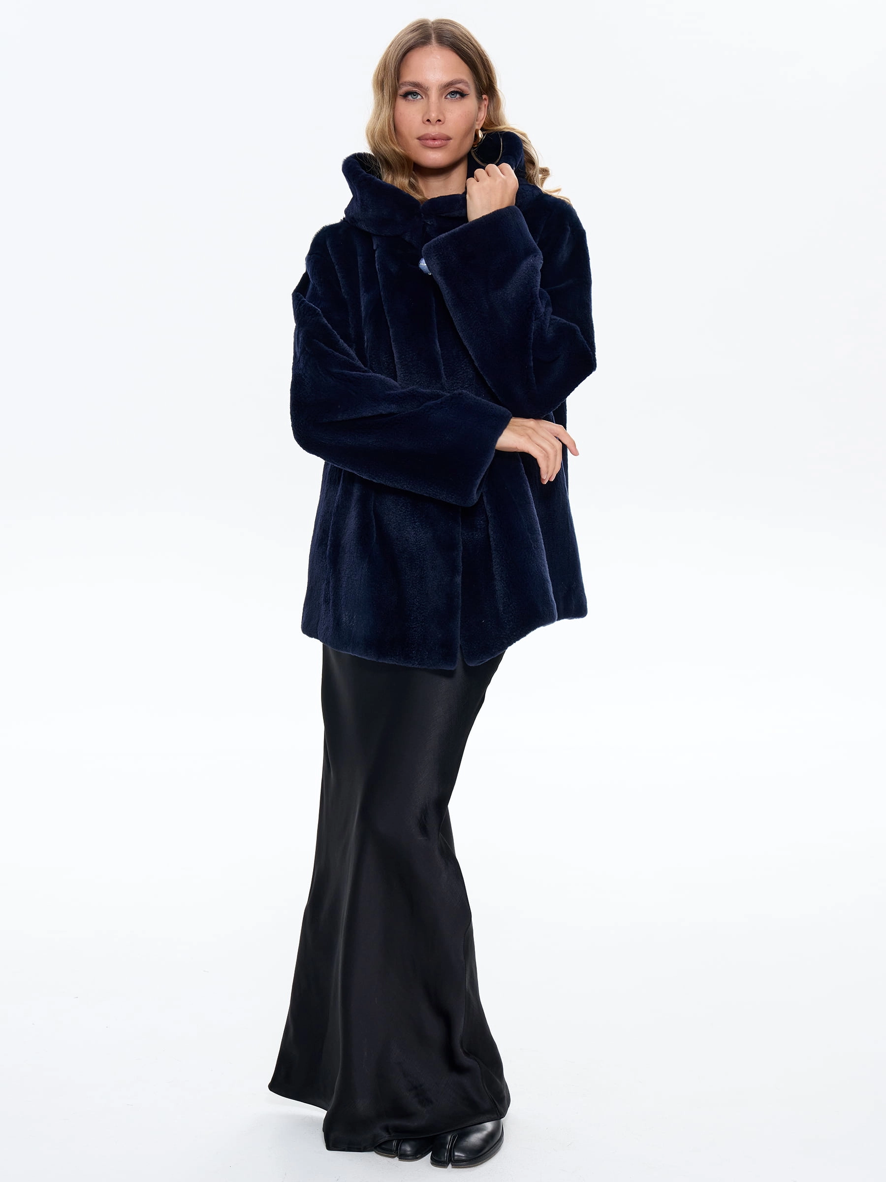 Товар синяя женская норковая шуба с капюшоном жанет, размер 54, артикул 65160 выполнен из мех норки с застежкой клипсы. Рассчитан на сезон: зима. Длина изделия 73 см, силуэт свободный.