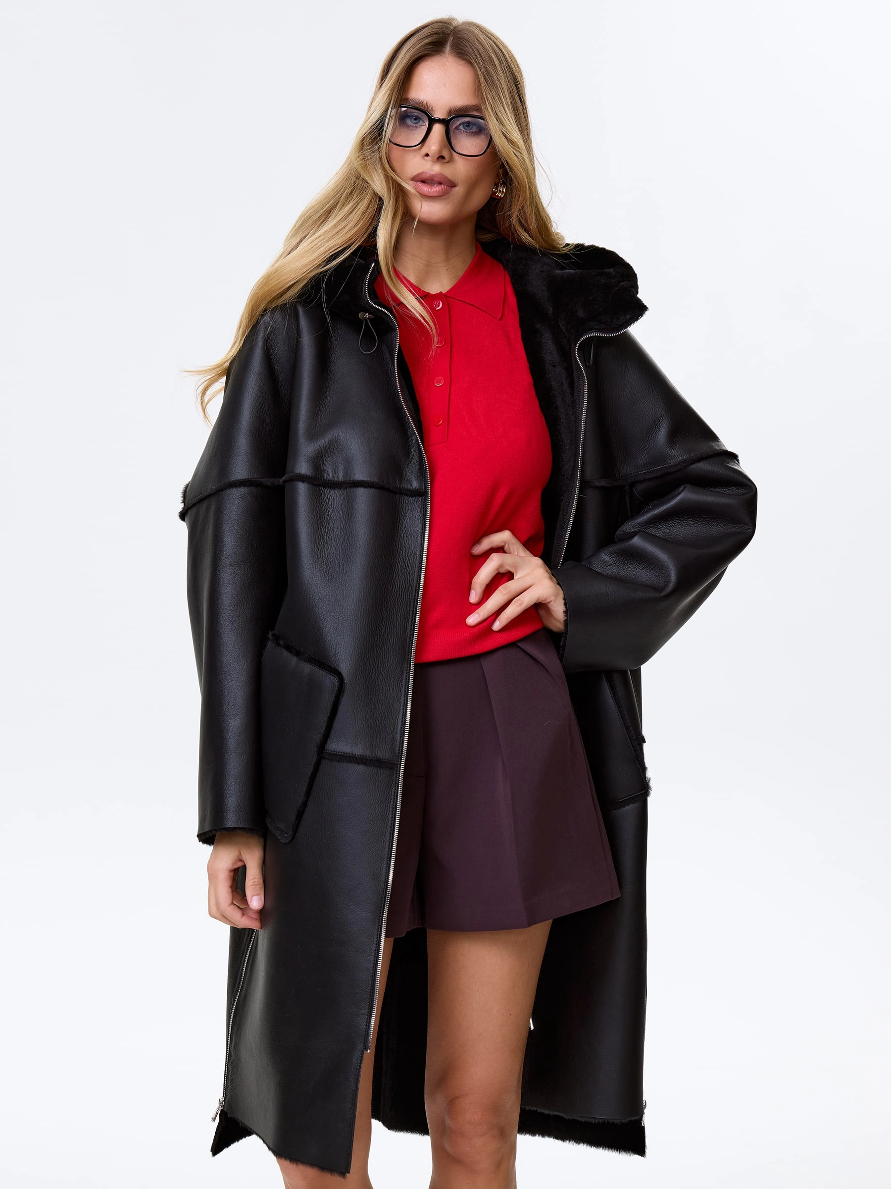 Модель свободного кроя выполнили из плотной овчины с гладкой фактурой и вывернутыми наружу швами. Дубленка получилась максимально теплой, но при этом легкой и комфортной. Боковые разрезы как и само изделие застегиваются крупными молниями. Для защиты от ветра предусмотрели объемный капюшон.