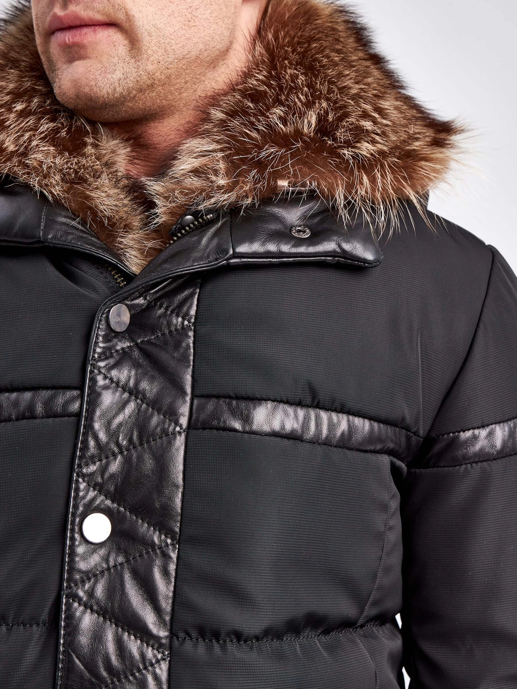Куртка мужская премиального качества из мембранной ткани с отделками из натуральной кожи, большим сьемным енотовым капюшоном и отделкой мехом серебристого енота на передней планке.