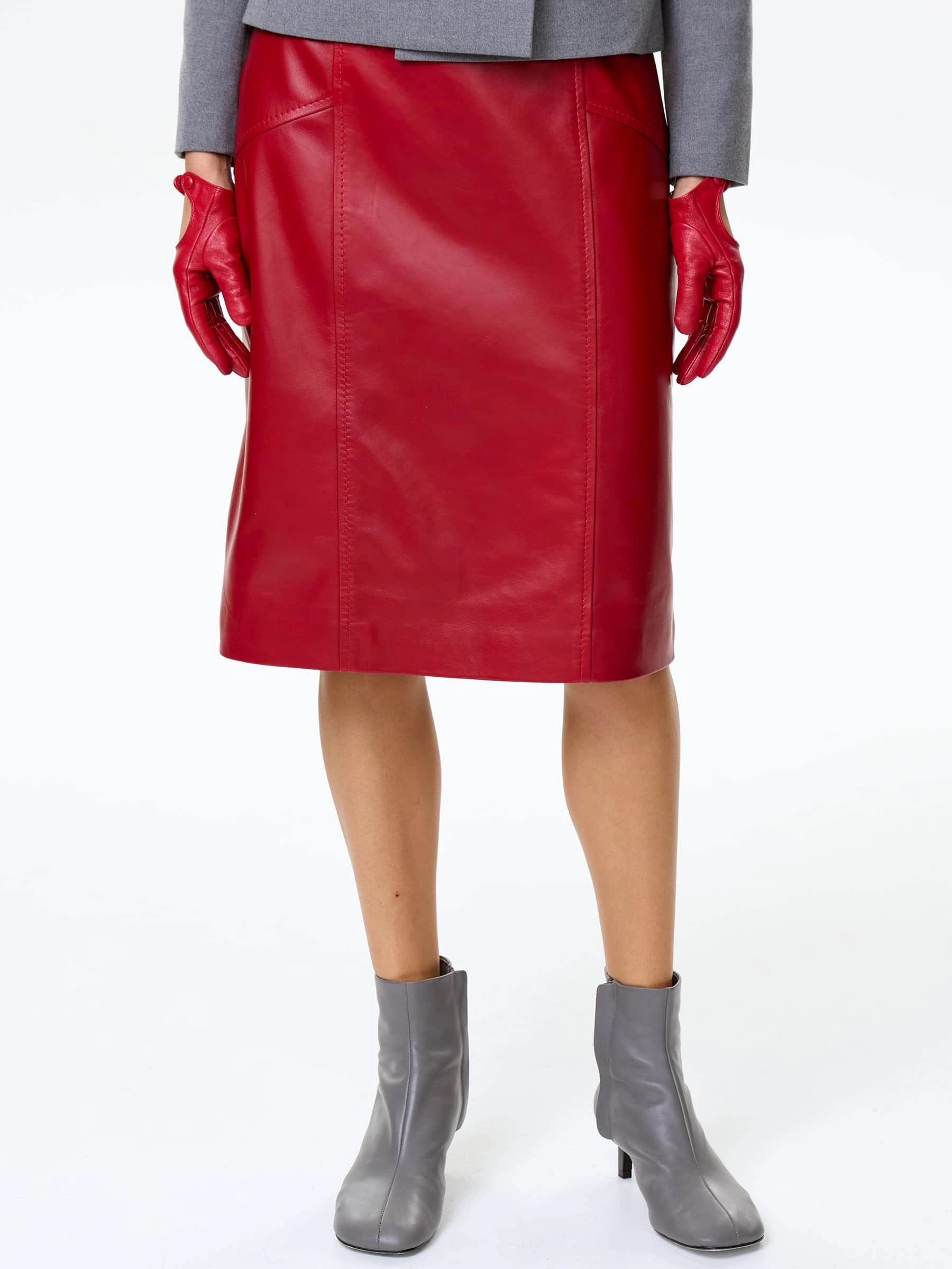 Юбка-карандаш из мягкой натуральной кожи насыщенного красного оттенка сочетает строгий прямой силуэт с элегантными деталями. Боковые кокетки с деликатной строчкой подчеркивают качество исполнения, а практичная шлица сохраняет удобство носки. Идеально комбинируется с монохромными блузами для делового стиля или с контрастными жакетами для создания акцентного образа.