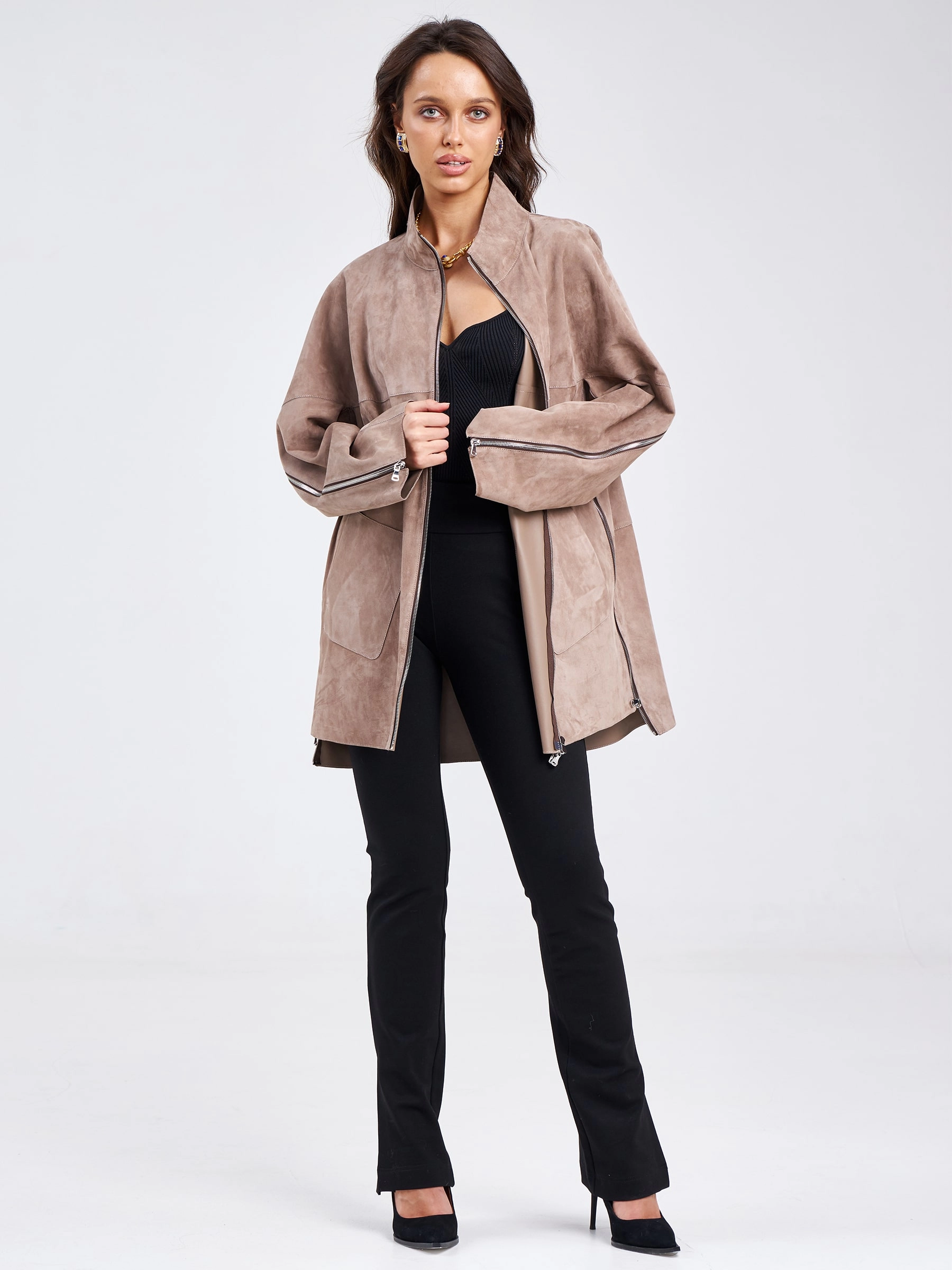 Нельзя оставить без внимания куртку выполненную из натуральной замши премиум класса. Свободный крой, широкий рукав, не высокий воротник-стойка. Боковые разрезы как и сама модель застегиваются на молнию. Идеально сочетается с кожаными брюками.