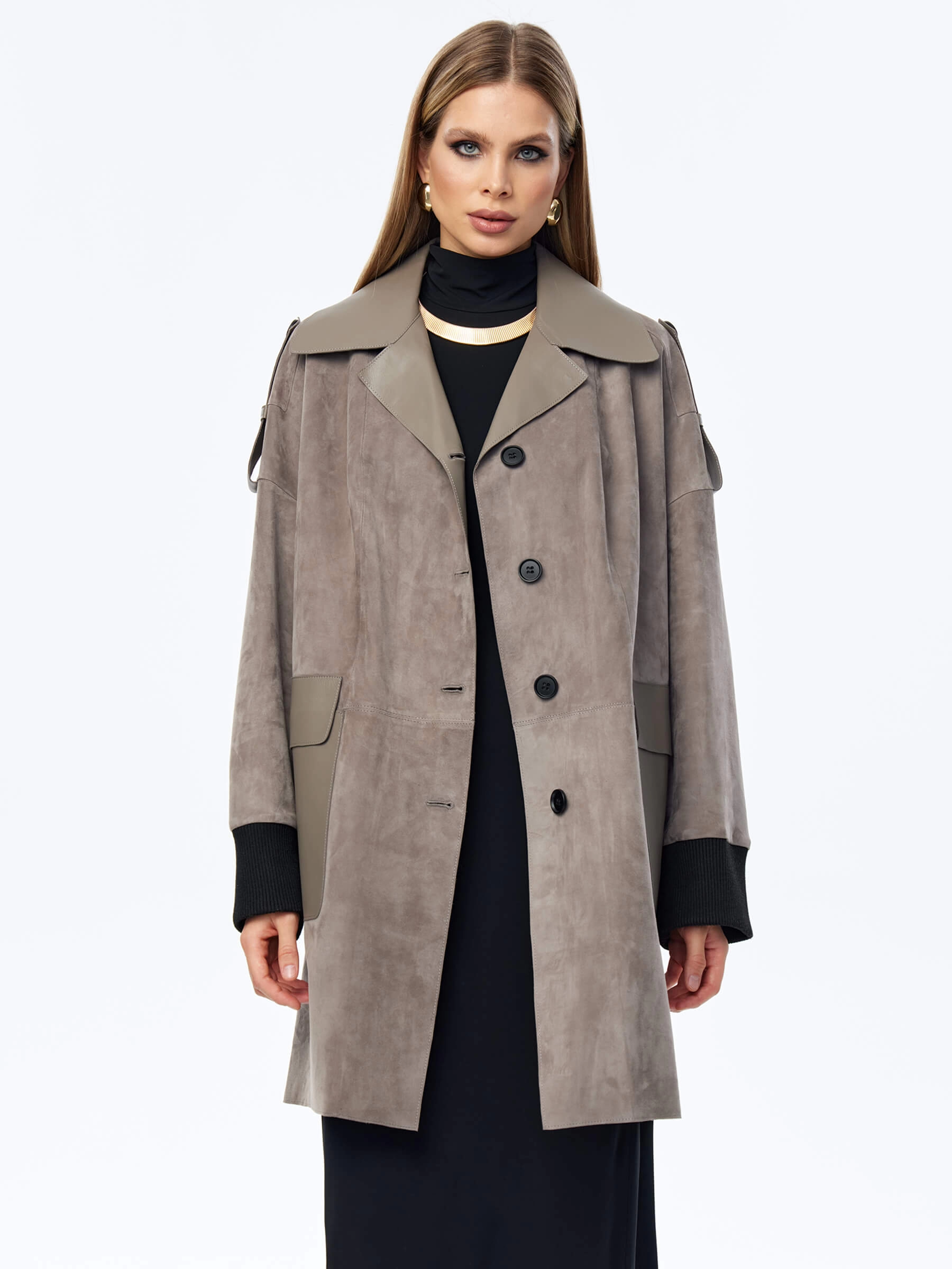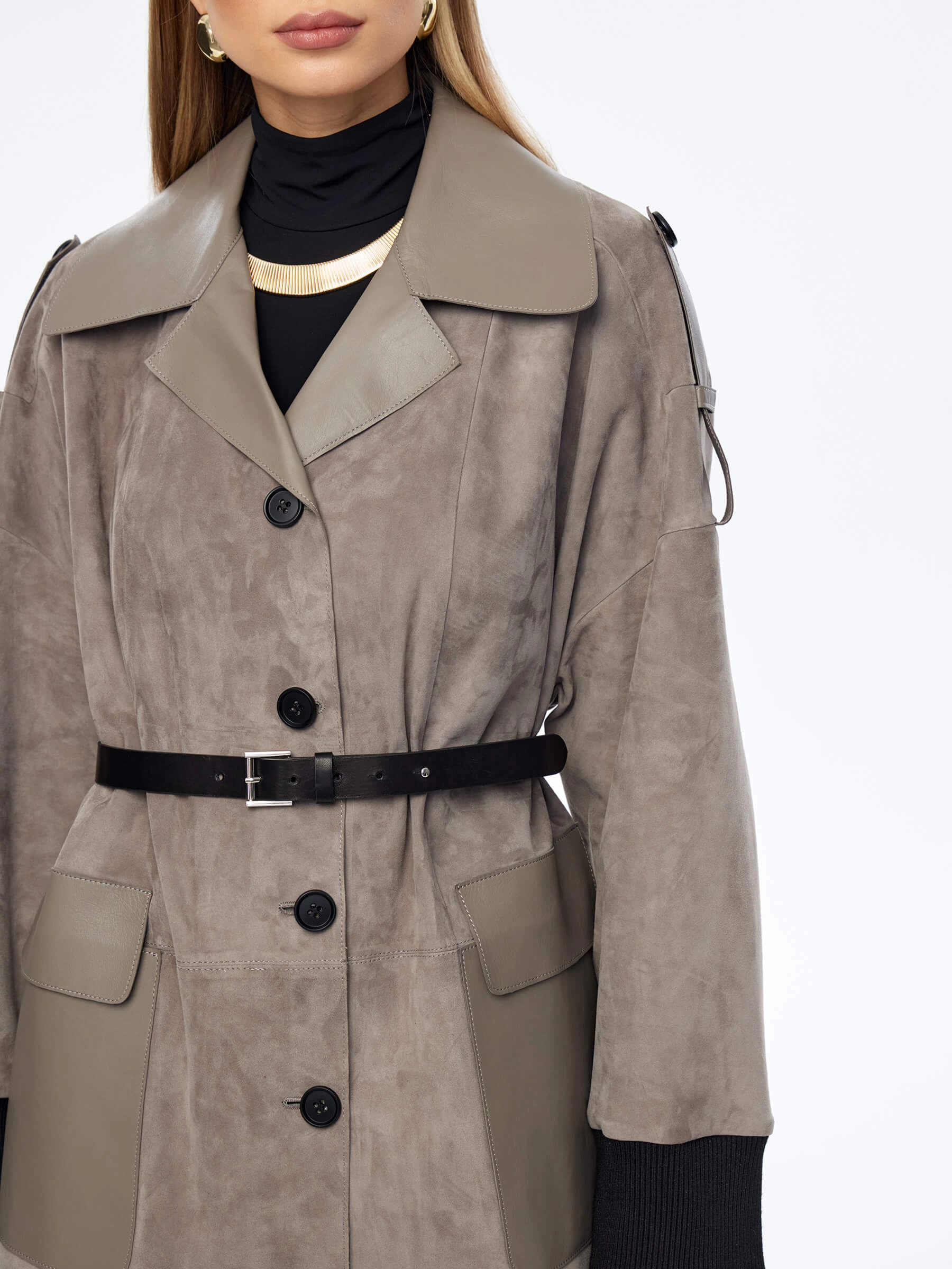 Товар замшевый короткий женский плащ оверсайз с поясом премиум класса 3063з, серый, размер 48, артикул 23730 выполнен из натуральной замши с застежкой пуговицы. Рассчитан на сезон: весна-лето. Длина изделия 93 см, силуэт свободный.