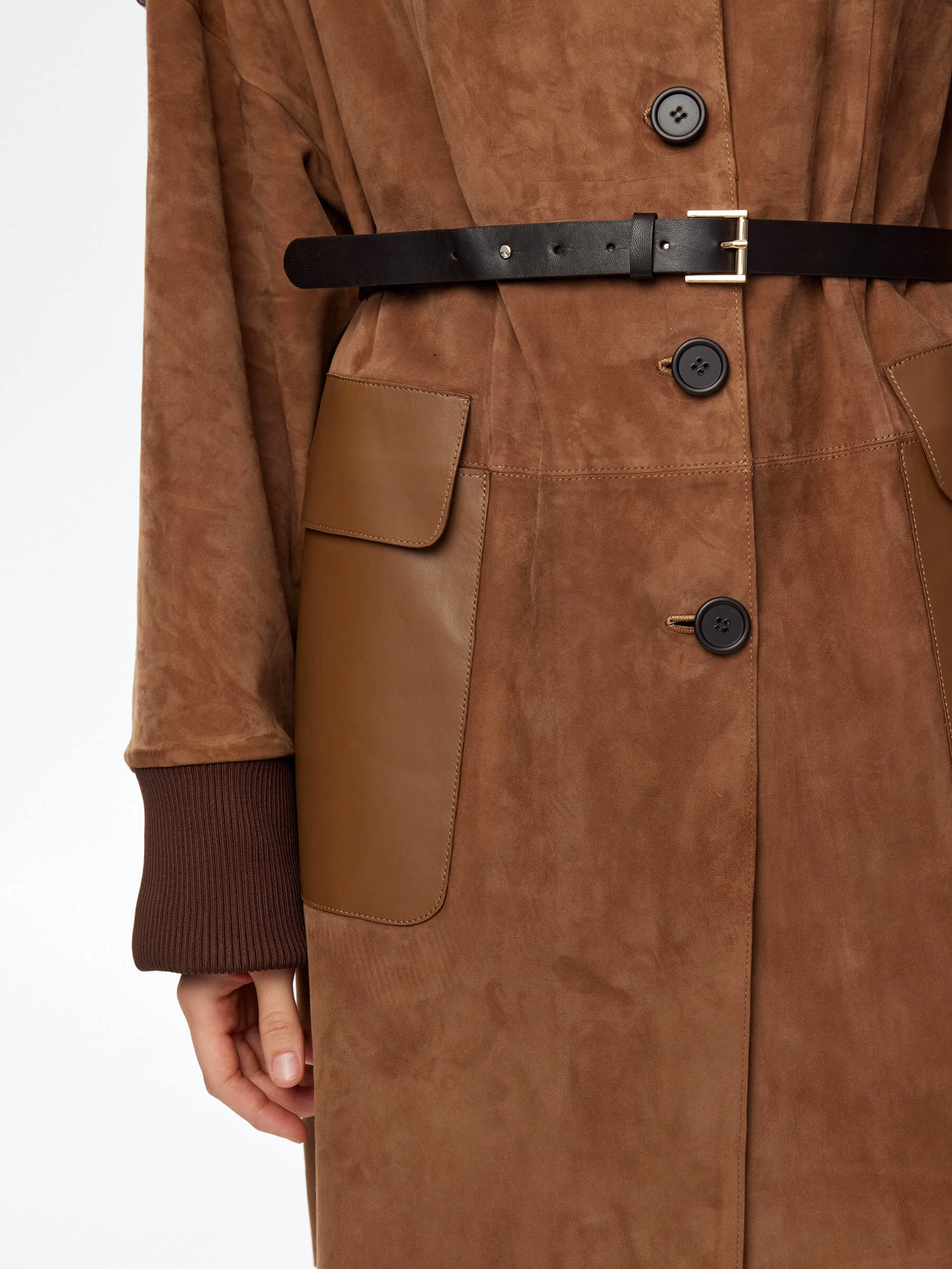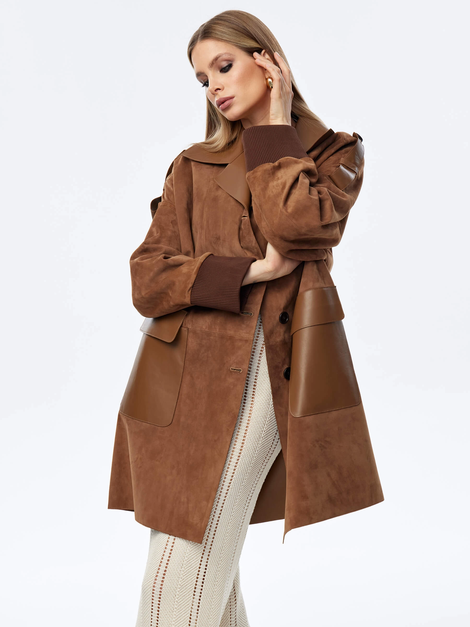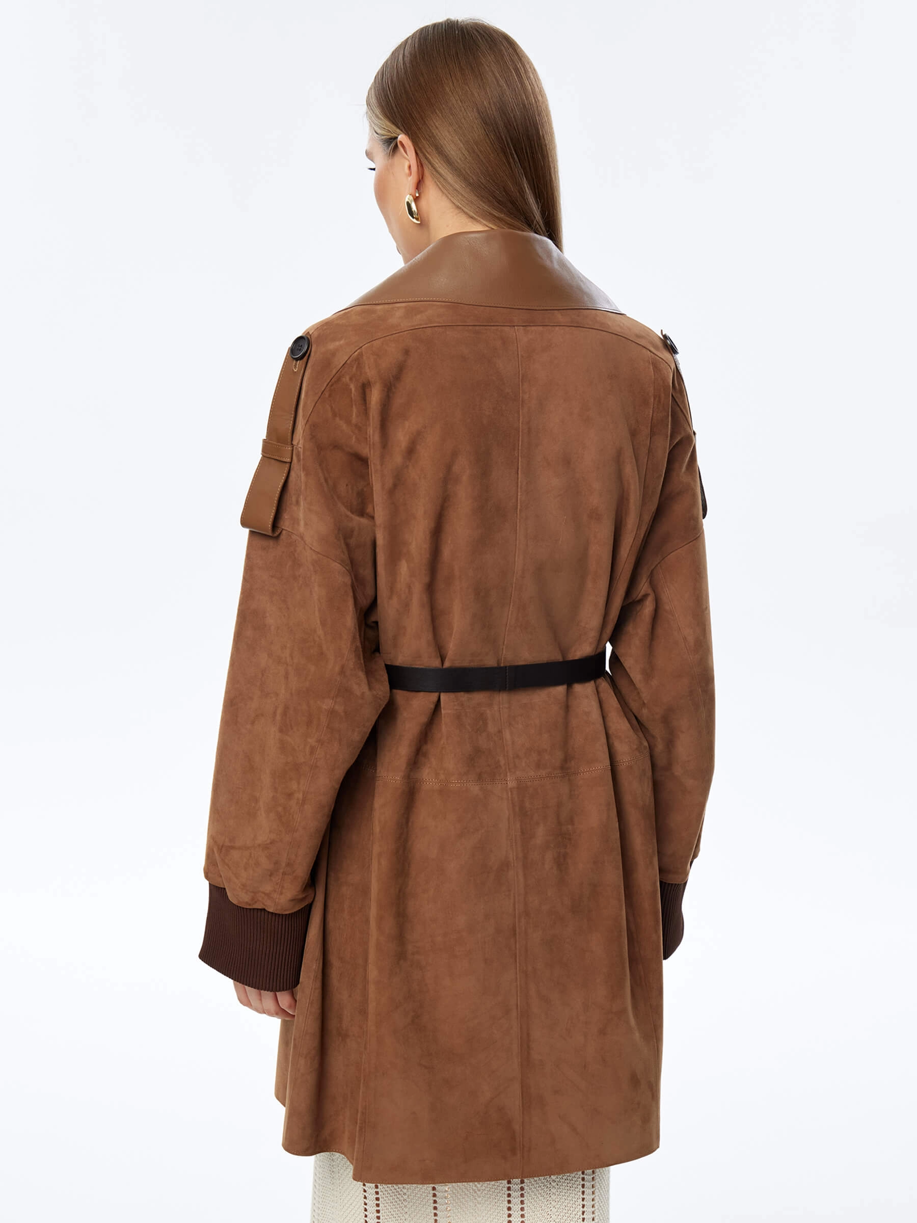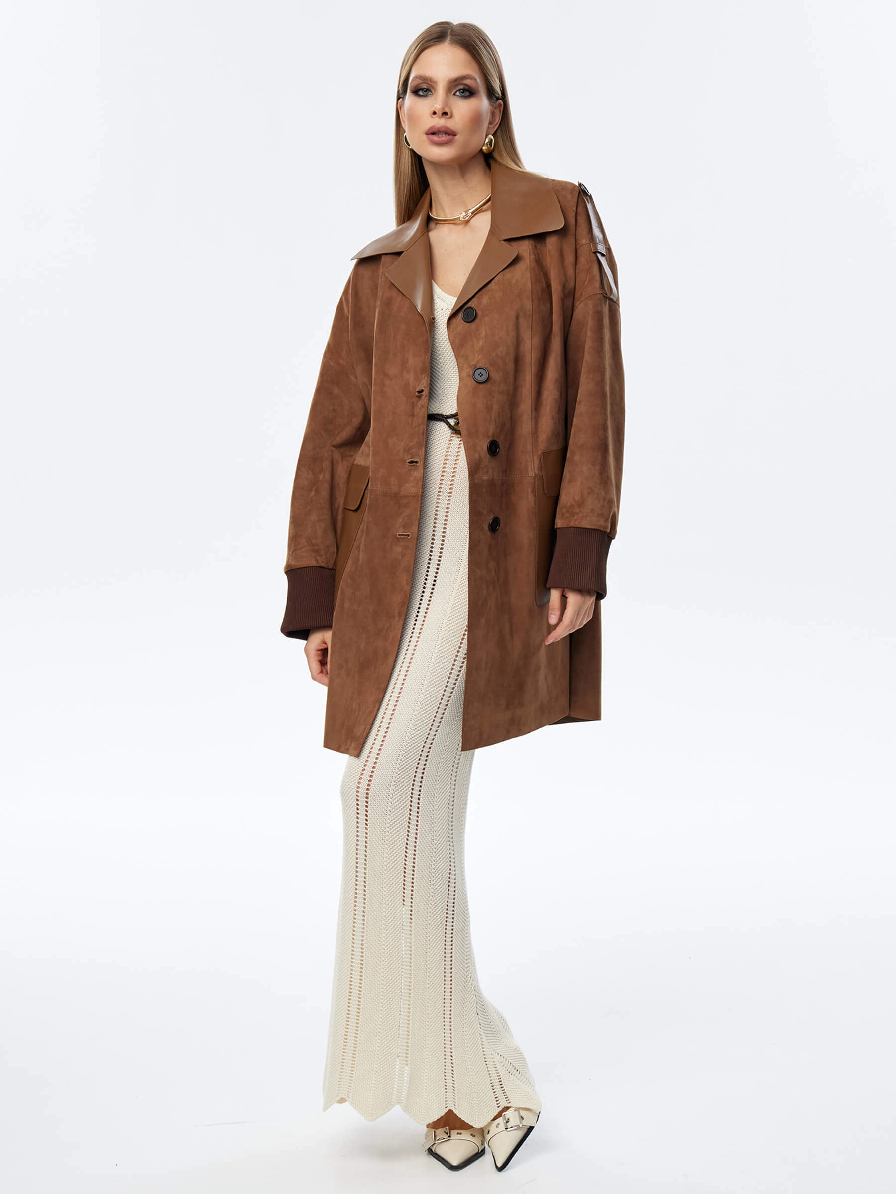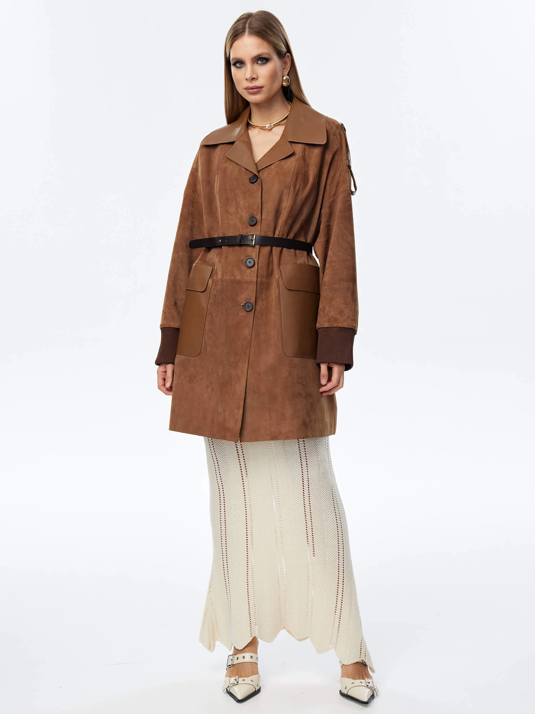 Стильный женственный образ подчеркнет укороченный плащ выполненный из тонкой натуральной замши премиум класса. Свободный силуэт изделия удобно садится по фигуре не сковывая движения. Английский воротник. Спущенная линия плеч. Дополнительный комфорт рукавам добавят плотные трикотажные манжеты. Модель дополнили накладными карманами с клапанами и узким поясом.