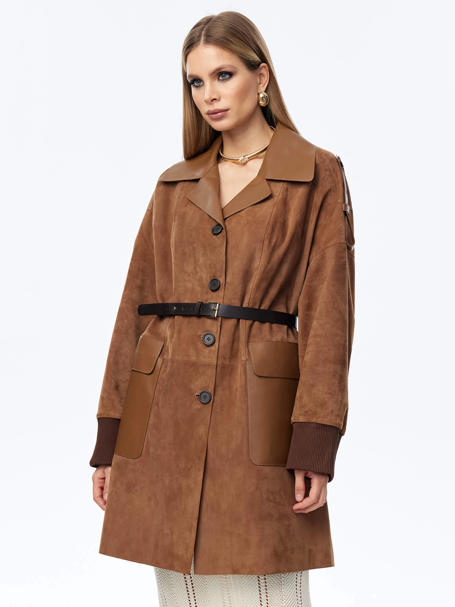 Товар замшевый короткий женский плащ оверсайз с поясом премиум класса 3063з, светло-коричневый, размер 48, артикул 23750 выполнен из натуральной замши с застежкой пуговицы. Рассчитан на сезон: весна-лето. Длина изделия 93 см, силуэт свободный.