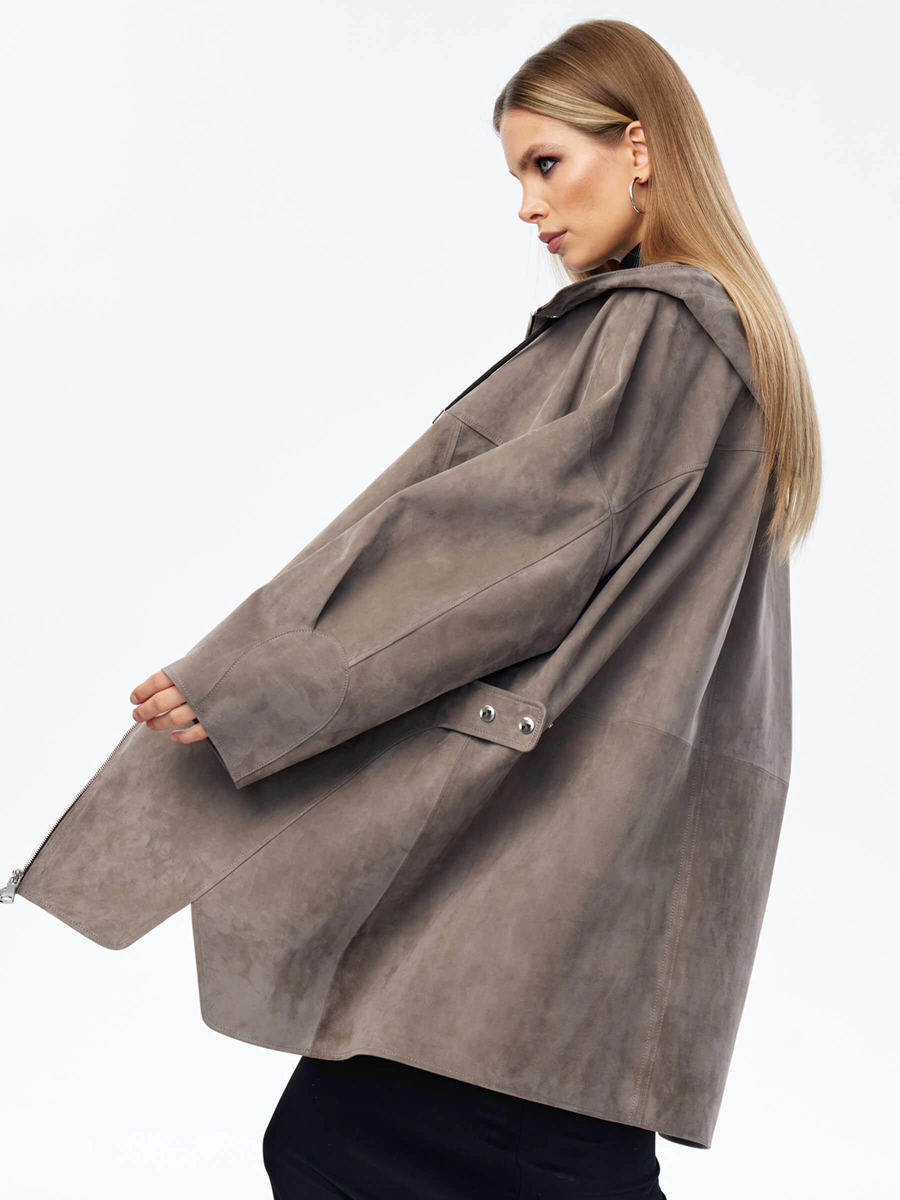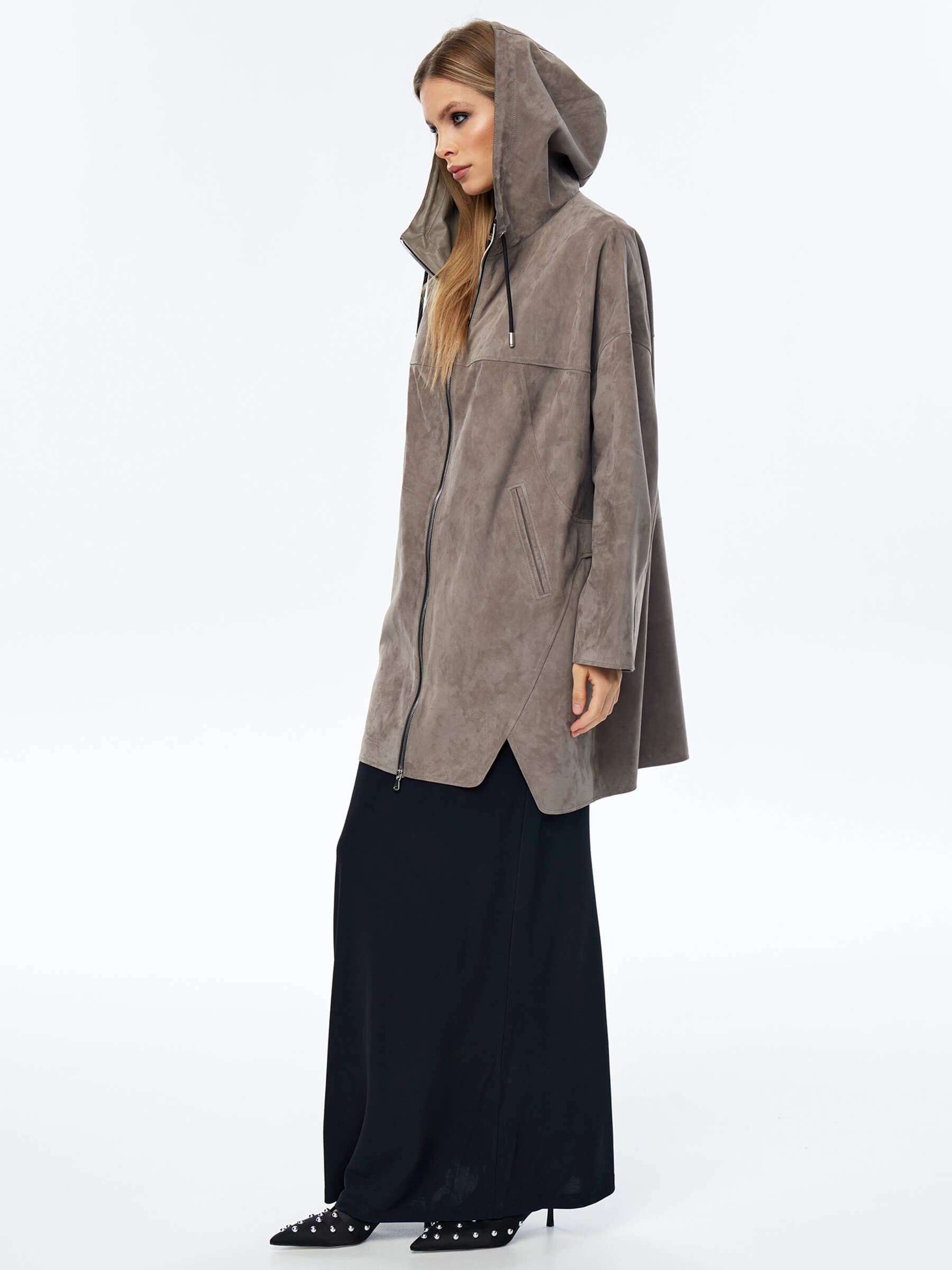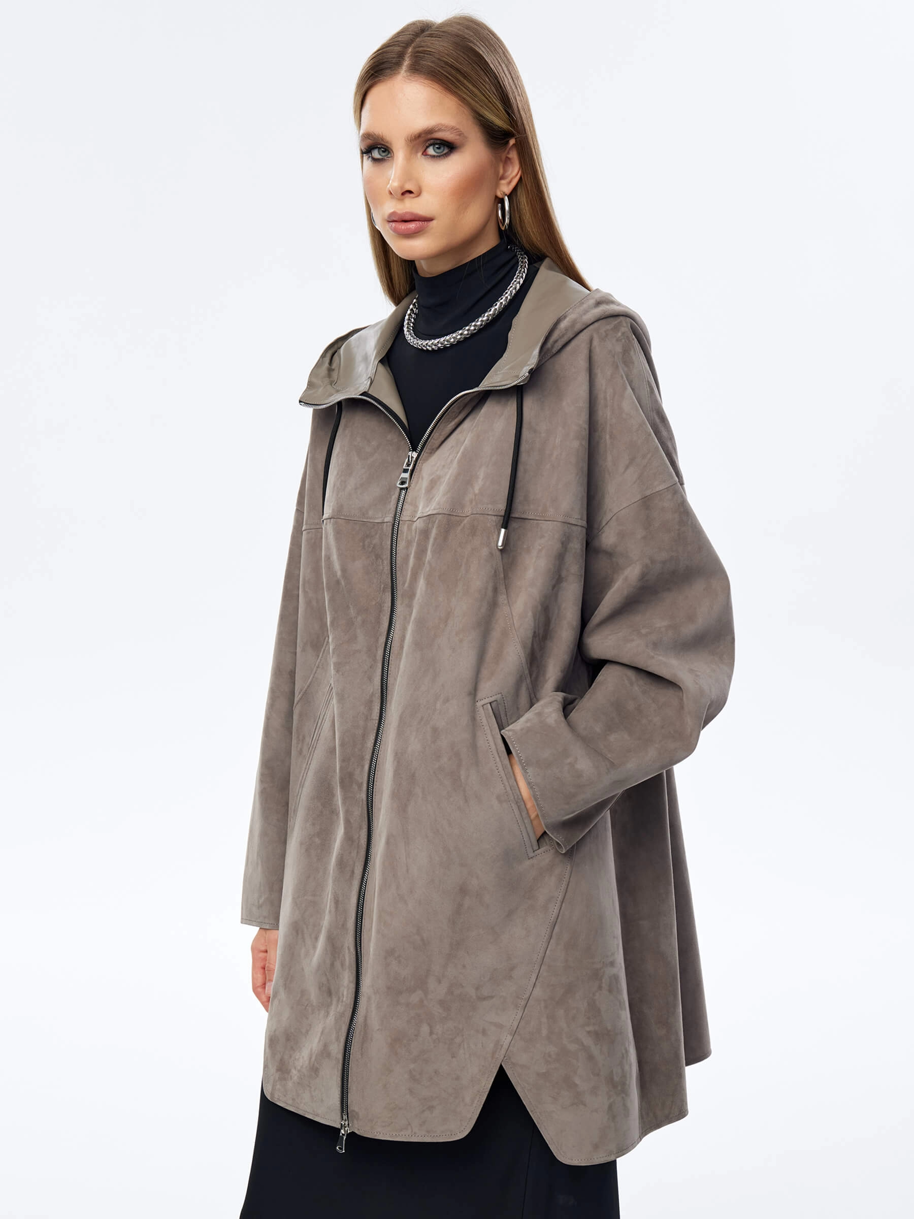 Товар замшевый плащ оверсайз с капюшоном для женщин премиум класса 3059з, серый, размер 52, артикул 23570 выполнен из натуральной замши с застежкой молния. Рассчитан на сезон: весна-лето. Длина изделия 88 см, силуэт оверсайз.