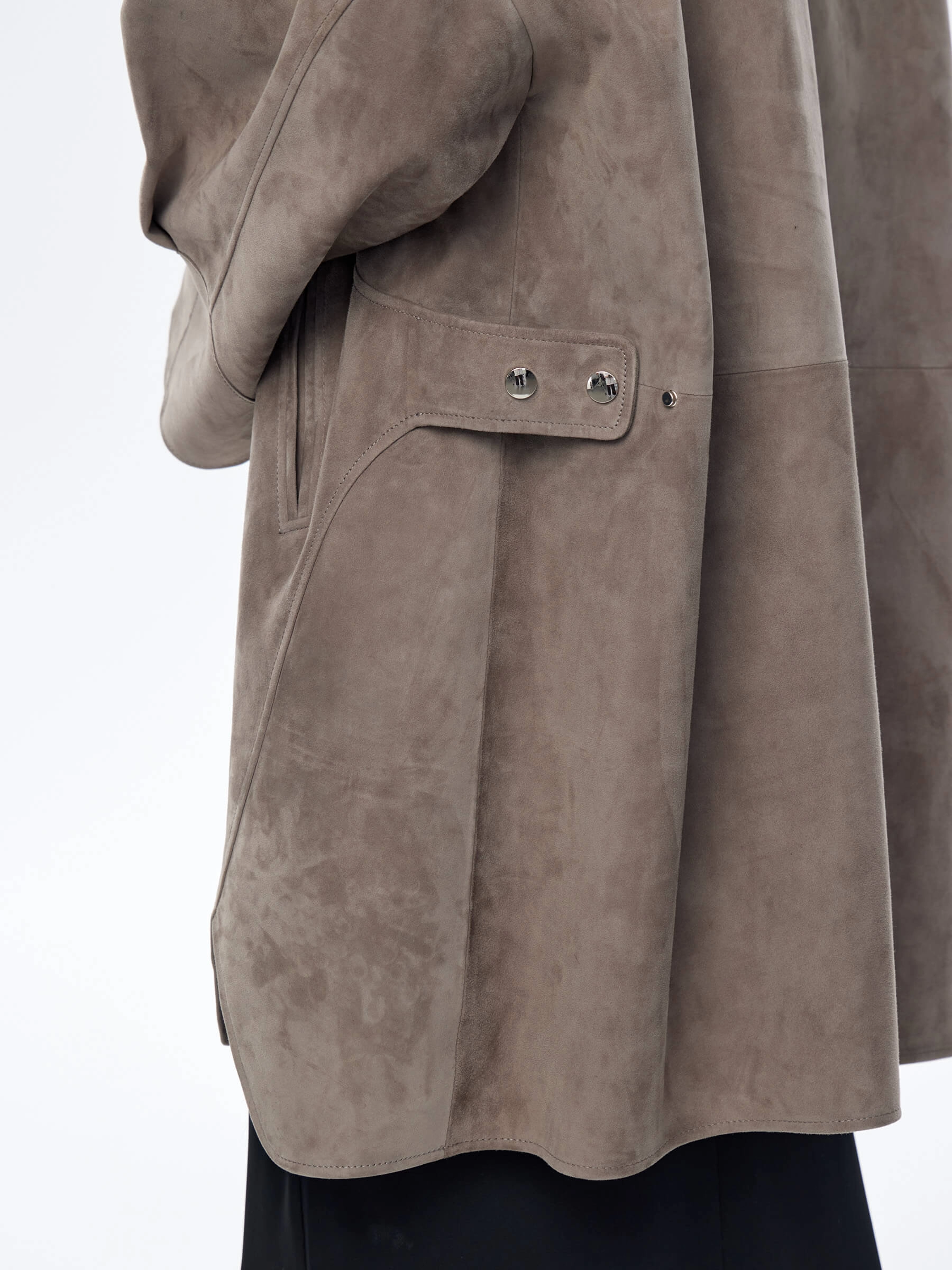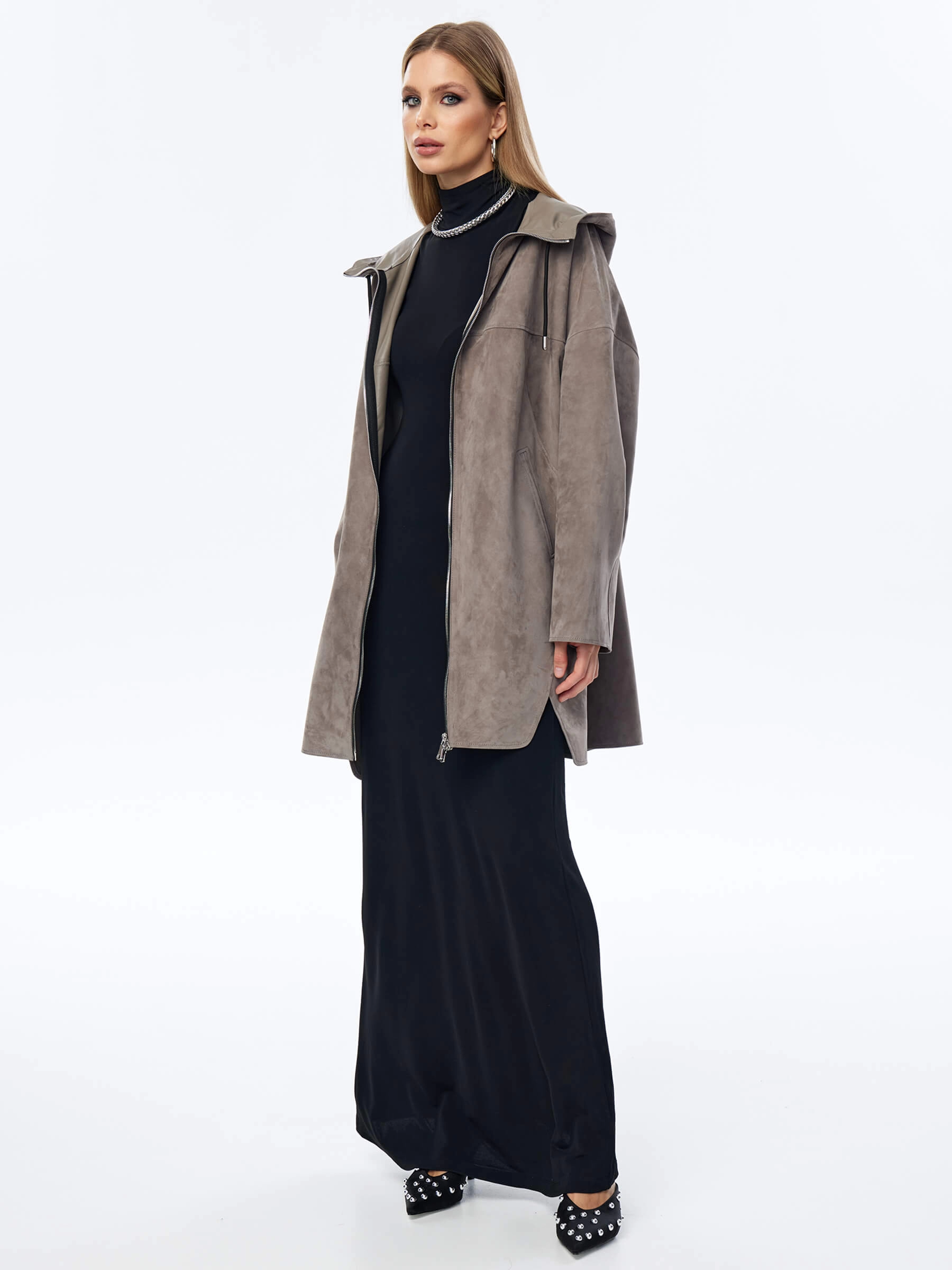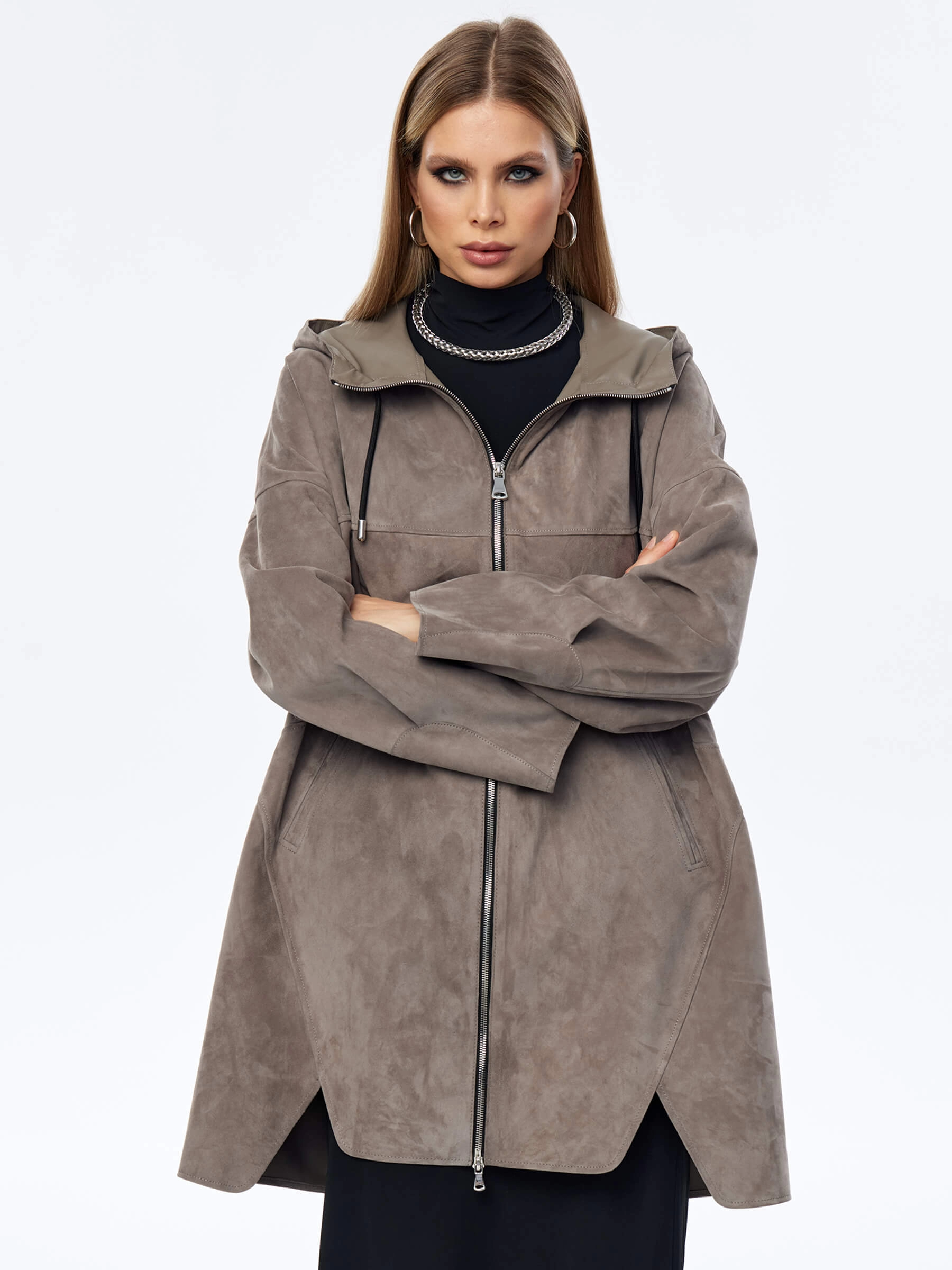Товар замшевый плащ оверсайз с капюшоном для женщин премиум класса 3059з, серый, размер 52, артикул 23570 выполнен из натуральной замши с застежкой молния. Рассчитан на сезон: весна-лето. Длина изделия 88 см, силуэт оверсайз.