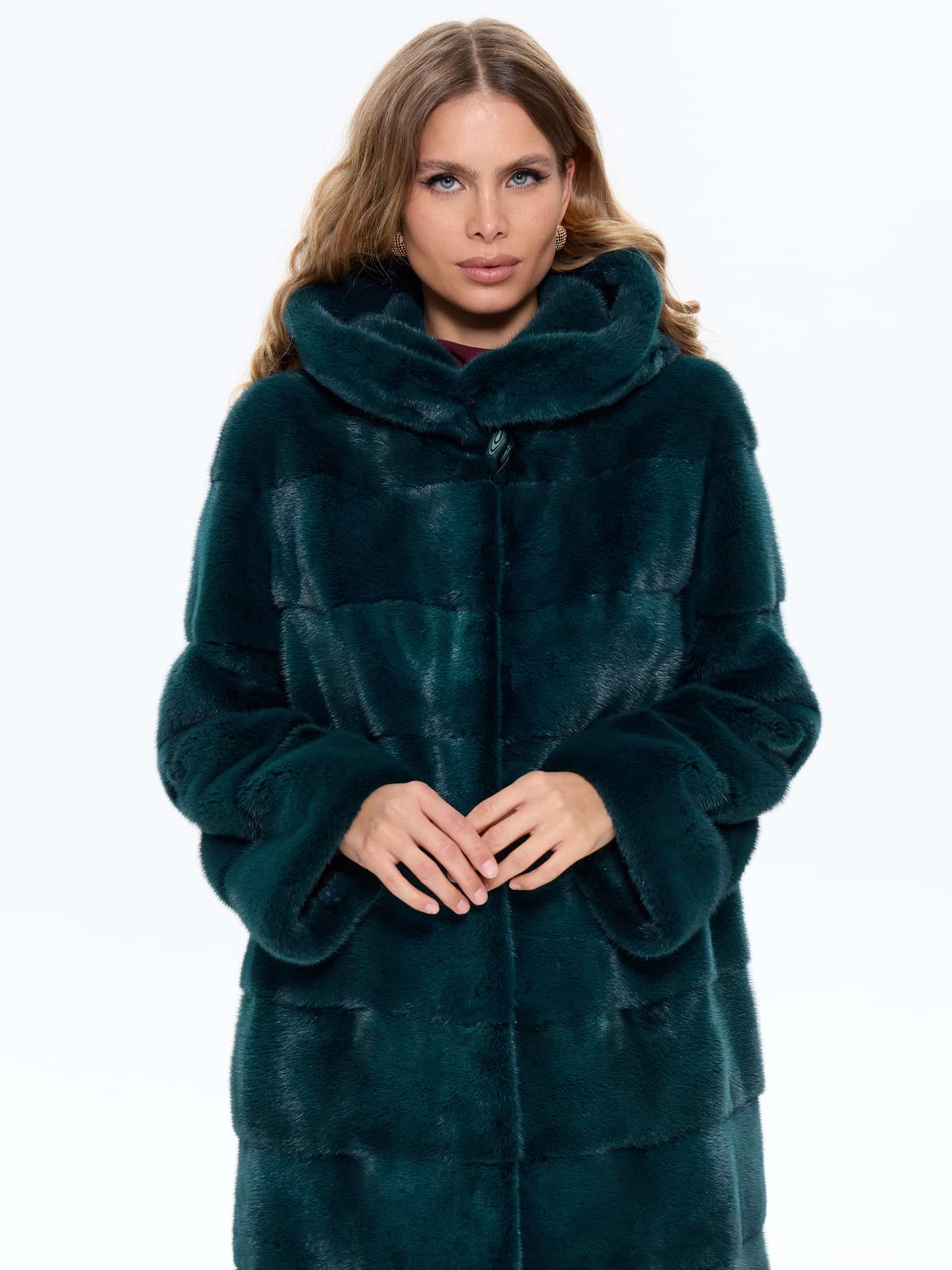 Длинная зеленая шуба из низковорсовой густой норки станет отличным решением для холодной зимы. Прямой крой, поперечная раскладка меха. Модель дополнили глубоким капюшоном. Изделие получилось теплым и легким.