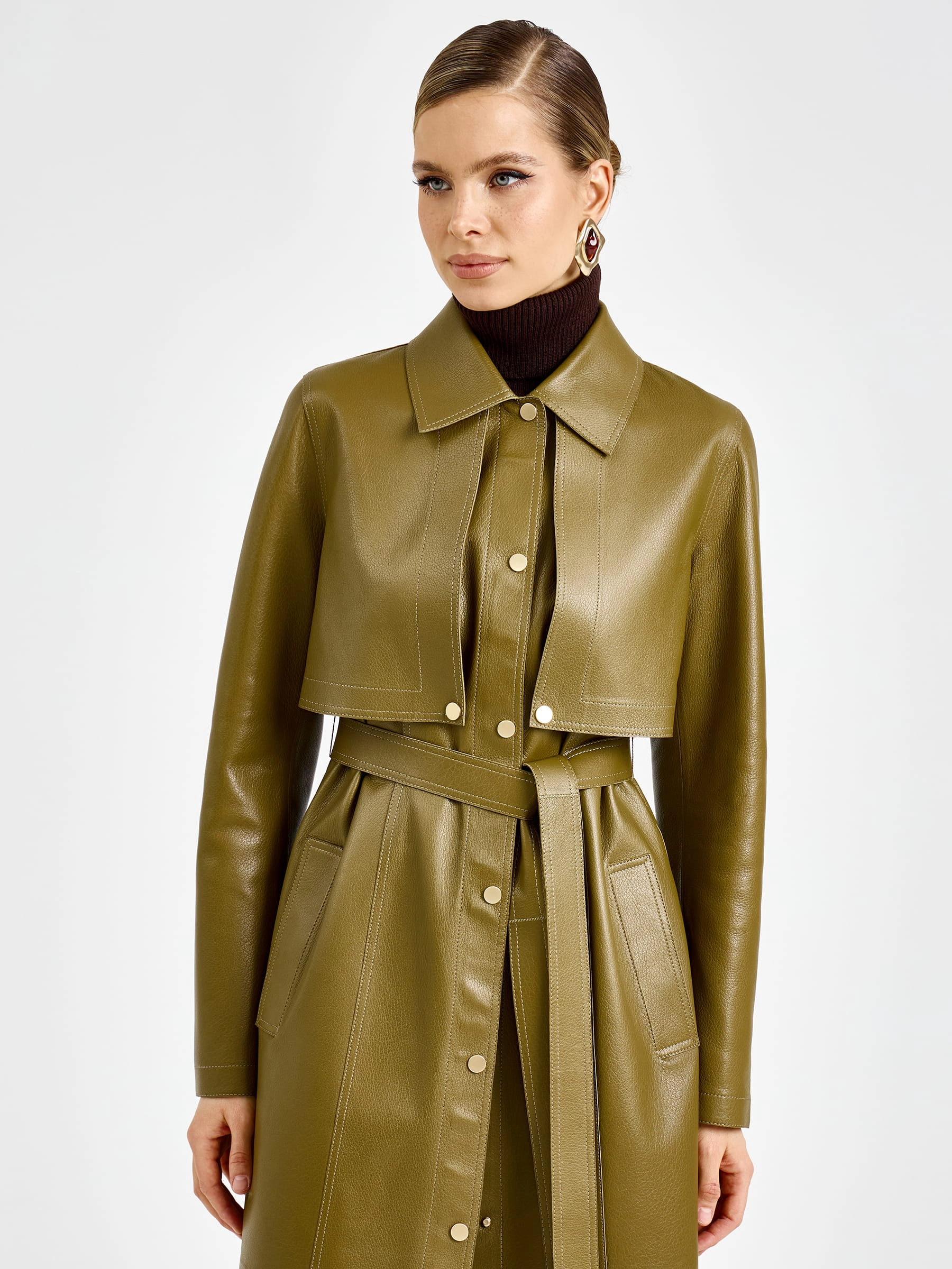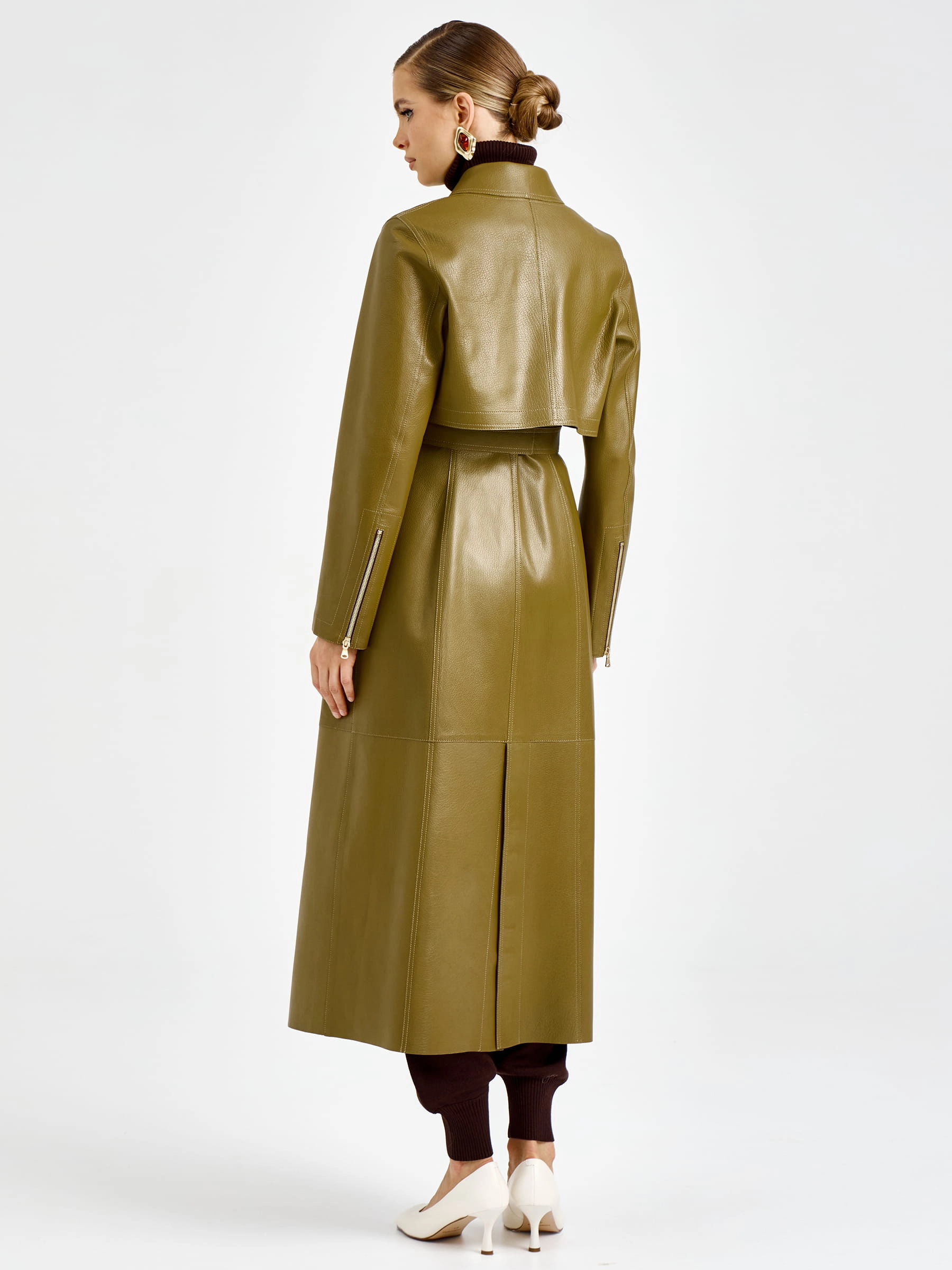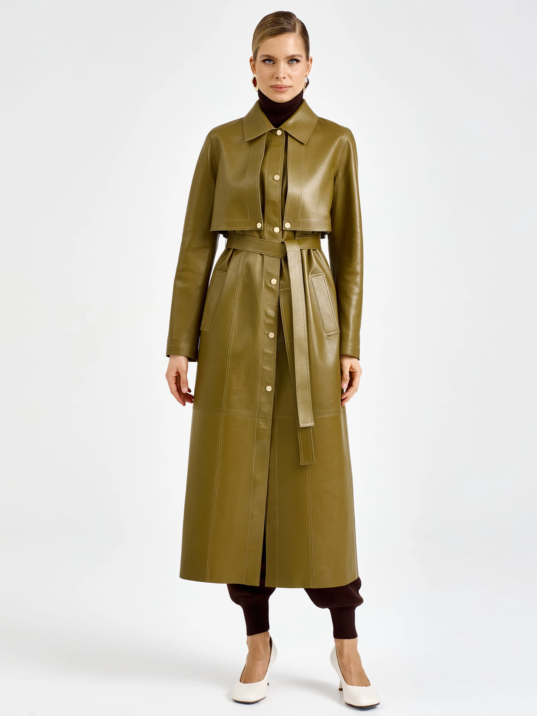 Уникальная модель два в одном длиной 128 см из мягчайшей мелкозернистой кожи премиального качества: съемная отлетная кокетка с рукавами позволяет носить плащ как элегантную длинную жилетку. Прямой силуэт с отложным воротником, удобные врезные карманы и высокая шлица сзади обеспечивают безупречную посадку и свободу движений. Длинный пояс подчеркивает талию, а молнии на рукавах добавляют дерзкий акцент. Застежка на кнопки гарантирует надежную фиксацию. Отсутствие подкладки демонстрирует тончайшую выработку кожи — истинный признак премиум-класса. Совет стилиста: носите с кожаными брюками и ботфортами для дерзкого образа или с платьем-миди и ботильонами для романтичного выхода — этот трансформируемый плащ станет вашей инвестицией в стиль и подарит безграничный простор для экспериментов.