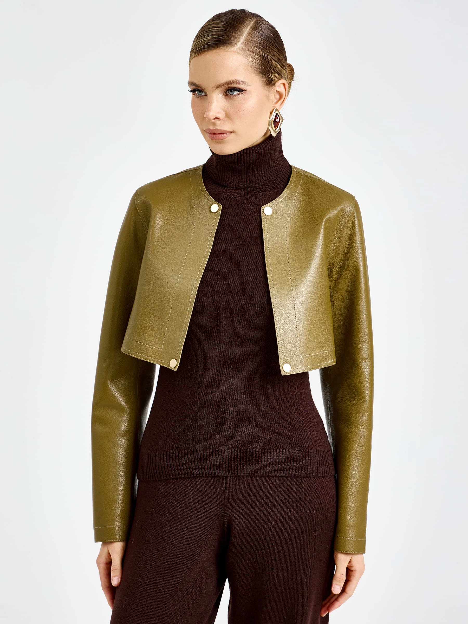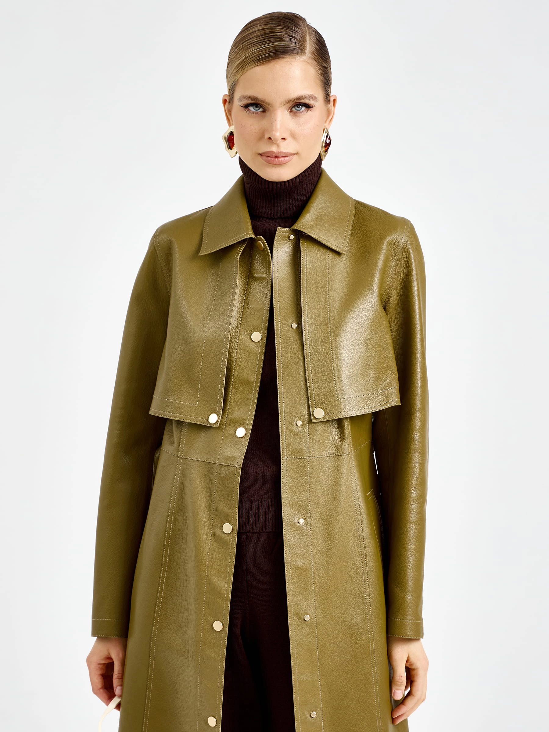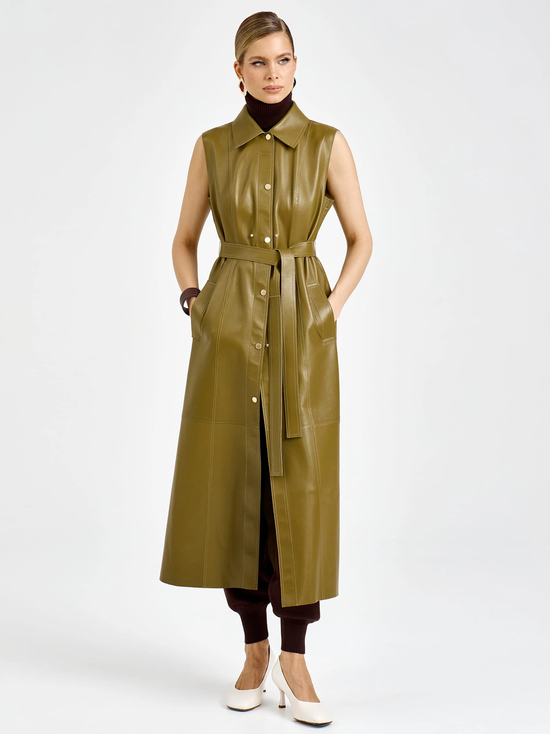 Уникальная модель два в одном длиной 128 см из мягчайшей мелкозернистой кожи премиального качества: съемная отлетная кокетка с рукавами позволяет носить плащ как элегантную длинную жилетку. Прямой силуэт с отложным воротником, удобные врезные карманы и высокая шлица сзади обеспечивают безупречную посадку и свободу движений. Длинный пояс подчеркивает талию, а молнии на рукавах добавляют дерзкий акцент. Застежка на кнопки гарантирует надежную фиксацию. Отсутствие подкладки демонстрирует тончайшую выработку кожи — истинный признак премиум-класса. Совет стилиста: носите с кожаными брюками и ботфортами для дерзкого образа или с платьем-миди и ботильонами для романтичного выхода — этот трансформируемый плащ станет вашей инвестицией в стиль и подарит безграничный простор для экспериментов.