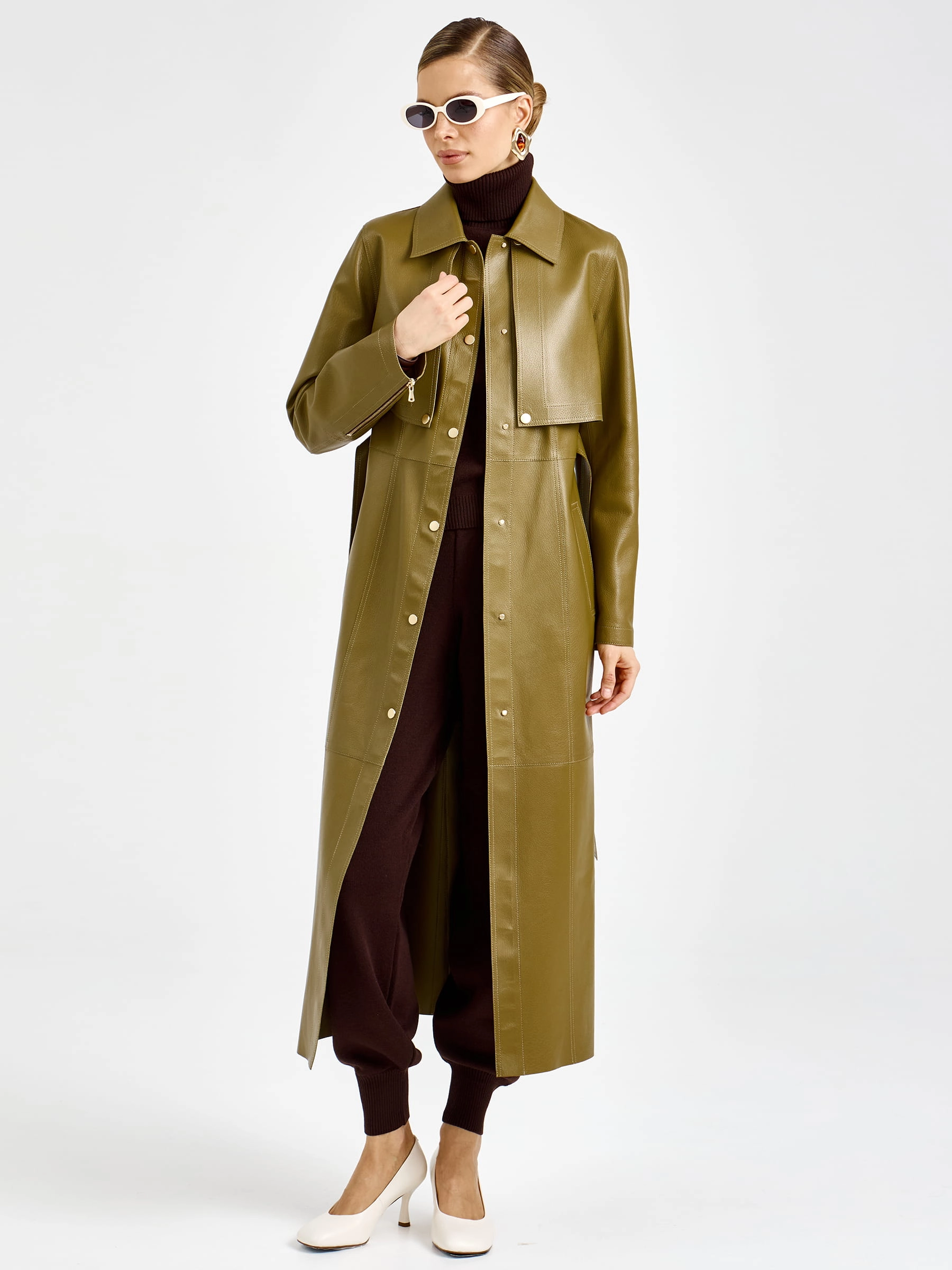Товар зеленый женский длинный кожаный плащ премиум класса 3103, размер 44, артикул 92130 выполнен из натуральной кожи с застежкой кнопки. Рассчитан на сезон: весна-лето. Длина изделия 128 см, силуэт прямой.