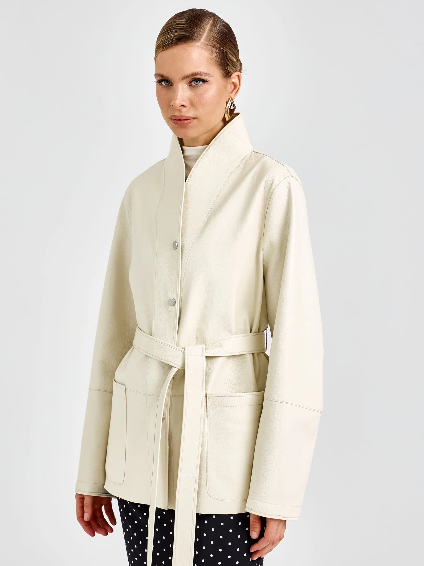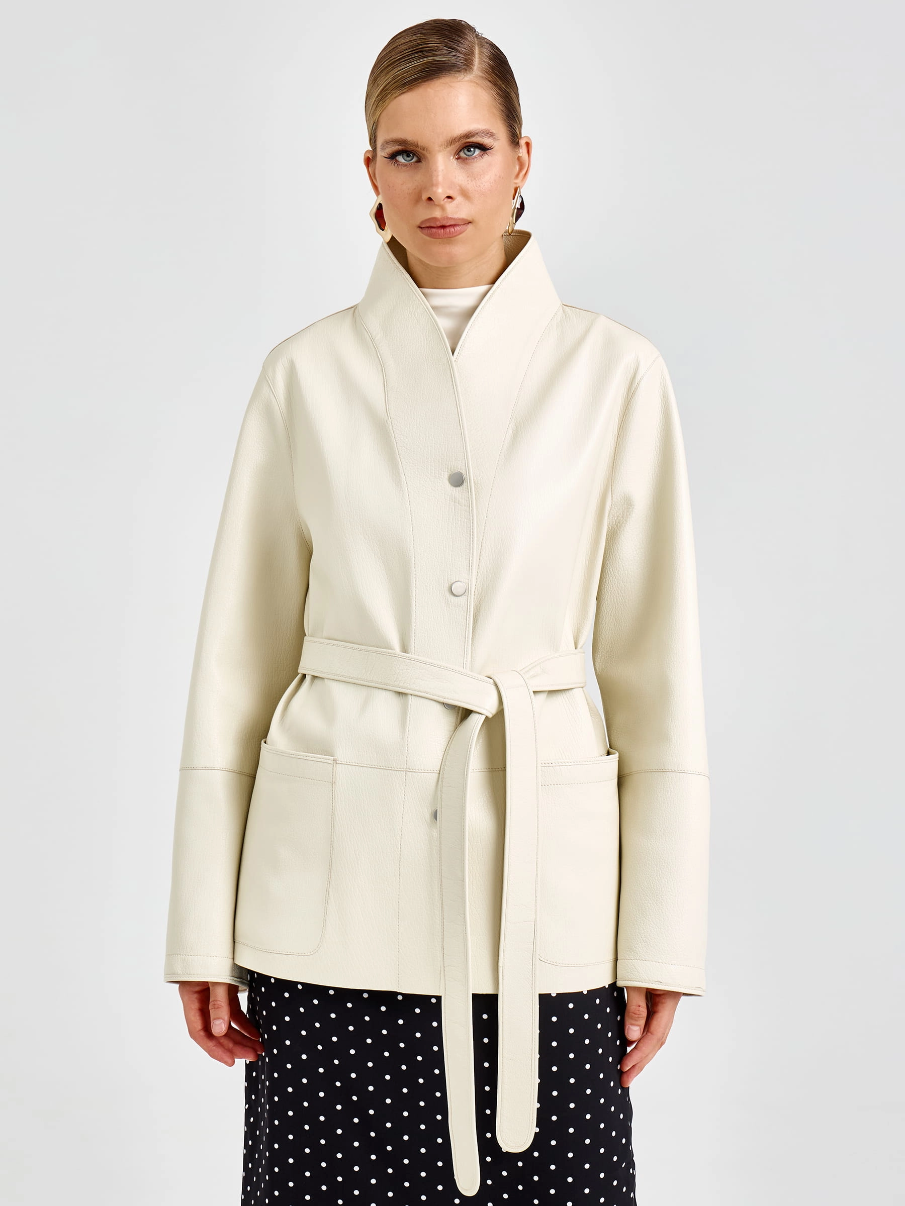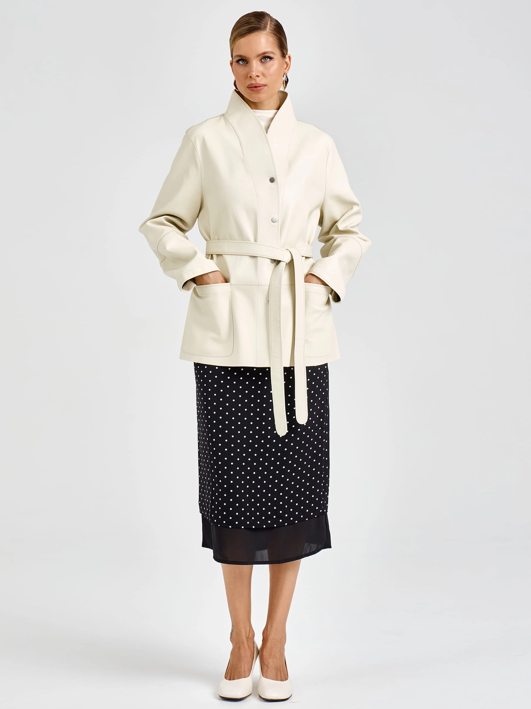 Роскошная модель длиной 70 см из мягкой кожи премиум-класса прямого кроя: благородный шалевидный воротник и боковые накладные карманы создают элегантный силуэт, а длинный пояс-лента позволяет менять посадку по фигуре. Застёжка на кнопках добавляет практичности и лаконичности. Совет стилиста: носите с кожаными брюками и сапогами-ботфортами для вечернего образа или с джинсами-скинни и объёмным свитером крупной вязки для повседневного уюта — эта куртка станет вашим фаворитом благодаря универсальности и безупречному качеству кожи