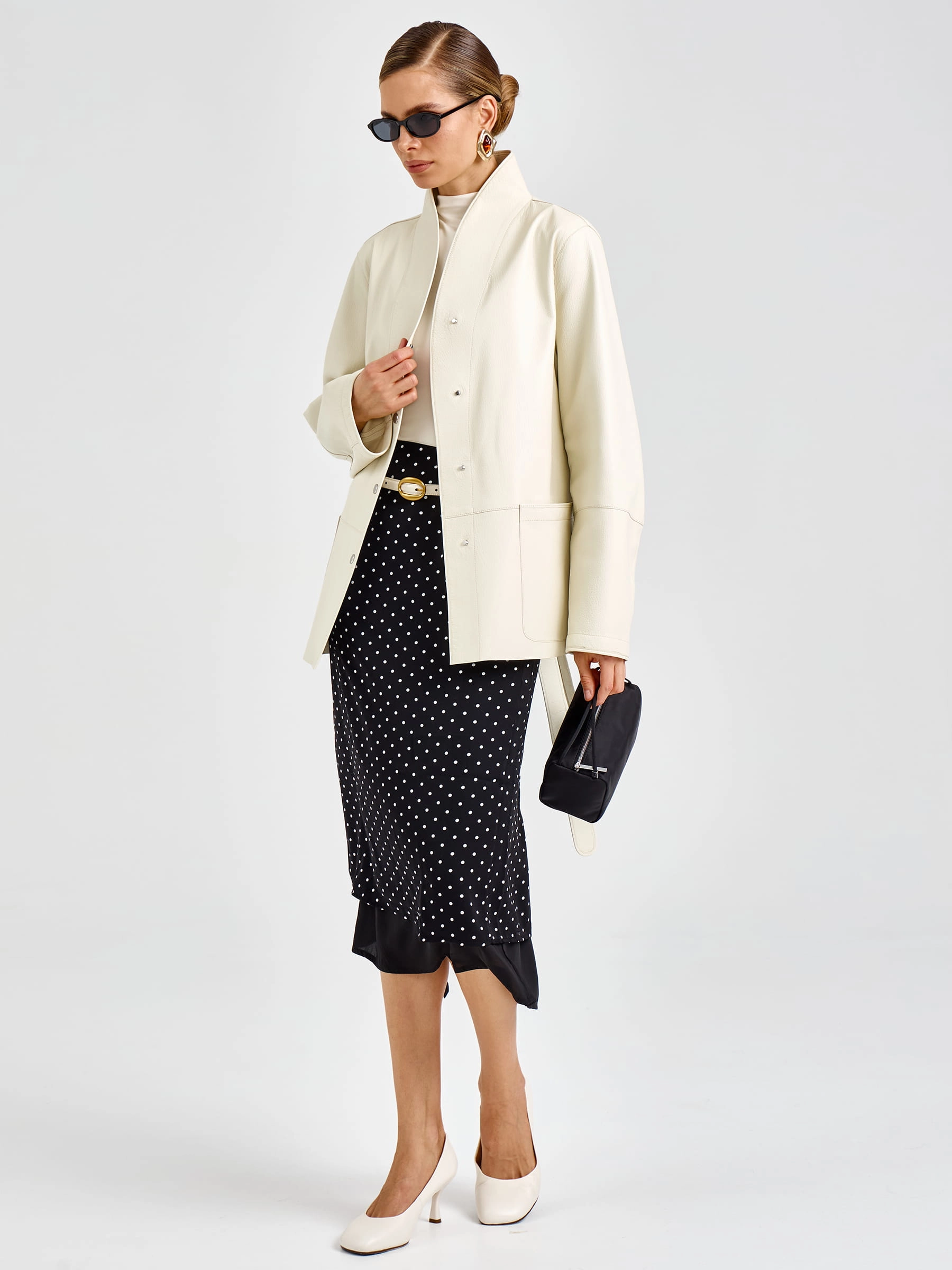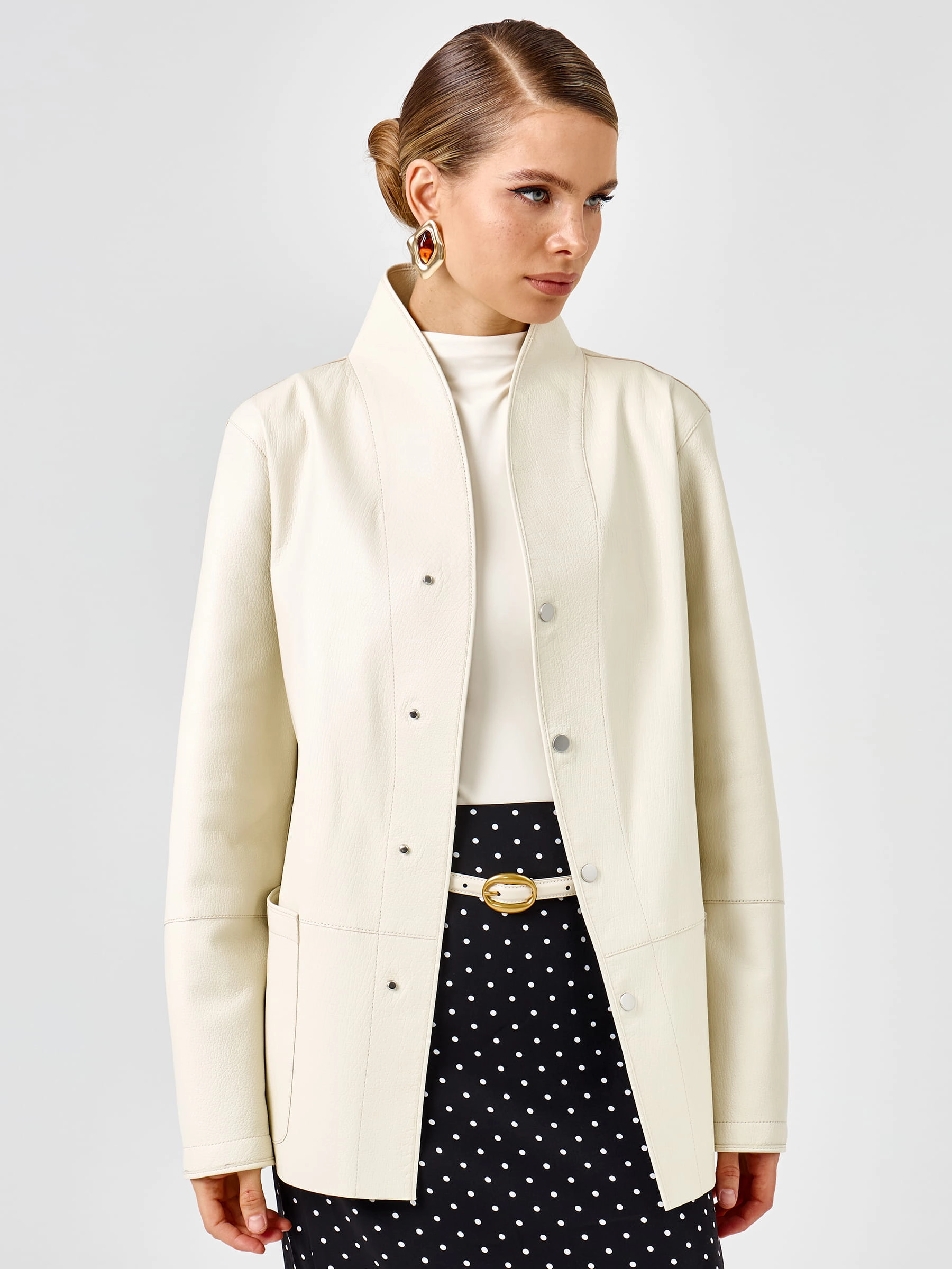 Товар женская белая кожаная куртка премиум класса 3105, размер 46, артикул 92150 выполнен из натуральной кожи с застежкой кнопки. Рассчитан на сезон: весна-лето. Длина изделия 70 см, силуэт прямой.