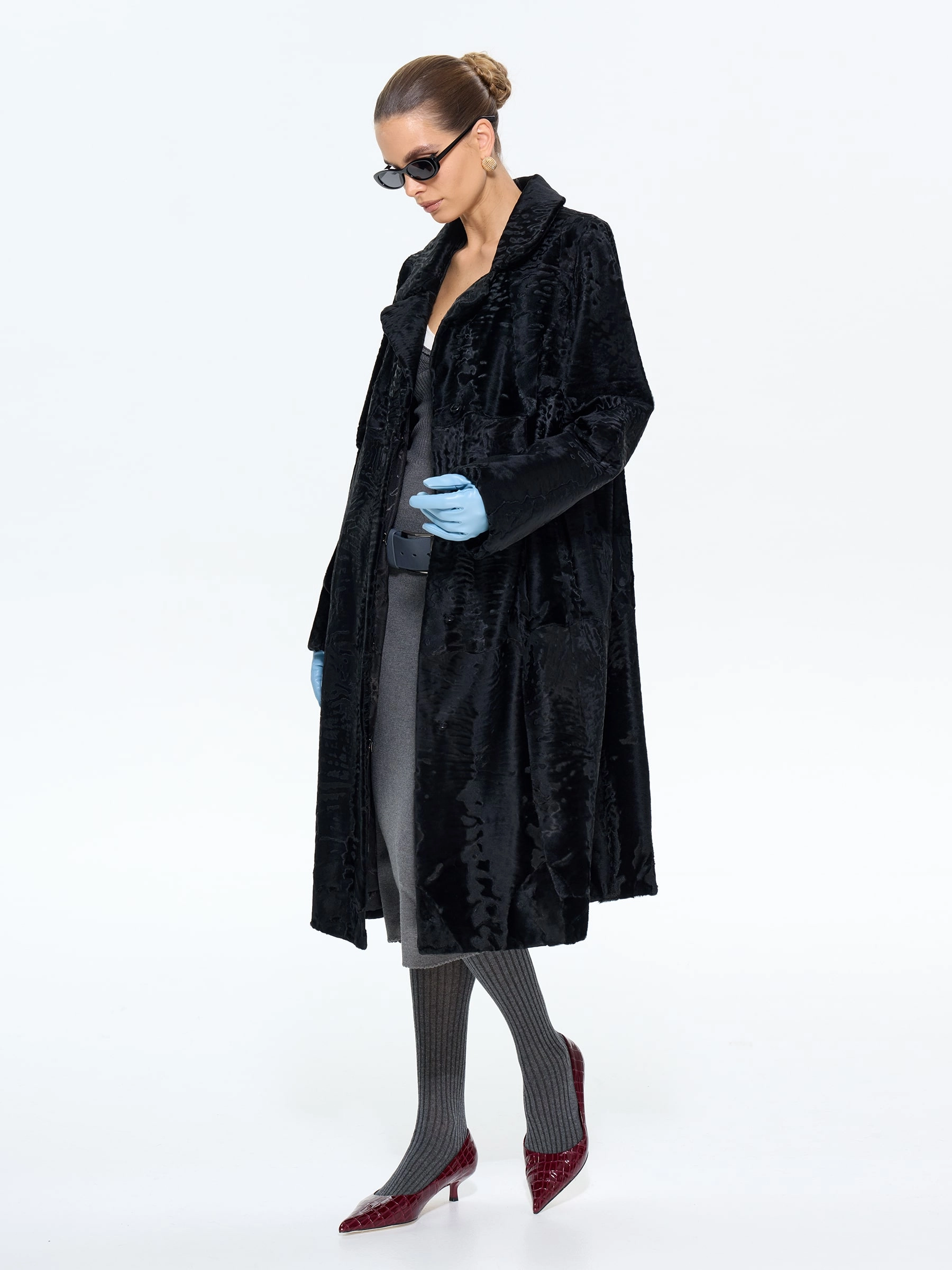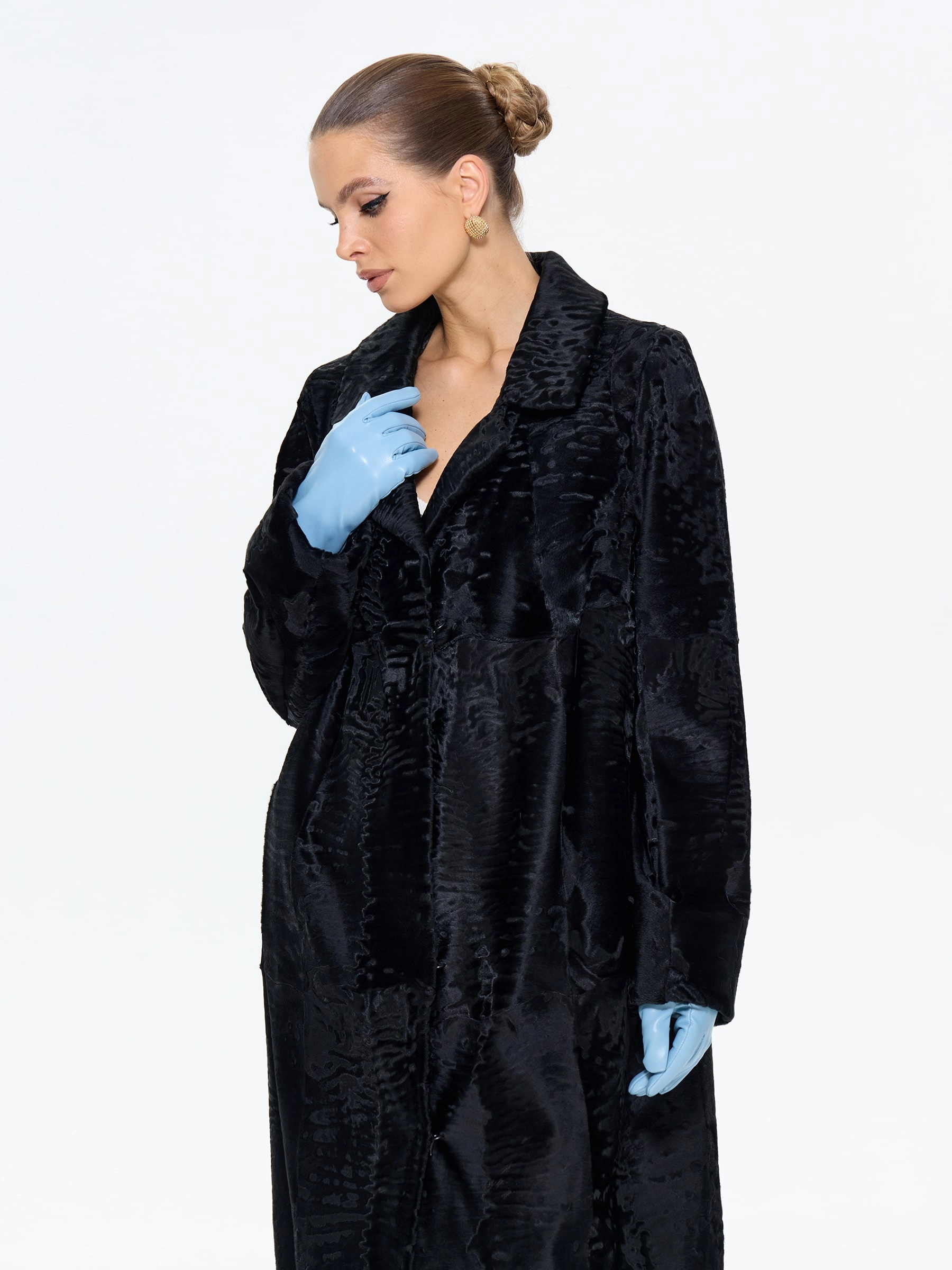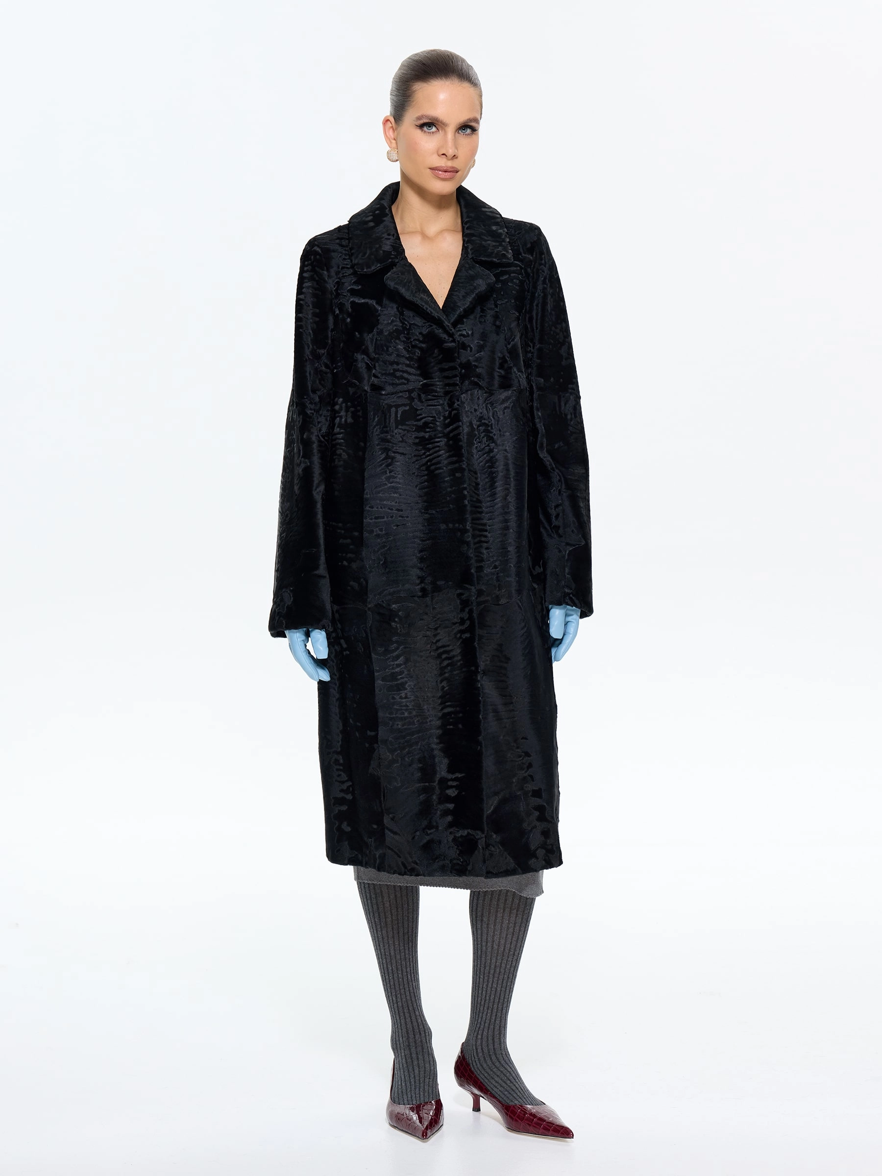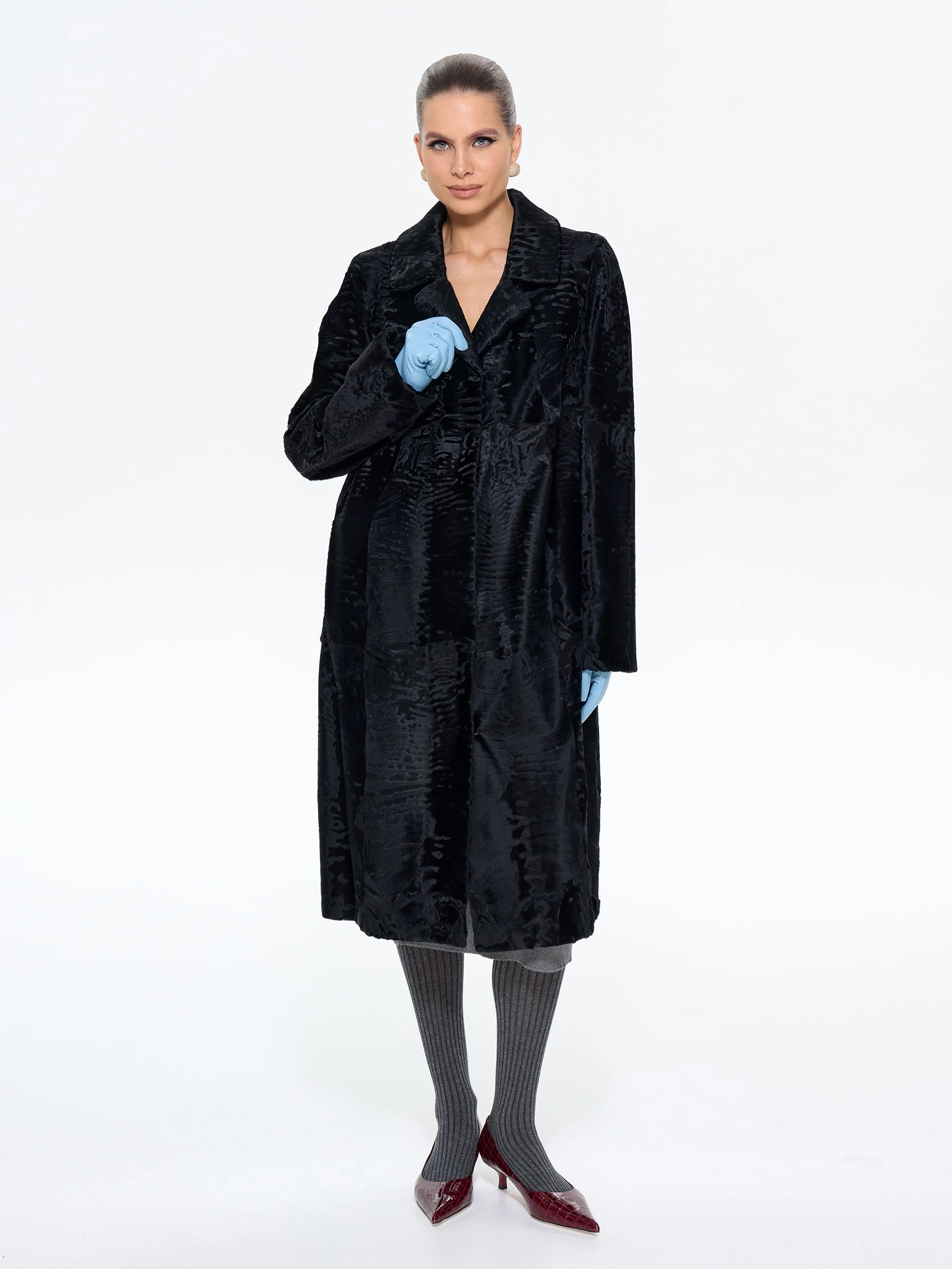Элегантная длинная шуба из меха каракульчи премиум-класса в глубоком черном цвете с выразительным английским воротником. Модель прямого силуэта длиной 108 см создает вытянутый стройный силуэт, подчеркивая аристократическую элегантность. Стилисты рекомендуют носить эту шубу с кожаными перчатками и сапогами по колено, дополнив структурированной сумкой, или с платьем-футляром и жемчужными серьгами для вечернего выхода. Эта модель — воплощение вечной классики и неповторимого шарма, который подчеркнет ваш утонченный вкус в любом сезоне.