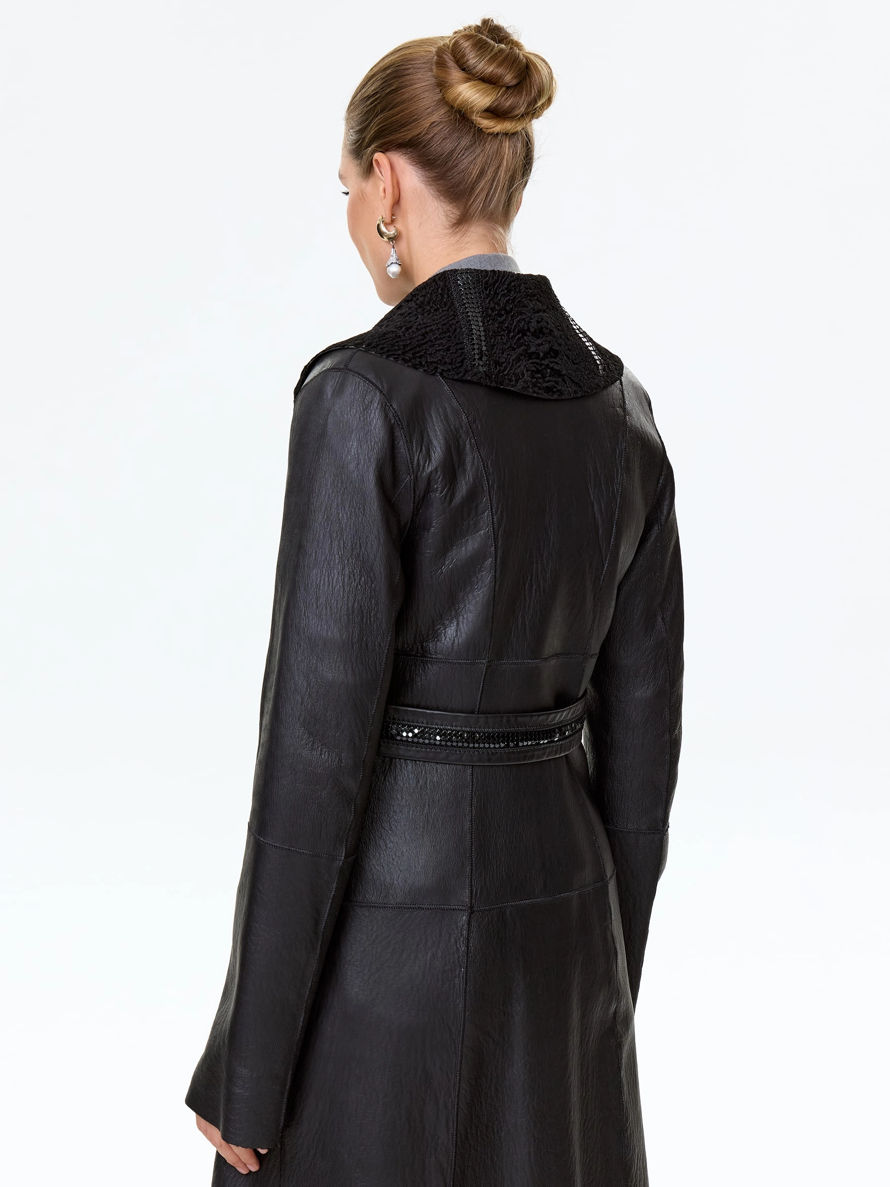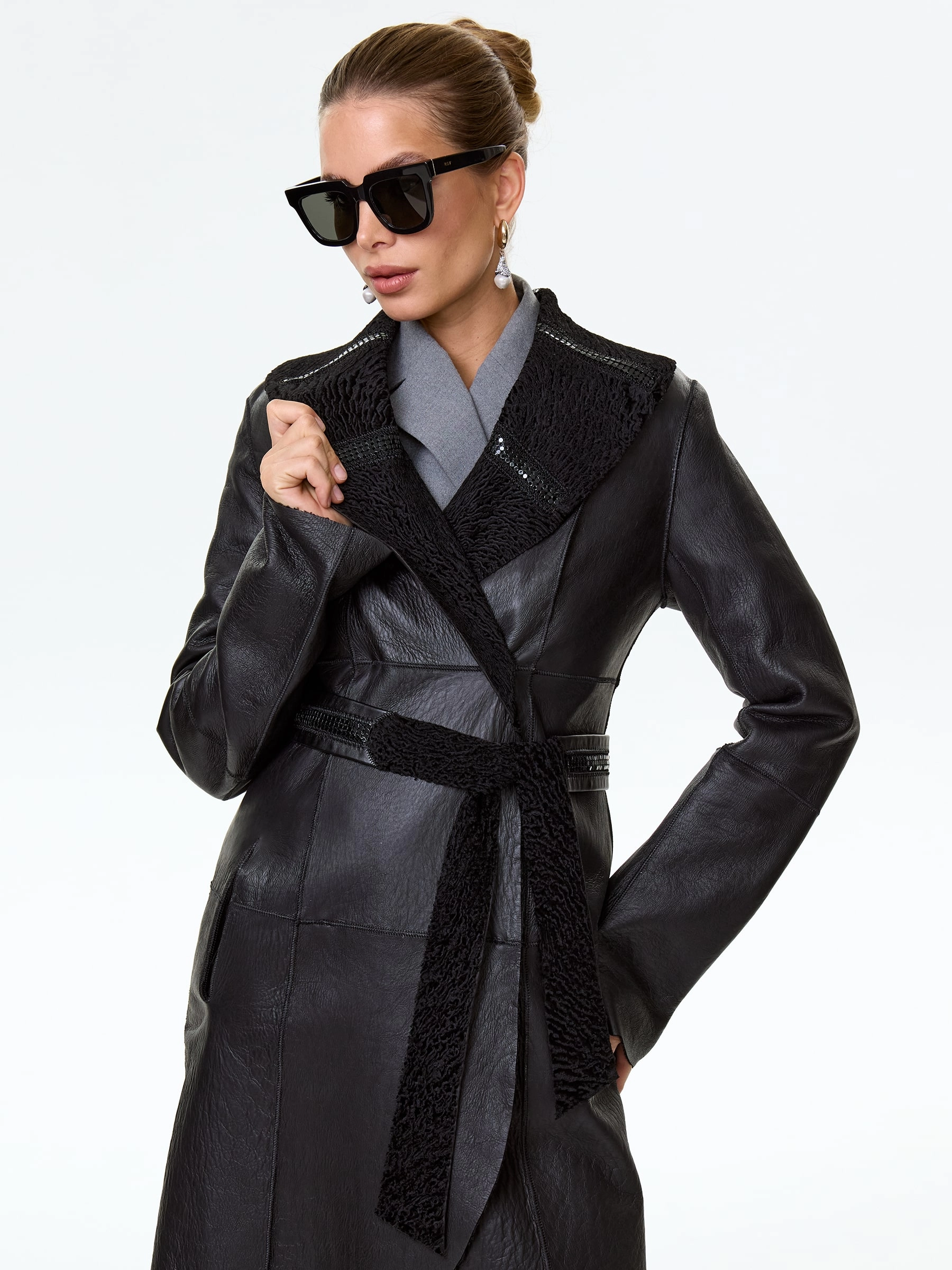 Для создания двухсторонней дубленки мастера использовали нежнейший мех новозеландского ягненка, близкого по восприятию к каракульче. Элегантное изделие с шалевидным воротником можно носить как гладкой, так и фактурной стороной наружу. Модель имеет два врезных кармана , застегивается внутренними кнопками.